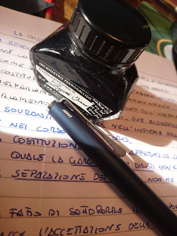 Un qualsiasi inchiostro per stilografica (Pelikan, Parker, Waterman sono quelli che si trovano più facilmente), ci sono delle boccette anche della Lamy stessa. Dalla foto non si capisce di che marca è l'inchiostro che hai usato e soprattutto non si capisce se è adatto alle stilografiche. In ogni ca...