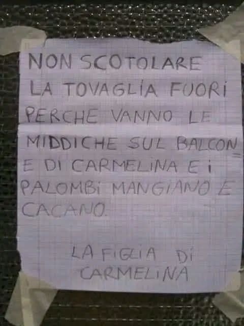 Trovata su FB. Traduzione: non scuotere la tovaglia fuori dal tuo balcone, perchè le briciole di pane (nella fattispecie la mollica) finiscono sul balcone di Carmelina ed i piccioni banchettano e poi defecano. Firmato: la figlia di Carmelina
