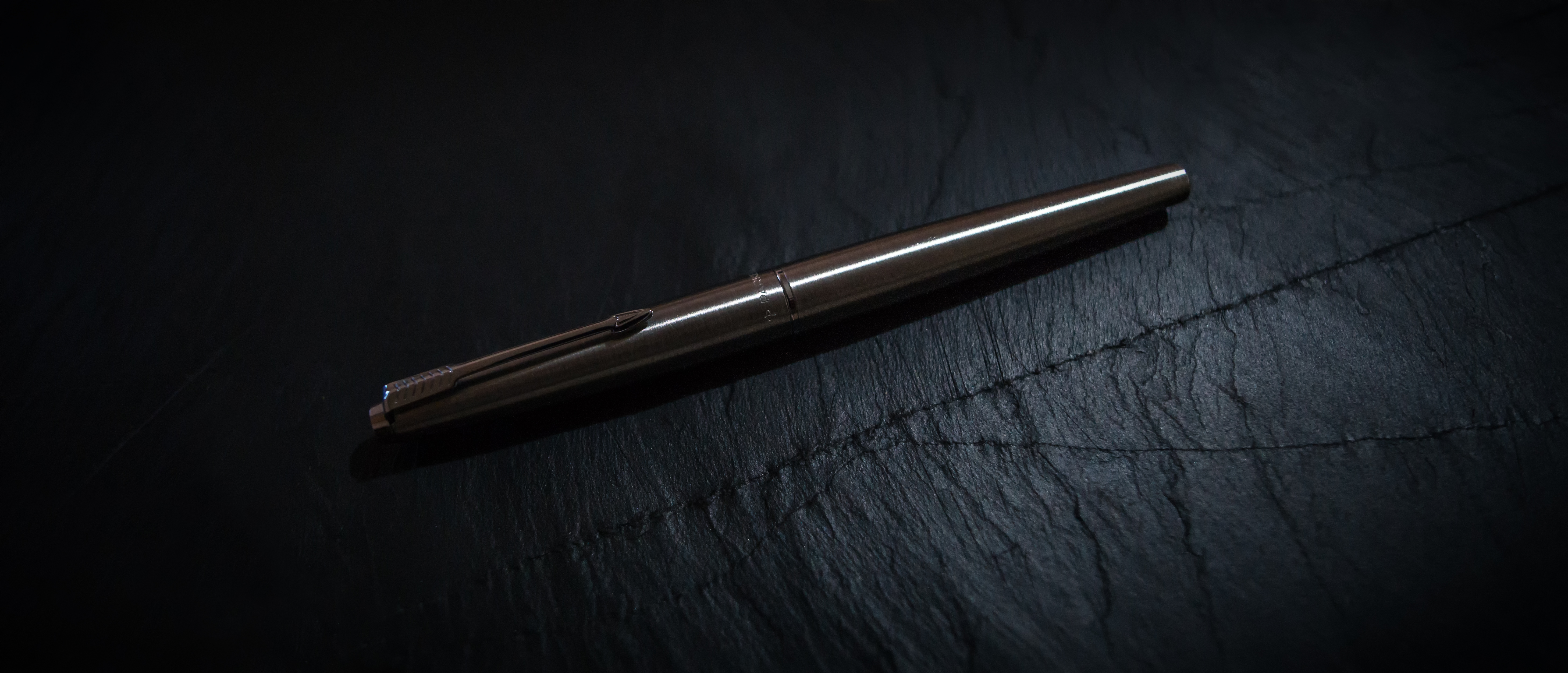 Ciao a tutti, ieri un un momento di libertà ho realizzato questi due scatti della mia Parker 45 Flighter. La penna è poggiata su una base di ardesia, la foto è stata poi aggiustata in post produzione. Volutamente scura, per evidenziare al meglio le linee ed il riflesso dell'acciaio. Spero vi piaccia...