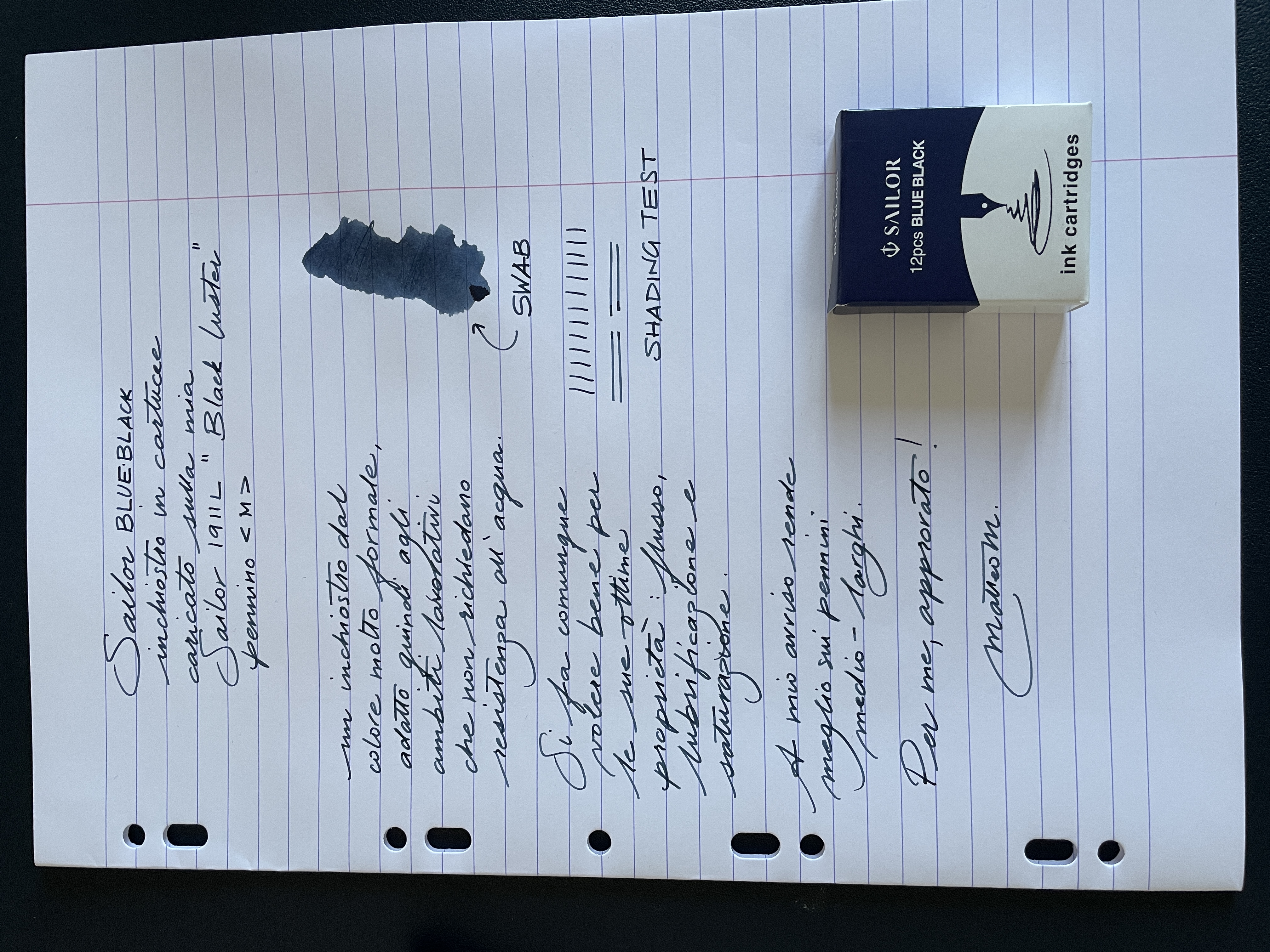 Grazie mille Matteo. Questo è un inchiostro che mi manca e che trovo molto bello nella sua noiosità :D . Domanda: sui pennini fini di Sailor rimane ancora leggibile come il Blue Ink base ? Un saluto Non l’ho ancora provato su un fine Sailor. È un poco più slavato del Sailor blu base secondo me, ma ...