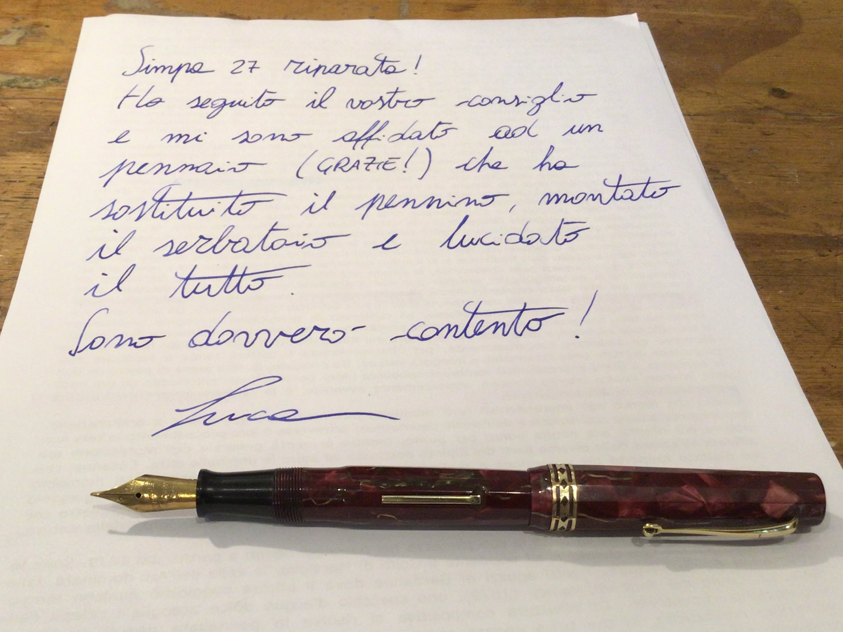 Il pennino originale non era recuperabile in qualche modo ? Il pennino mi è stato restituito. Evidentemente no. :( Che pennino le ha montato? Nell'elenco dei lavori effettuati c'è scritto "Applicato pennino flex anni '30". In effetti è flessibile. veloce come tempi di ripristino. Inviata,...