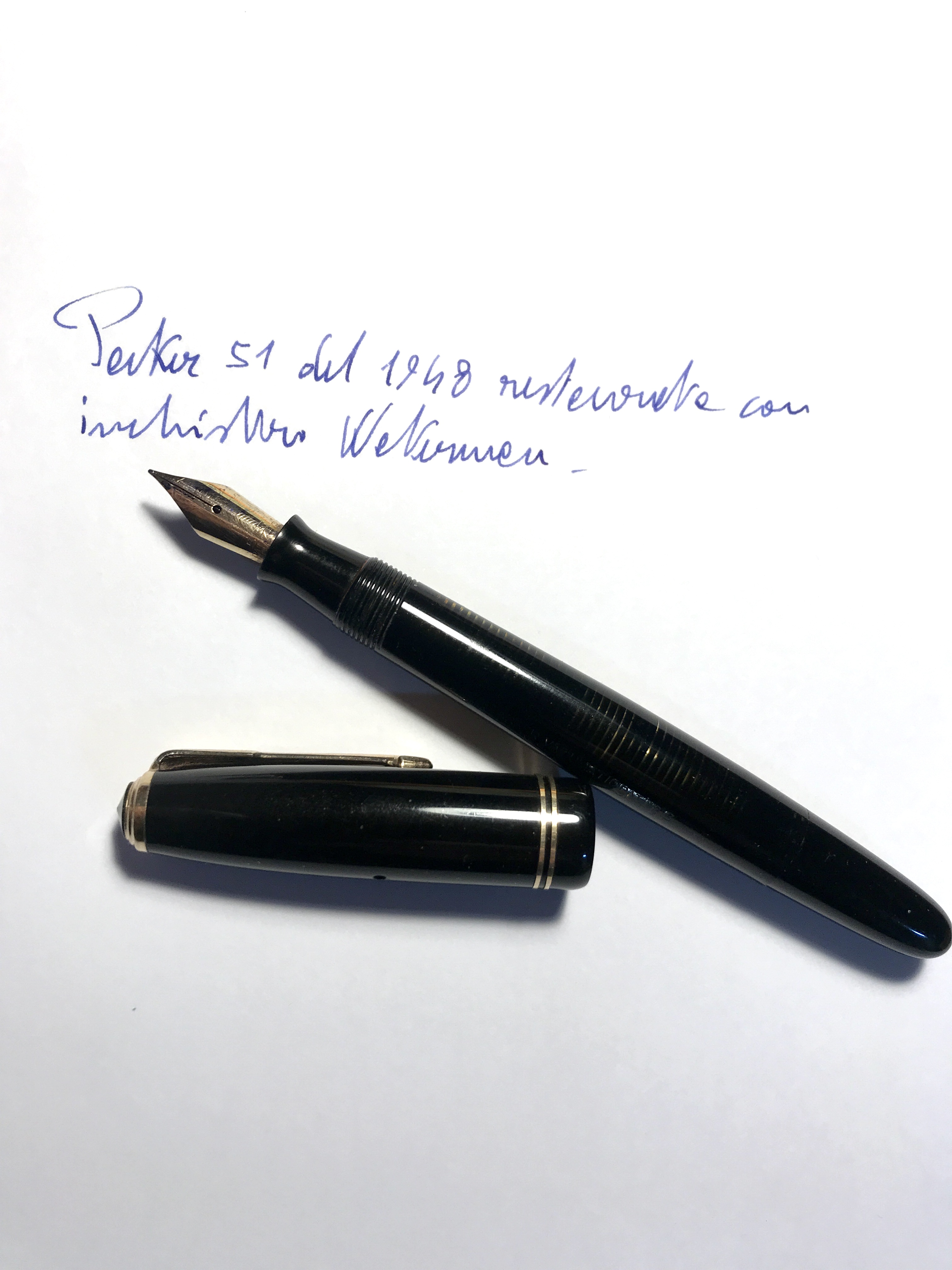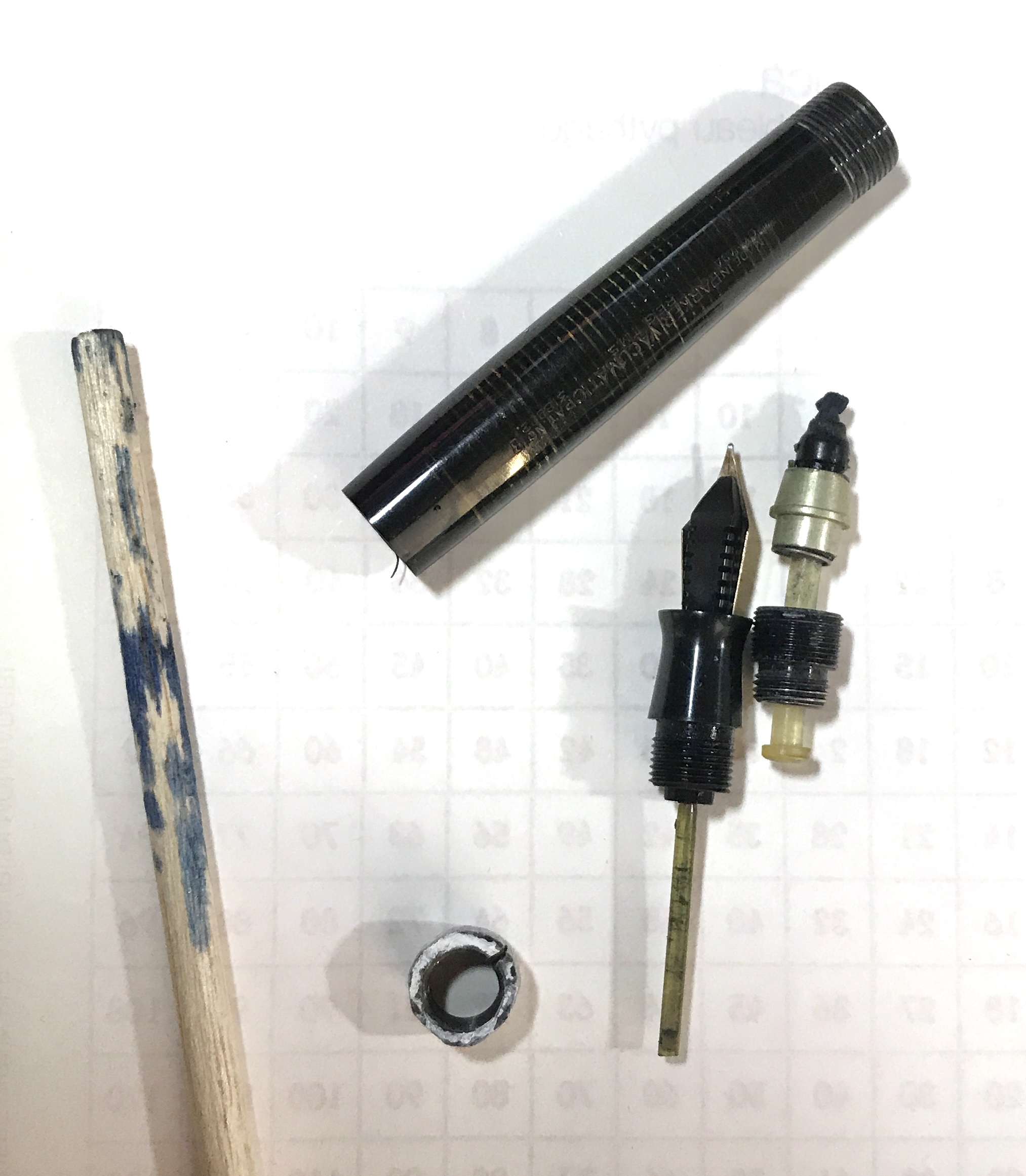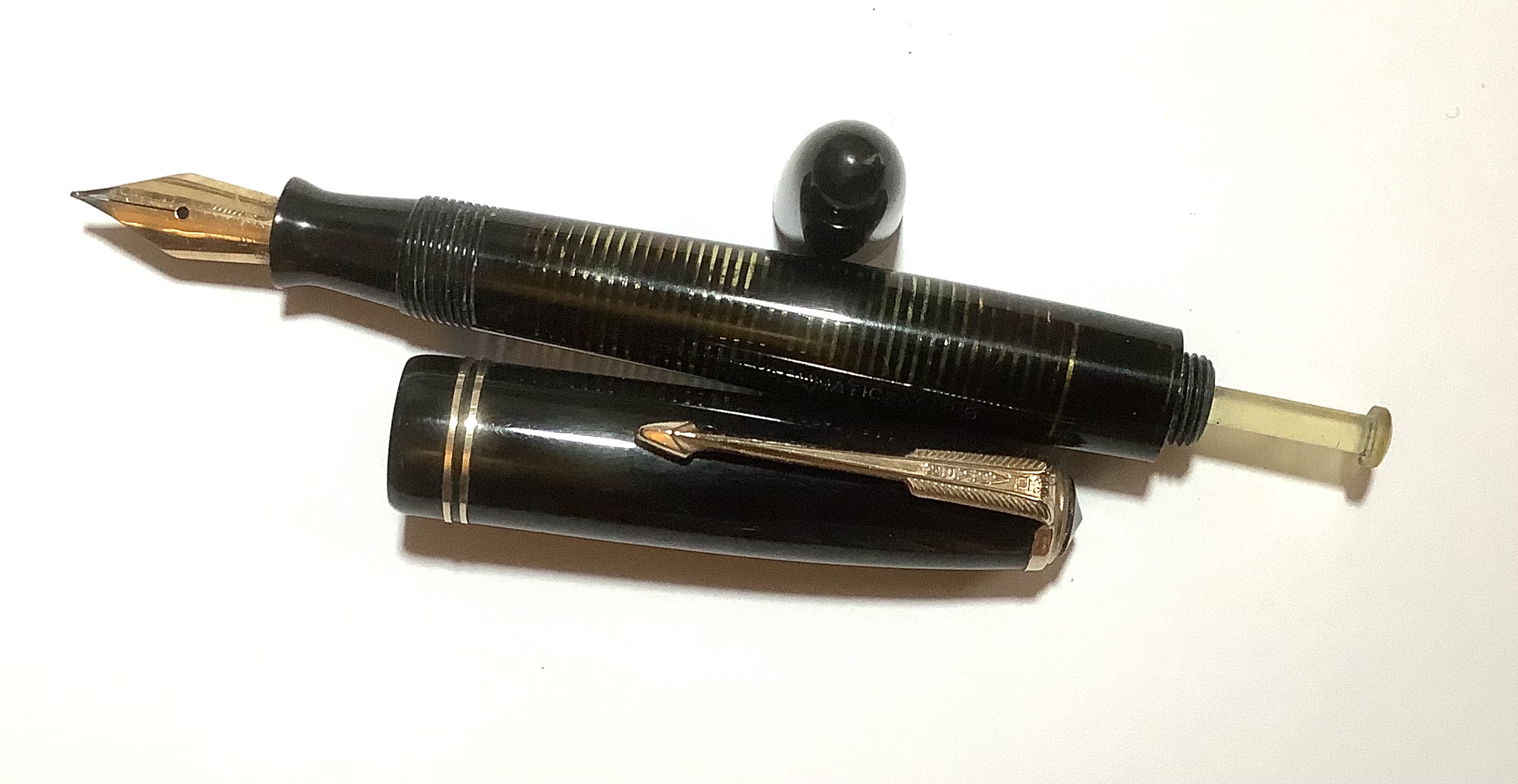 Salve a tutti. Ecco una Parker Vacumatic (made in Canada) presa in un negozio di anticaglie. Ovviamente è necessario sostituire il gommino della pompetta (il cui relitto dovrebbe essere un grumo macchia scura che intravedo controluce a metà serbatoio). Ho letto la tecnica per smontare la pompetta sul wiki, non so se avrò il coraggio di procedere: dado di metallo contro la filettatura mi sembra un po’ rischioso, una pressione eccessiva e si rompe. Se provassi, previo riscaldamento, a svitarlo afferrandolo con le dita o stringendolo fra due gomme come quelle per cancellare? Beh, direte, “prova!” Vabbè, era per avere un incoraggiamento. Già che ci sono: modello e anno? Junior, 1946?
