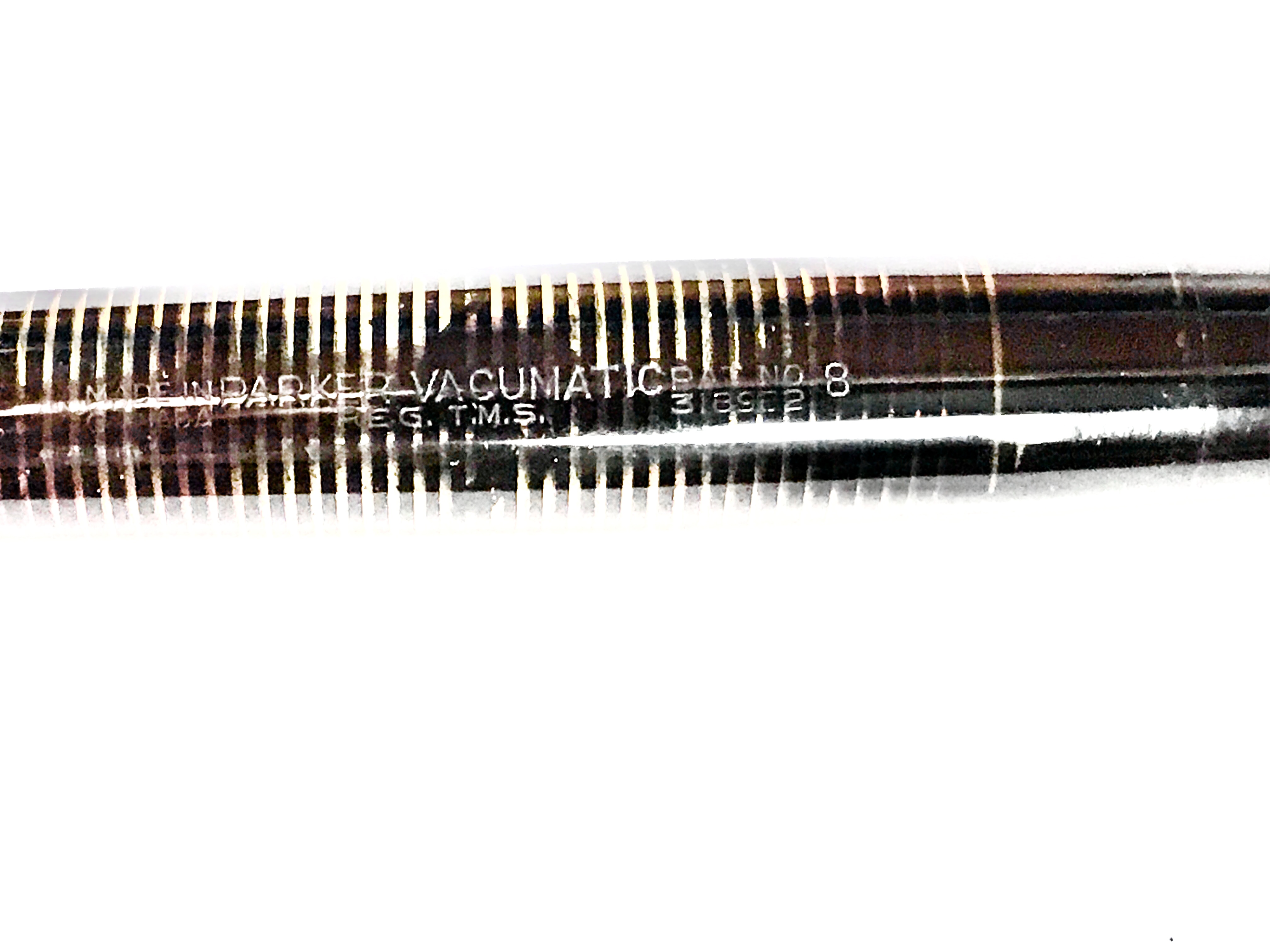 Il sacchetto di ricambio ce l’ho, preso dall’ottimo Ottorino mesi e mesi fa quando dovetti restaurare una 51 Vacumatic. L’incisione sul fusto recita: “Parker Vacumatic Made in Canada Pat.No 8 318982 REG. T.M.S. Metto una foto un po’ modificata per esaltare la scritta