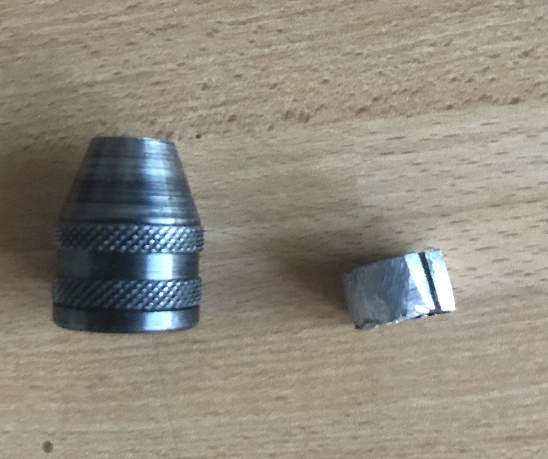 Il dado con la filettatura adatta non si trova. Un negozio specializzato in viti e bulloni dice che forse ci vuole un dado Withworth inusuale introvabile. Anche su internet non l’ho trovato ma ho visto qui dove procurarmelo https://forum.fountainpen.it/viewtopic.php?f=12&t=15770). Ma mentre mi arrovellavo su come fare e se procedere all'ordine di un dadino fuori UE mi è comparsa davanti agli occhi l’immagine di un vecchio mandrino rotto per trapanino che avevo da parte. Ho provato la filettatura sulla penna e voilá! Matrimonio perfetto! Un paio di orette di seghetto e lima a ferro (pensando al conte di Montecristo) ed ecco in foto il risultato, il prima e il dopo. Magari fa comodo saperlo a qualcun altro che avesse il mio stesso problema.
