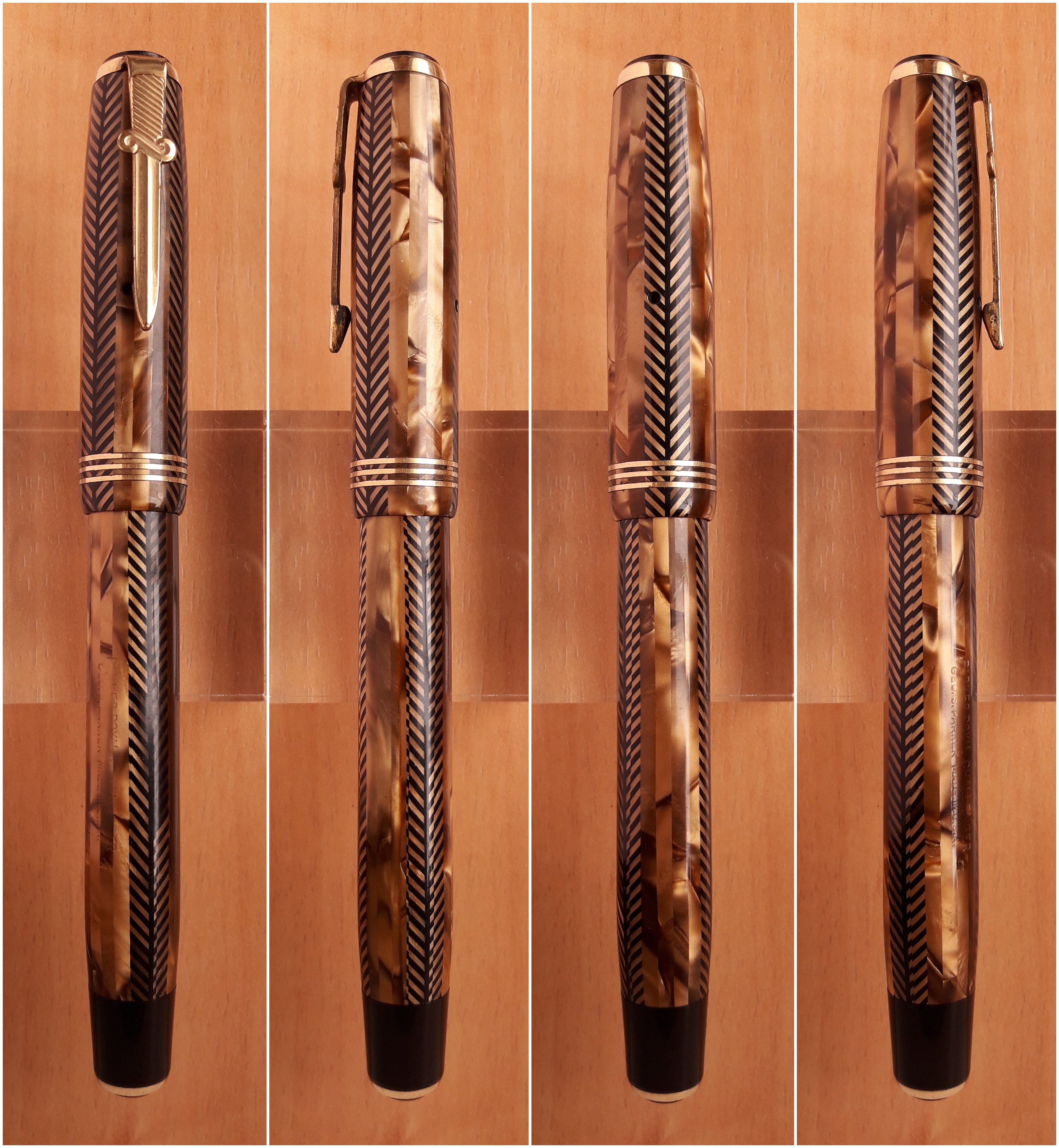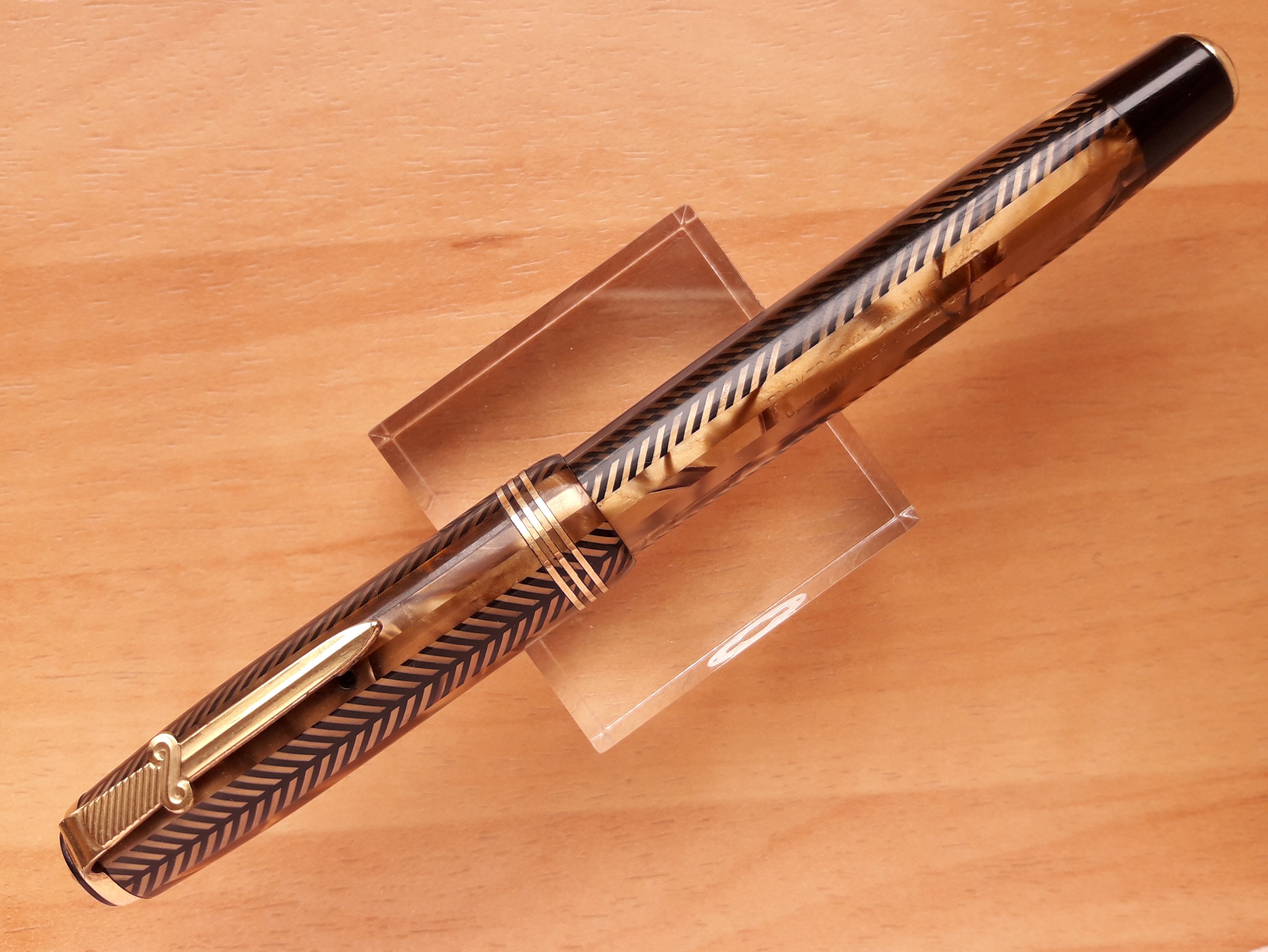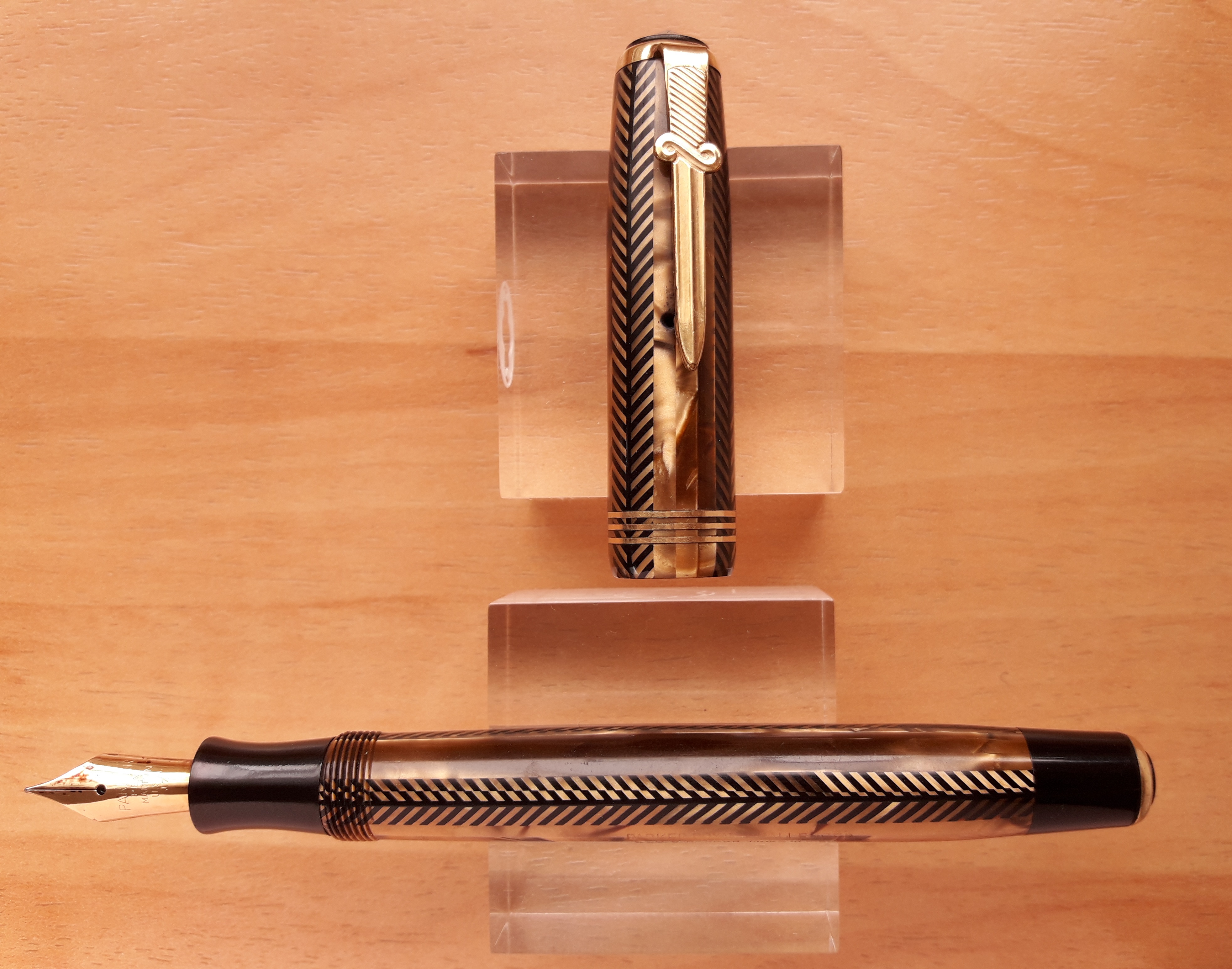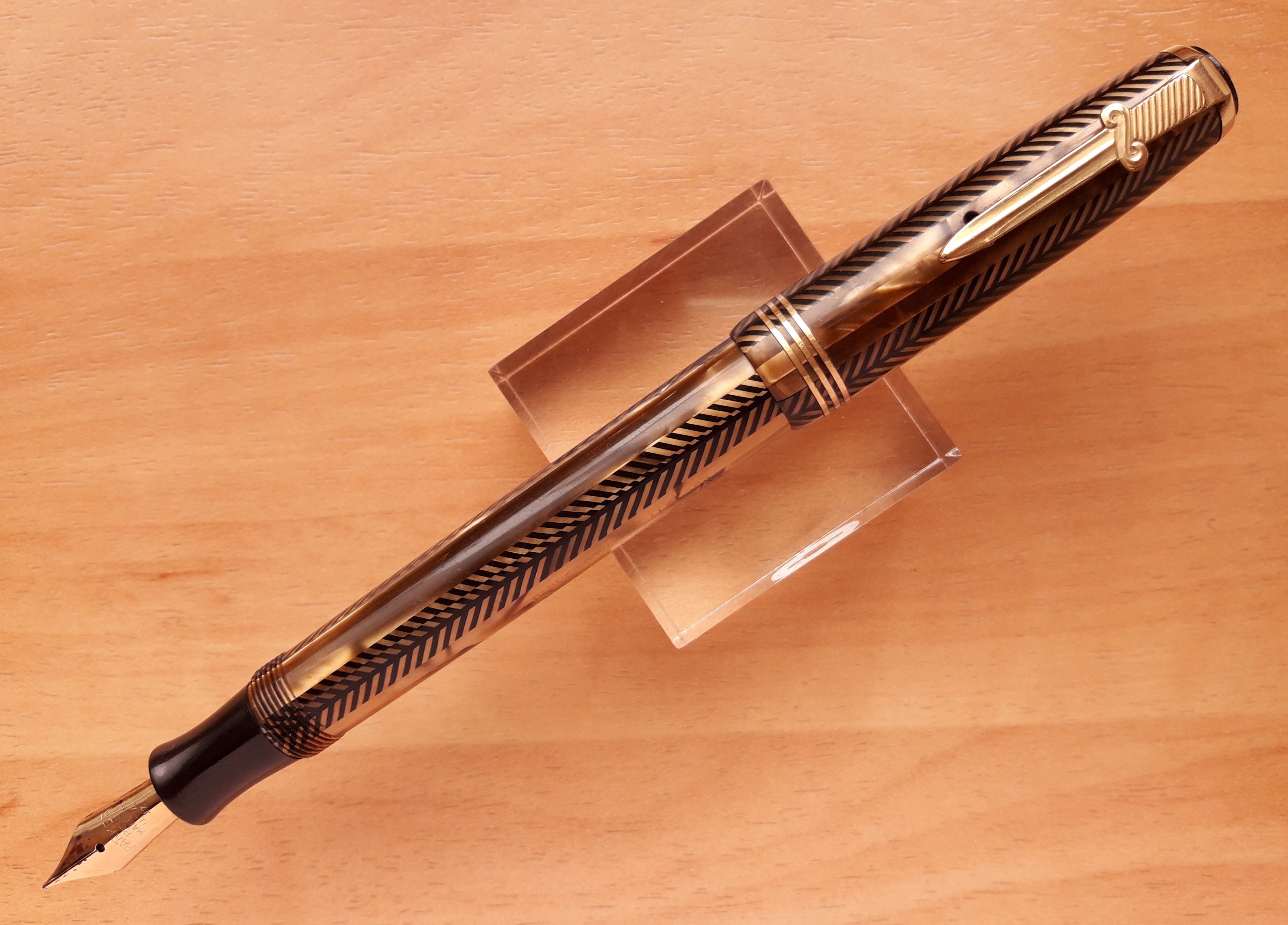PARKER ROYAL CHALLENGER Standard (misura grande) in celluloide marrone perlato, parti metalliche a vista laminate oro, pennino Parker in oro 14 carati, caricamento a pulsante di fondo, produzione U.S.A. anno 1937.