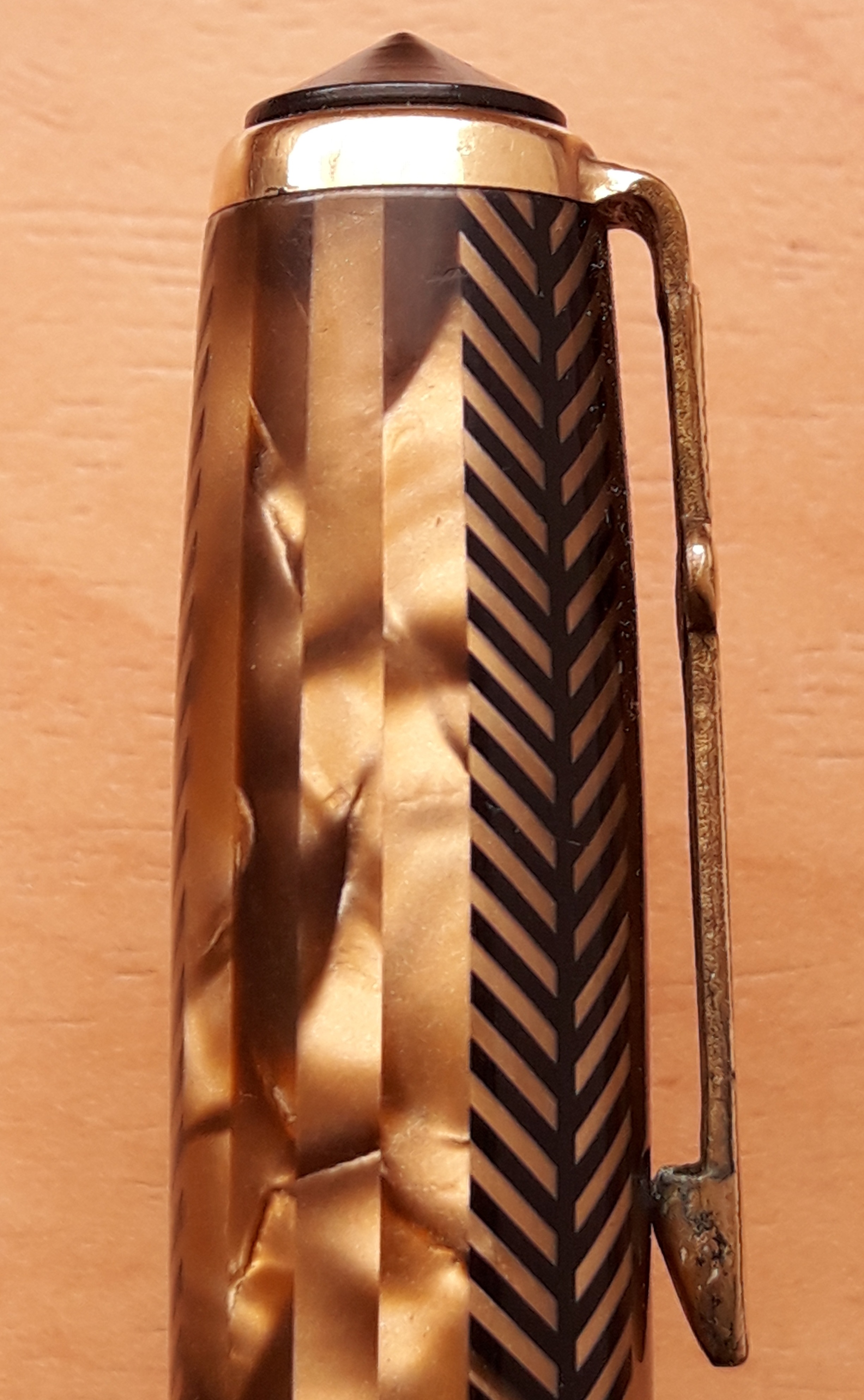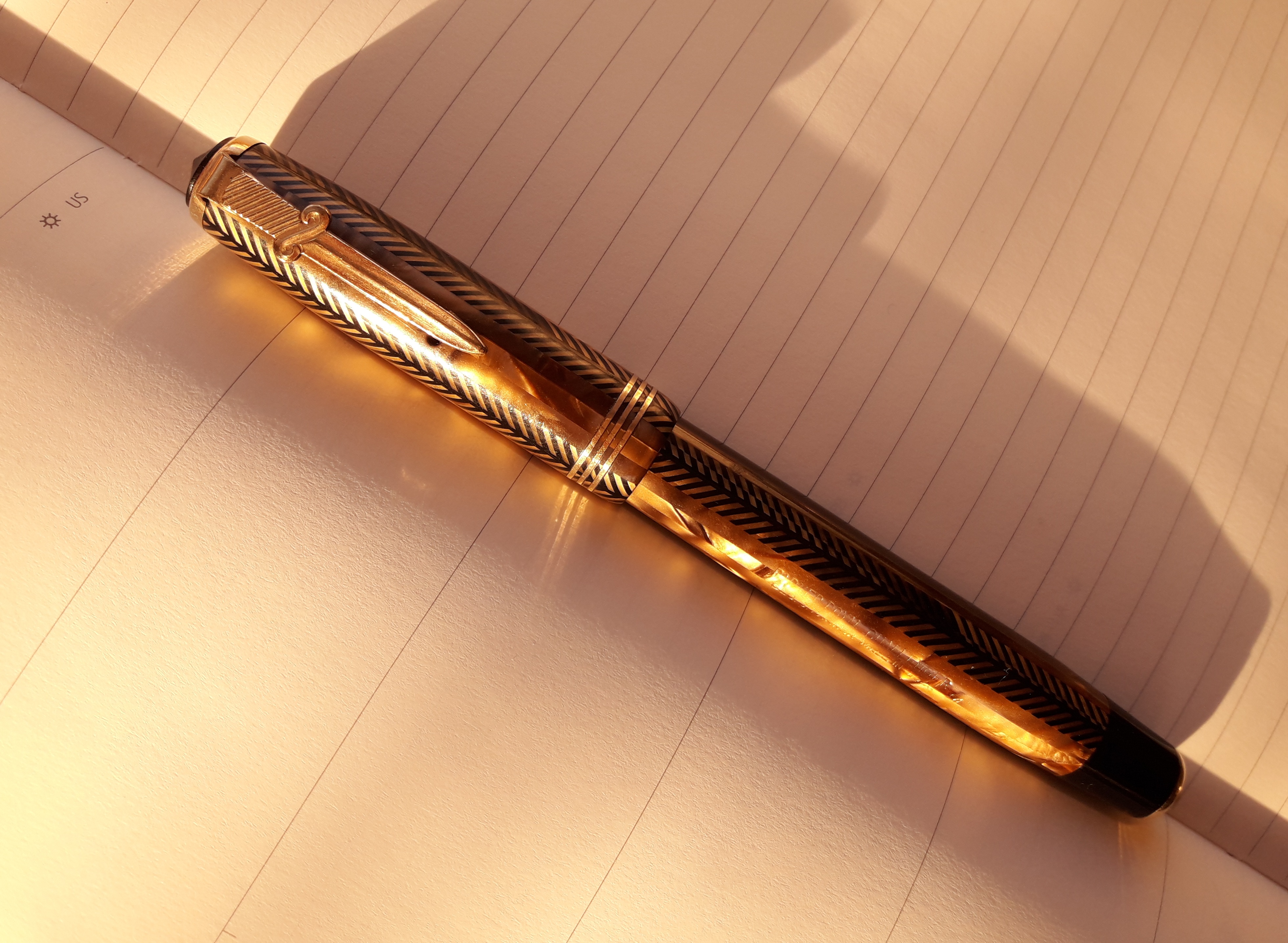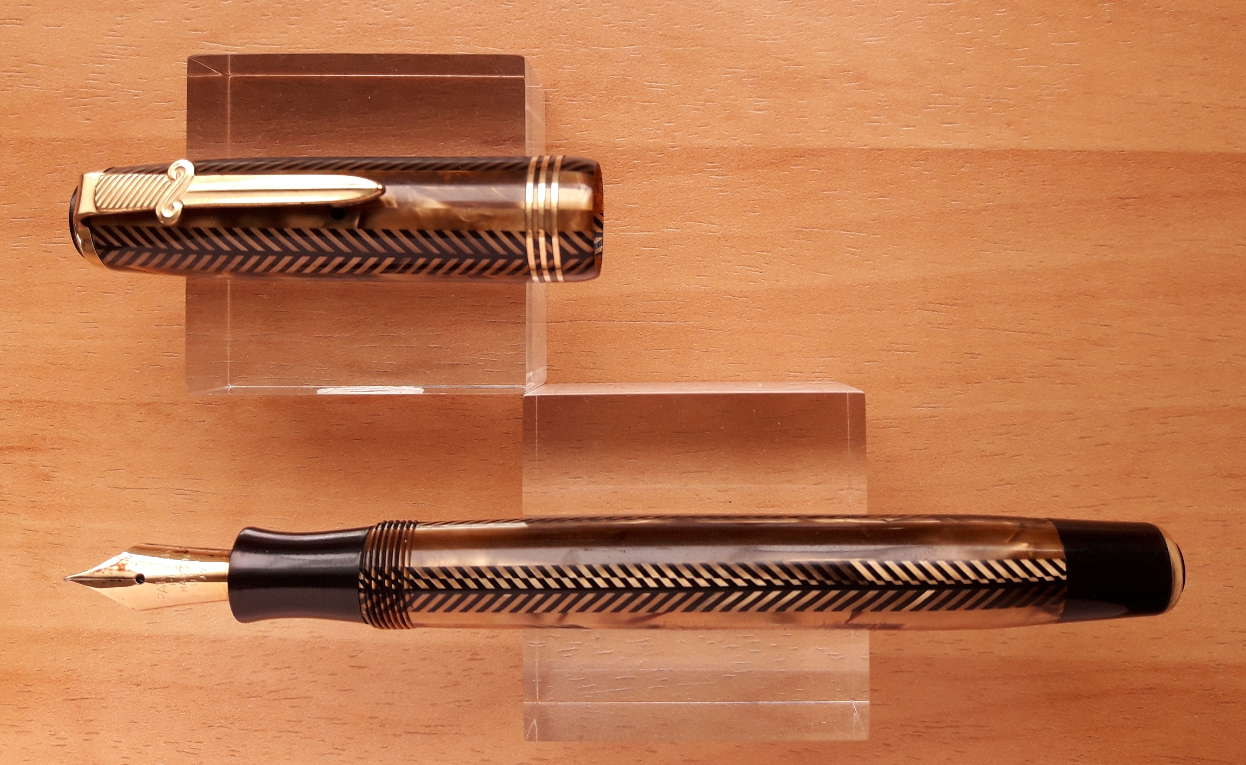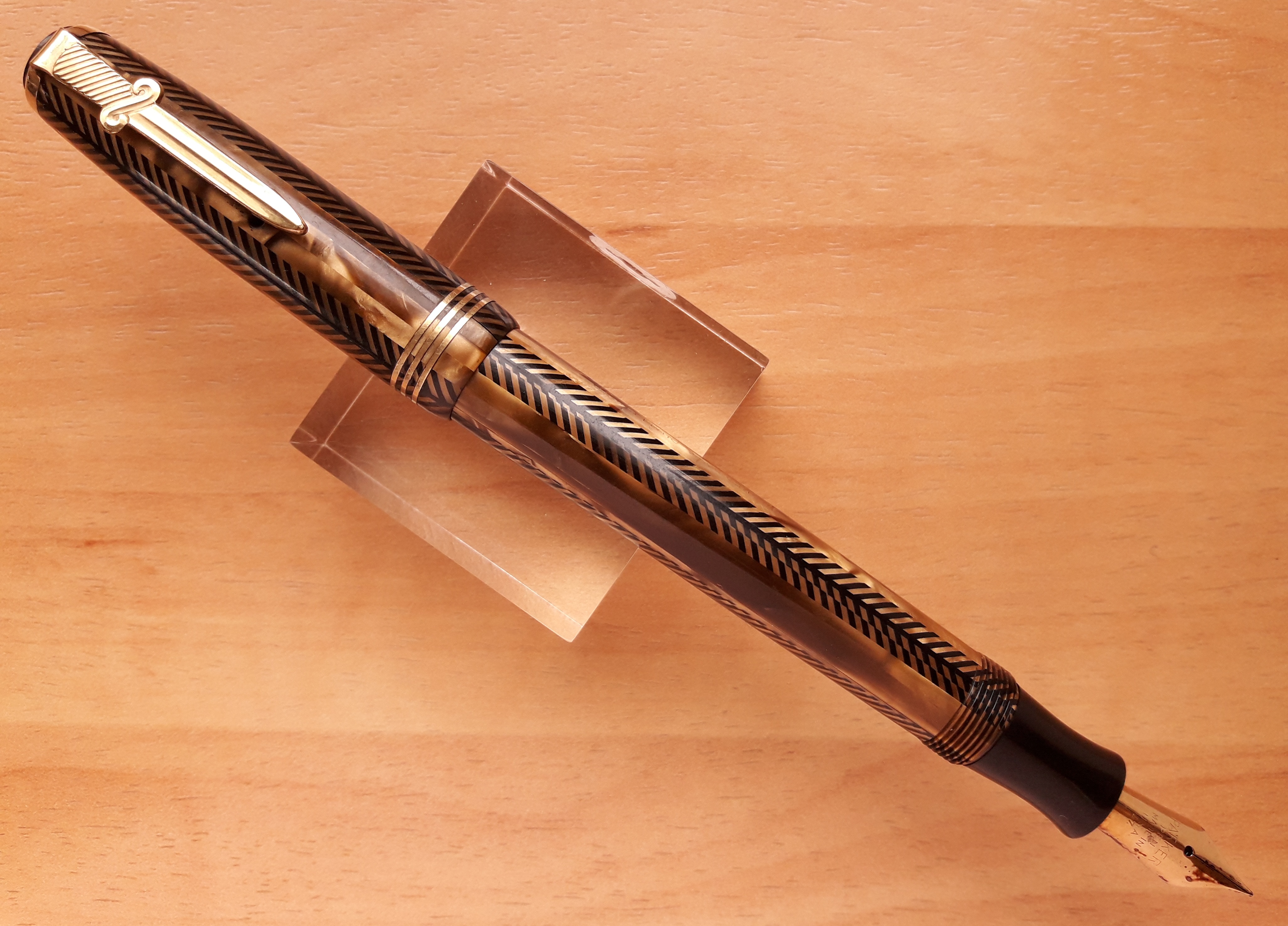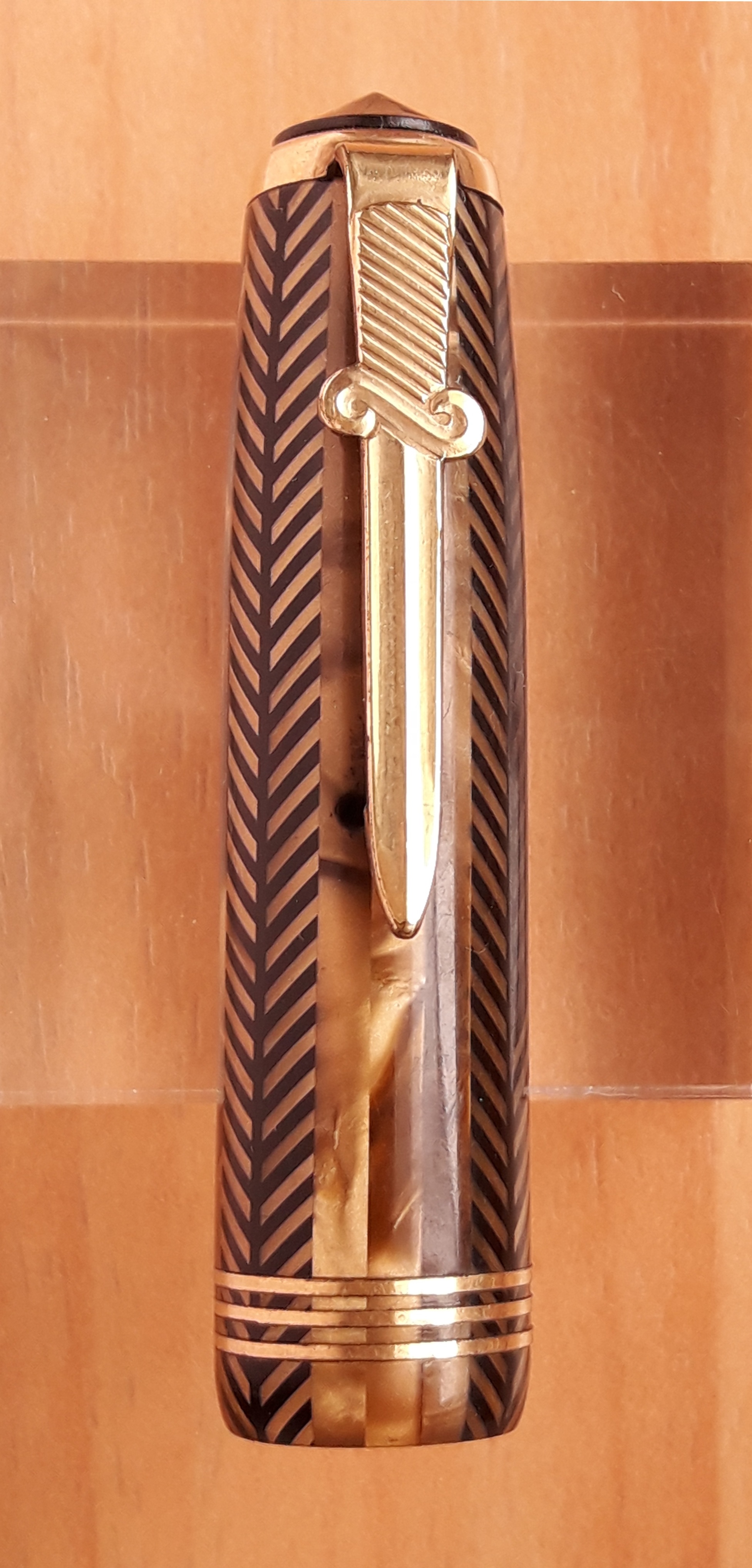 PARKER ROYAL CHALLENGER Standard (misura grande) in celluloide marrone perlato, parti metalliche a vista laminate oro, pennino Parker in oro 14 carati, caricamento a pulsante di fondo, produzione U.S.A. anno 1937.