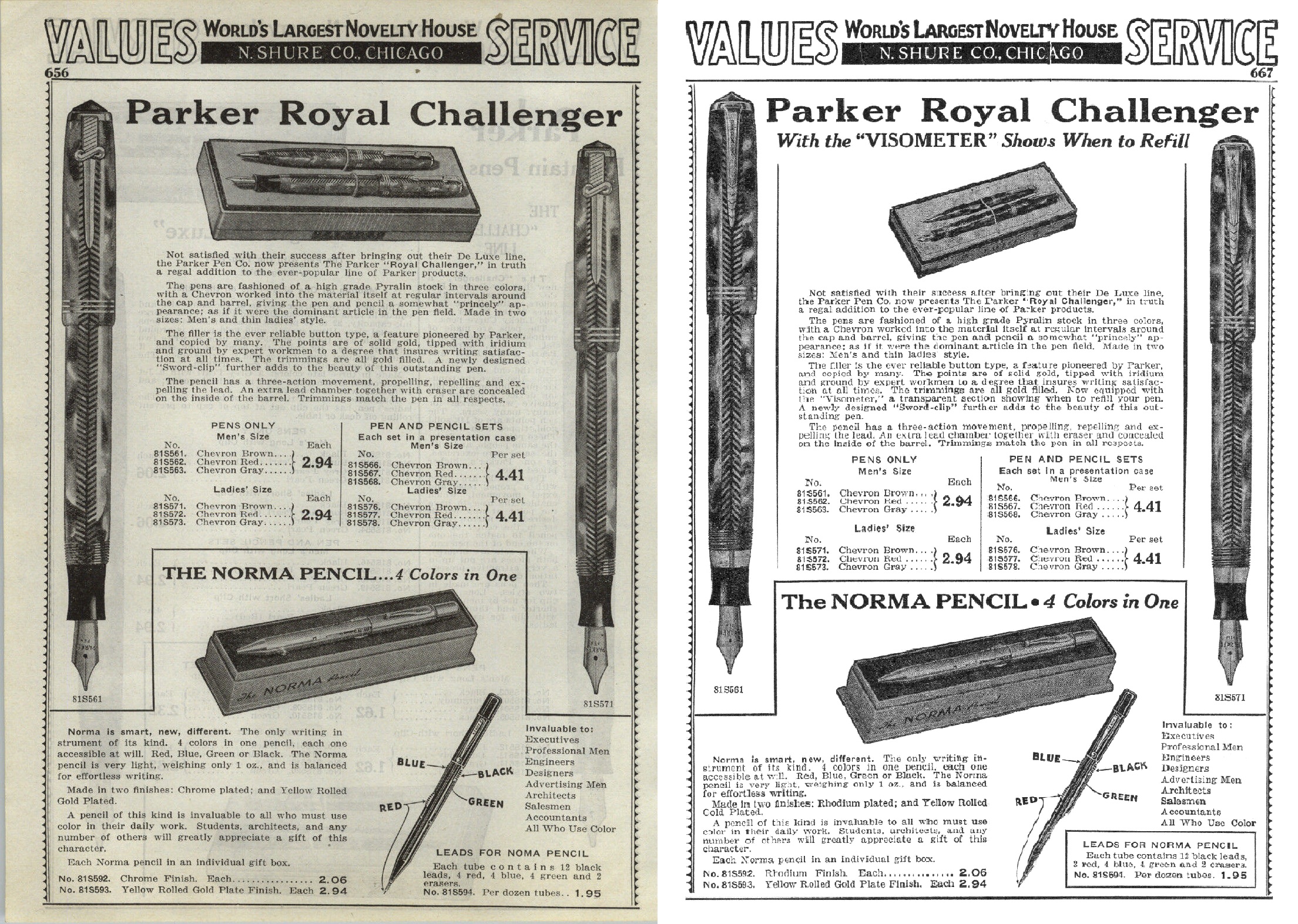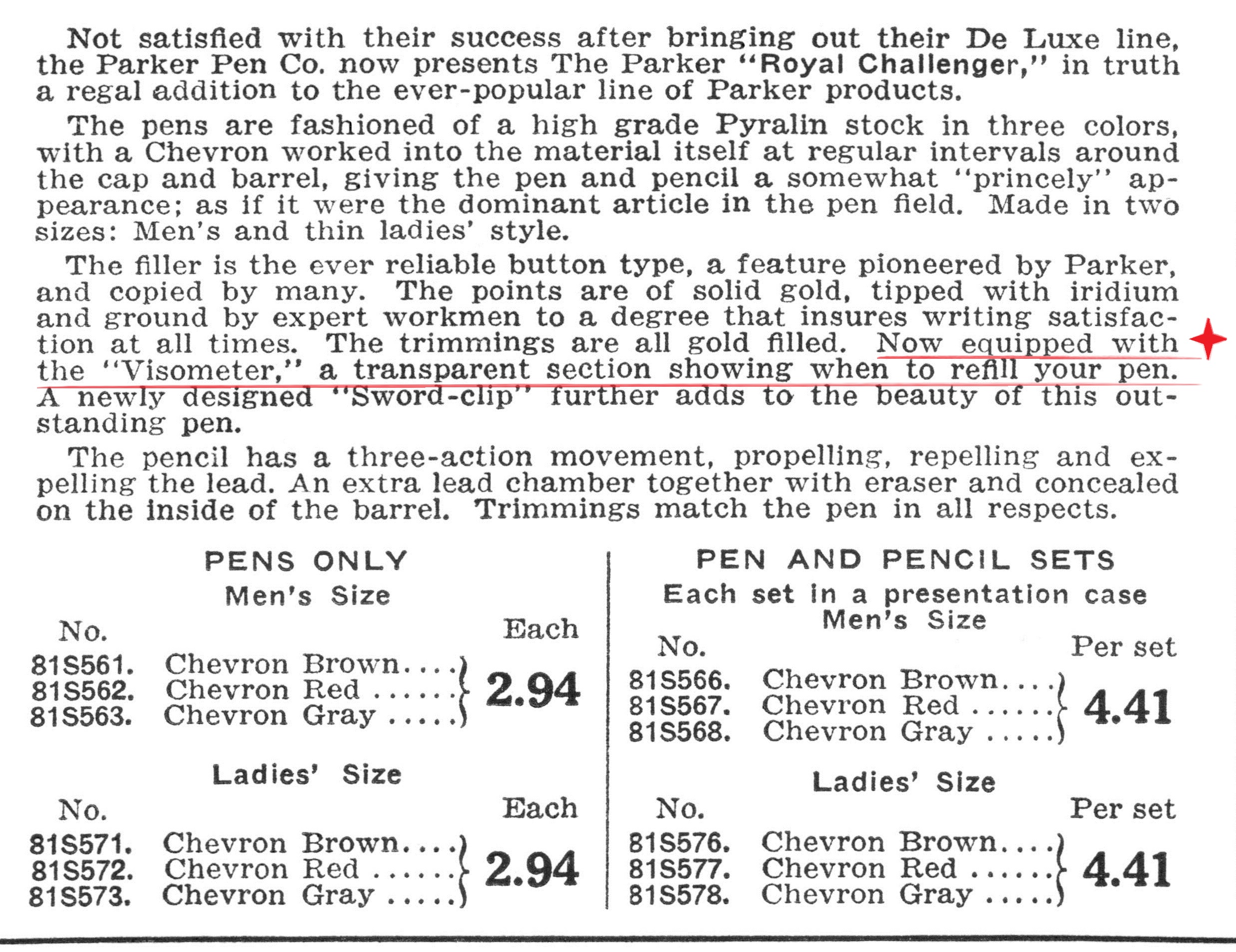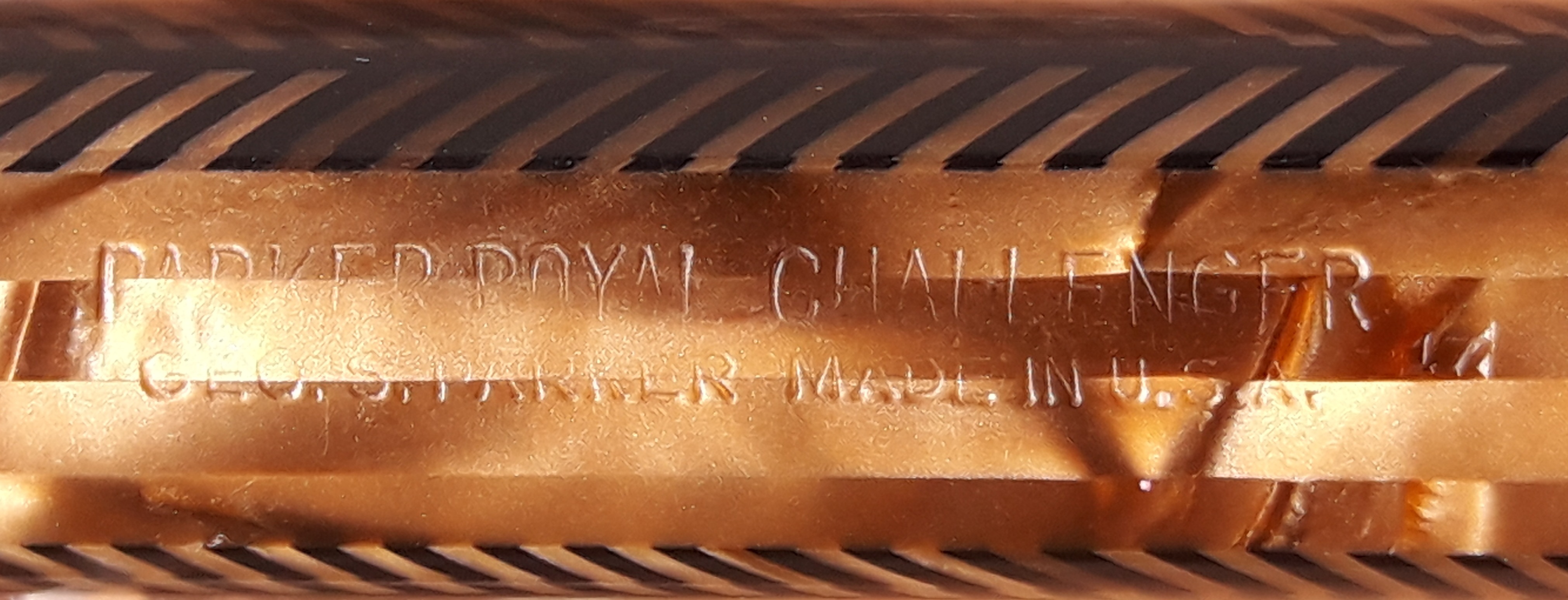 Proposta in tre colori e in due sole misure (Standard, cioè grande, e Slender, piccola) che venivano vendute al medesimo prezzo, la Royal Challenger è stilisticamente un derivato della Vacumatic dell’anno precedente, e potremmo sinteticamente definirla una Vacumatic non trasparente dotata di un tradizionale caricamento a pulsante di fondo; rispetto alle innovazioni del 1937 la Royal Challenger non condivideva solo la decorazione del cappuccio e l’ultimo tocco streamlined della linea top di gamma, ma era di fatto lunga (e larga) come la Vacumatic Maxima (mm.135) e veniva superata solo dalla oversize Senior Maxima (mm.139), che costavano esattamente il doppio ($10), mentre con i $5 richiesti per entrambe le misure eguagliava il prezzo delle Vacumatic non anellate che montavano un pennino semplice.