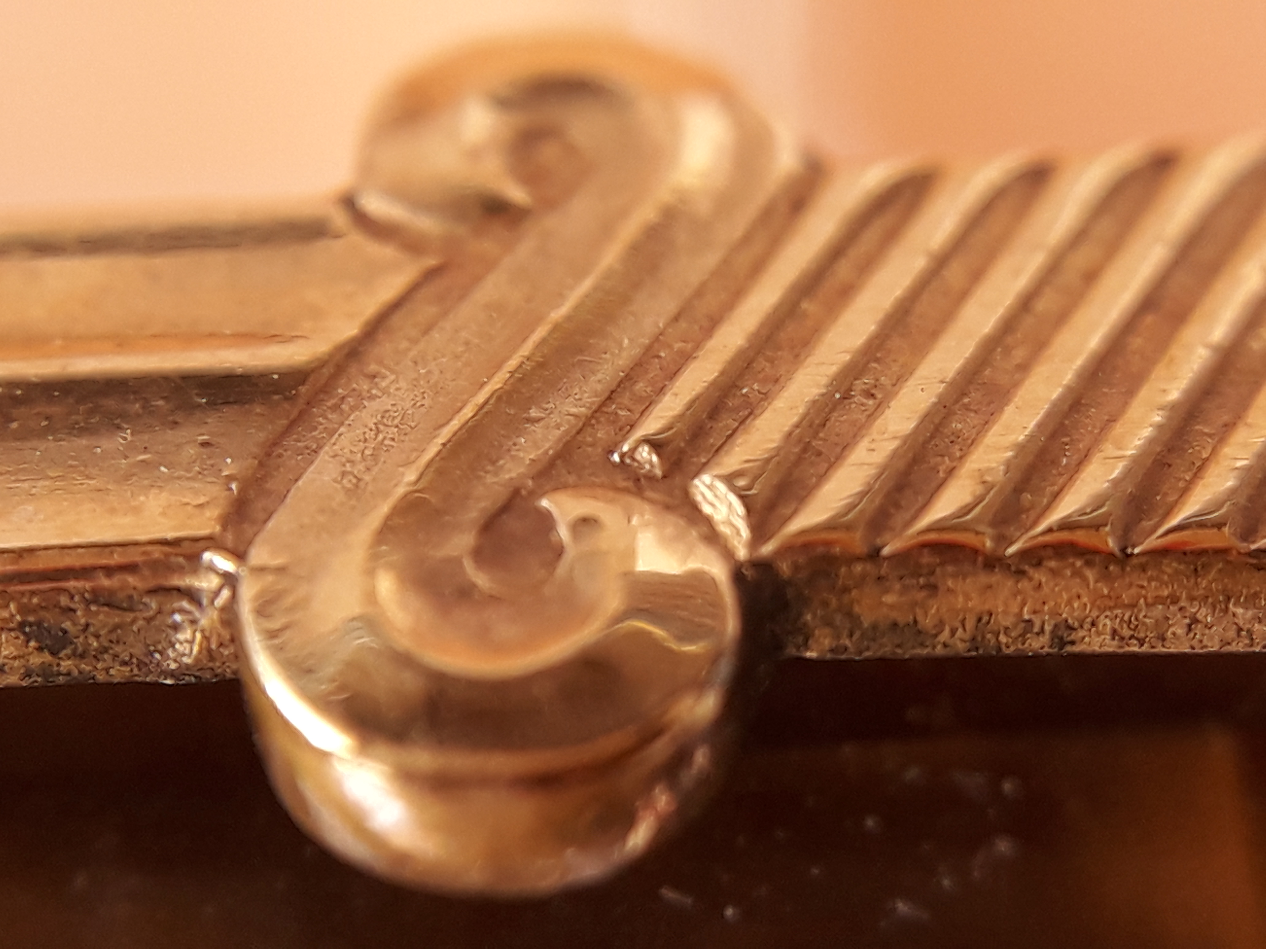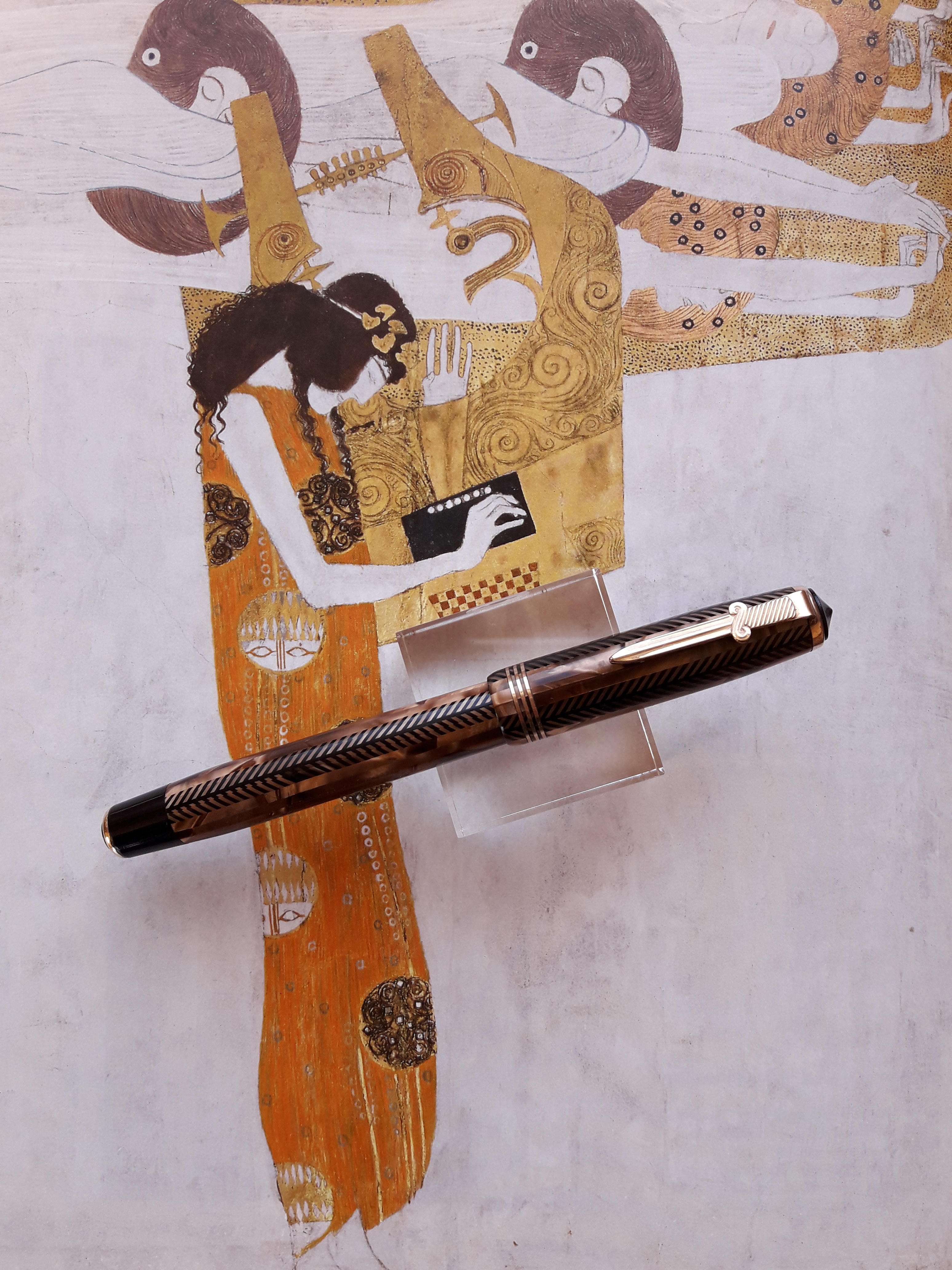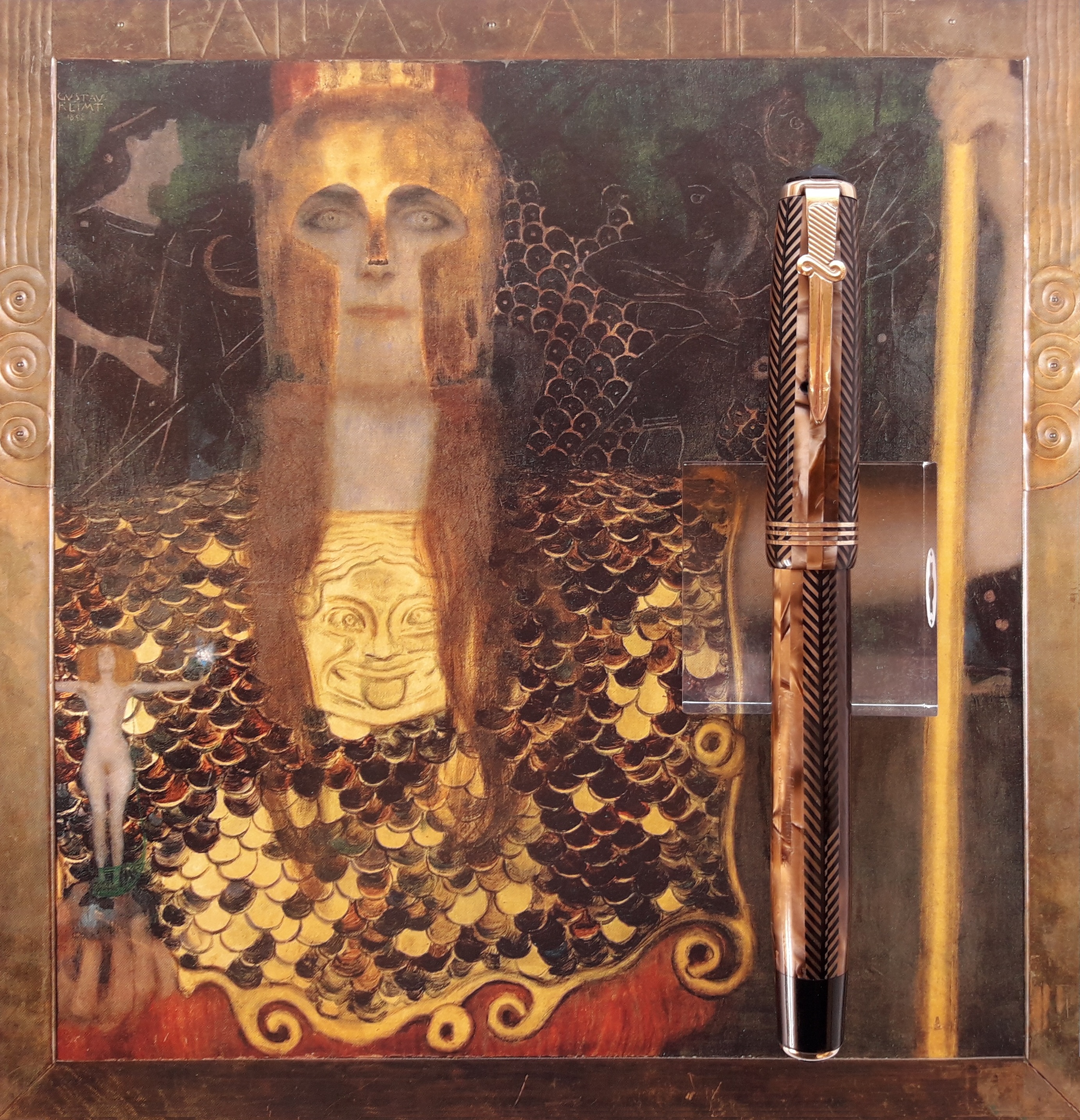 Ma che meraviglia la celluloide della penna, sembra davvero a suo agio fra le porpore dorate di Klimt. Hai postato la foto del cappuccio per mostrare il rostro ma io continuo a perdermi fra le sfaccettature e quella bella alternanza di geometrie e riflessi irregolari.
