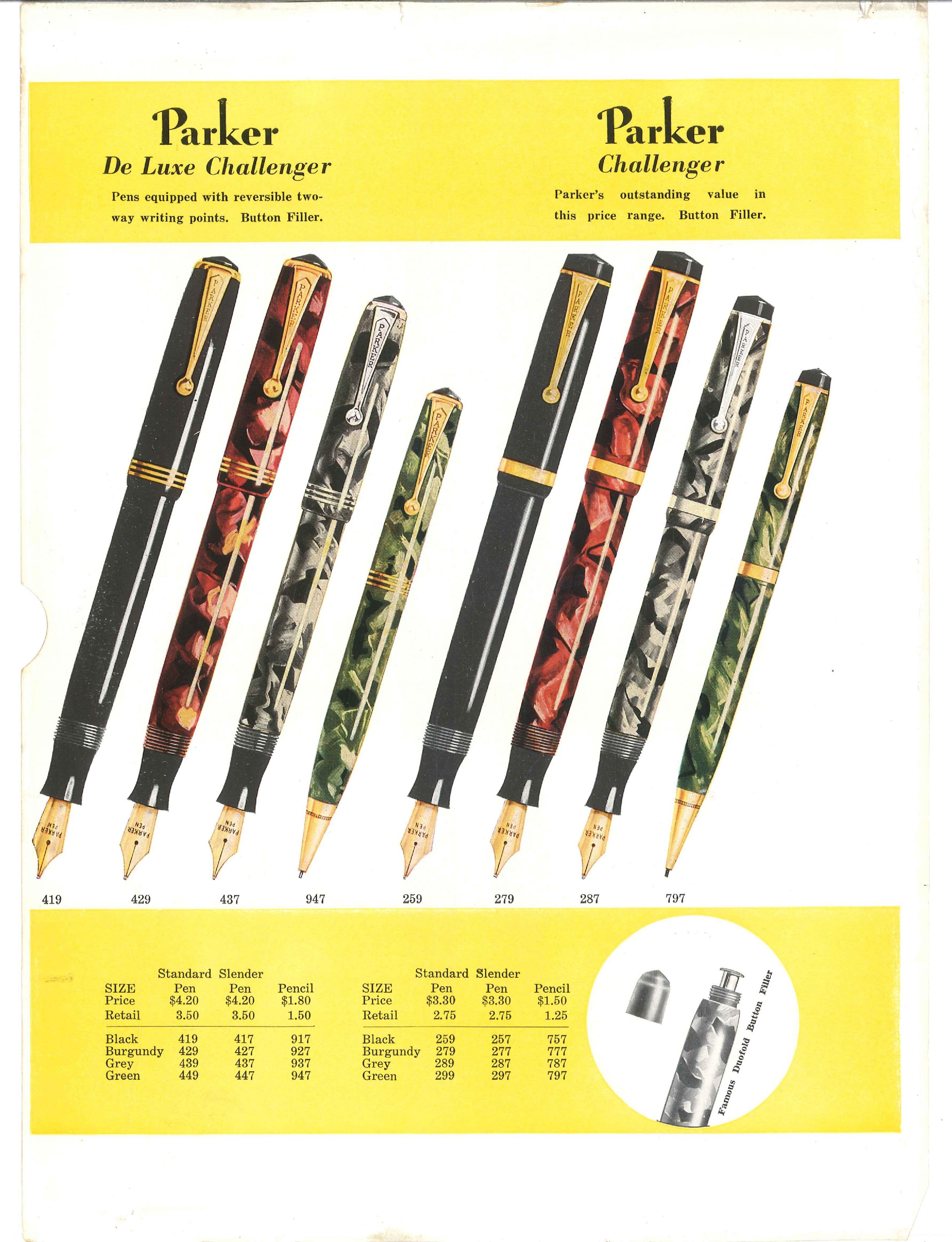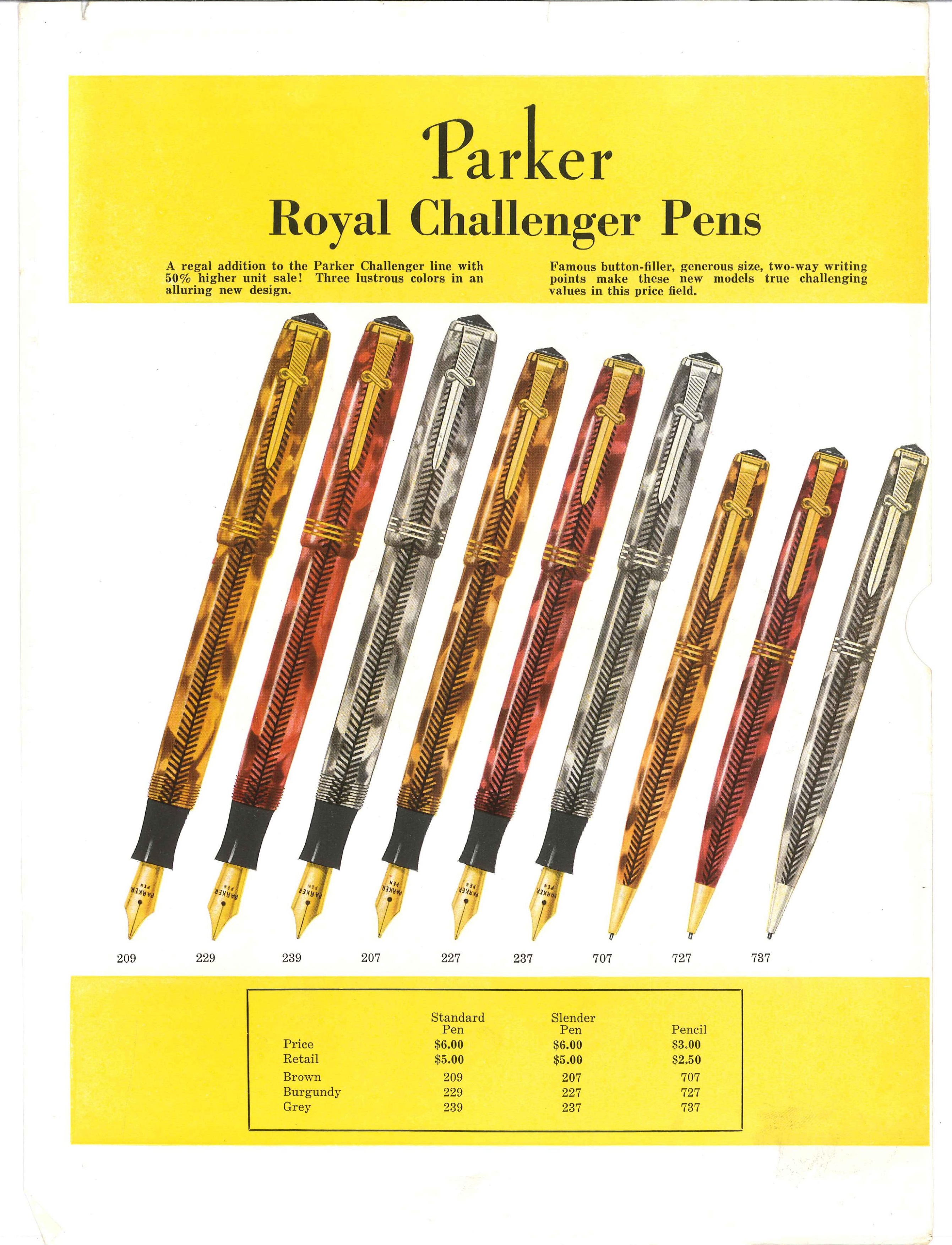 Il modello “Challenger” (“sfidante”) venne introdotto sul mercato dalla Parker nel 1934 come linea “scolastica” intermedia fra la Vacumatic (top di gamma, lanciata in grande stile l’anno precedente) e la più economica Parkette, al prezzo di $2.50. Nel 1935 venne introdotta anche una versione di maggior pregio, la “De Luxe Challenger” al prezzo di $3.50. Nel 1937 venne lanciata la terza linea, di lusso, denominata “Royal Challenger” con la clip a spada, al costo di $5.00.