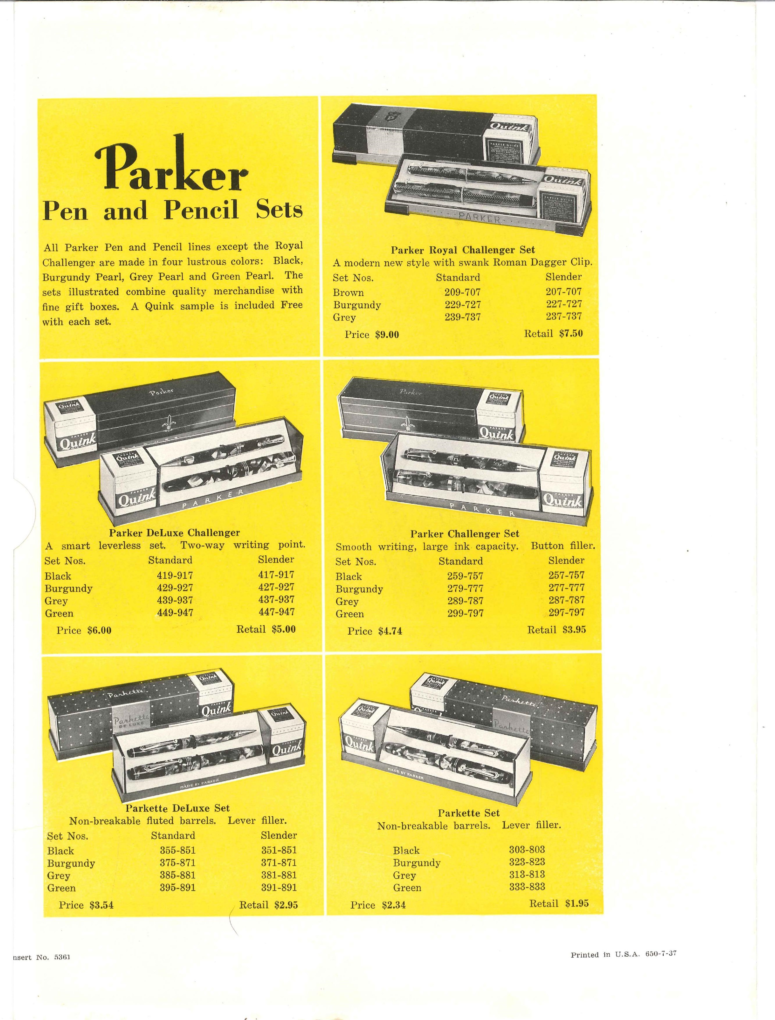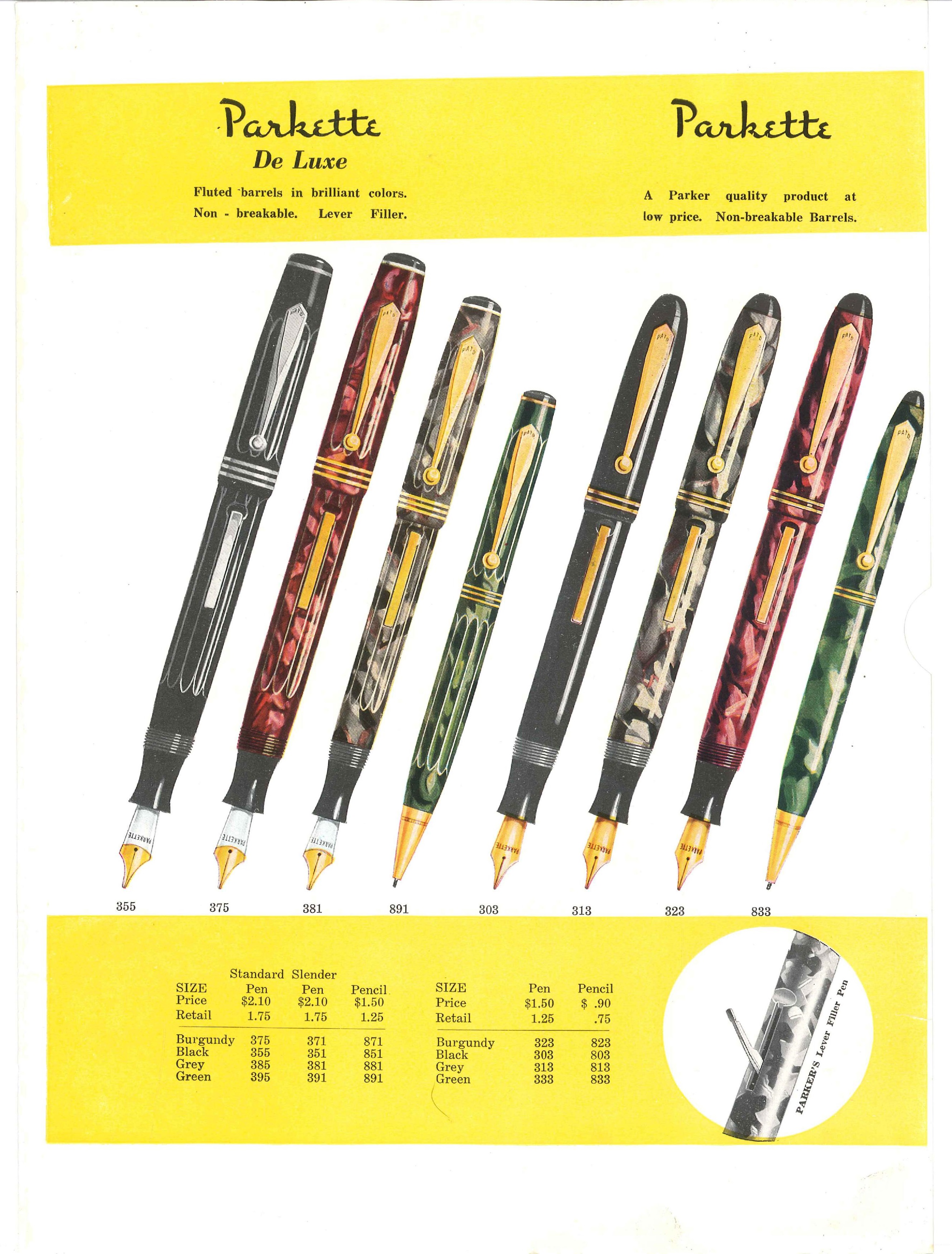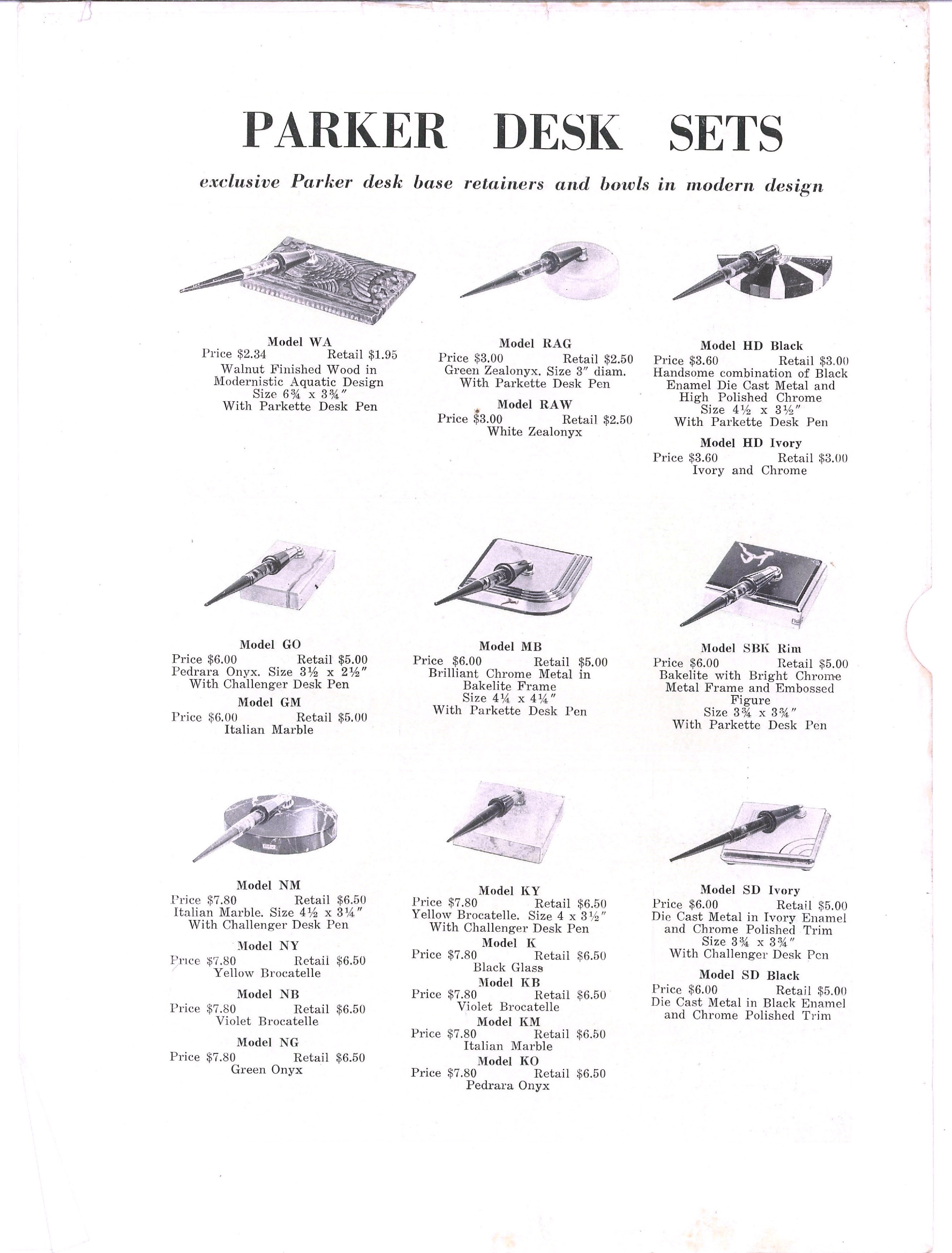 A2 e B1 (con tutte le penne dalle De Luxe Challenger alle Parkette) corrispondono esattamente alle pagine 12 e 13 del Catalogo No. 5373 del 1937, ma con due elementi originali di grande interesse