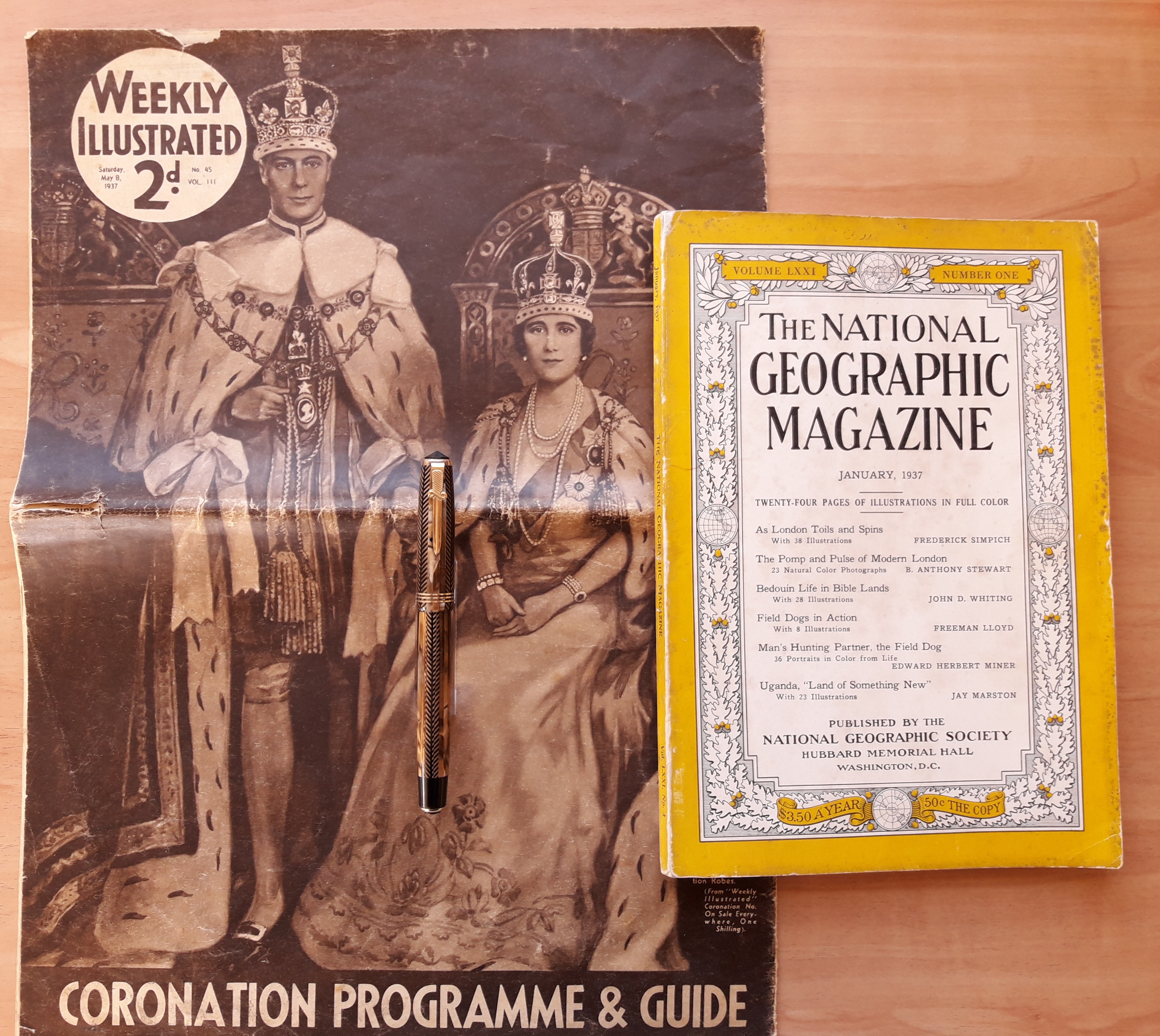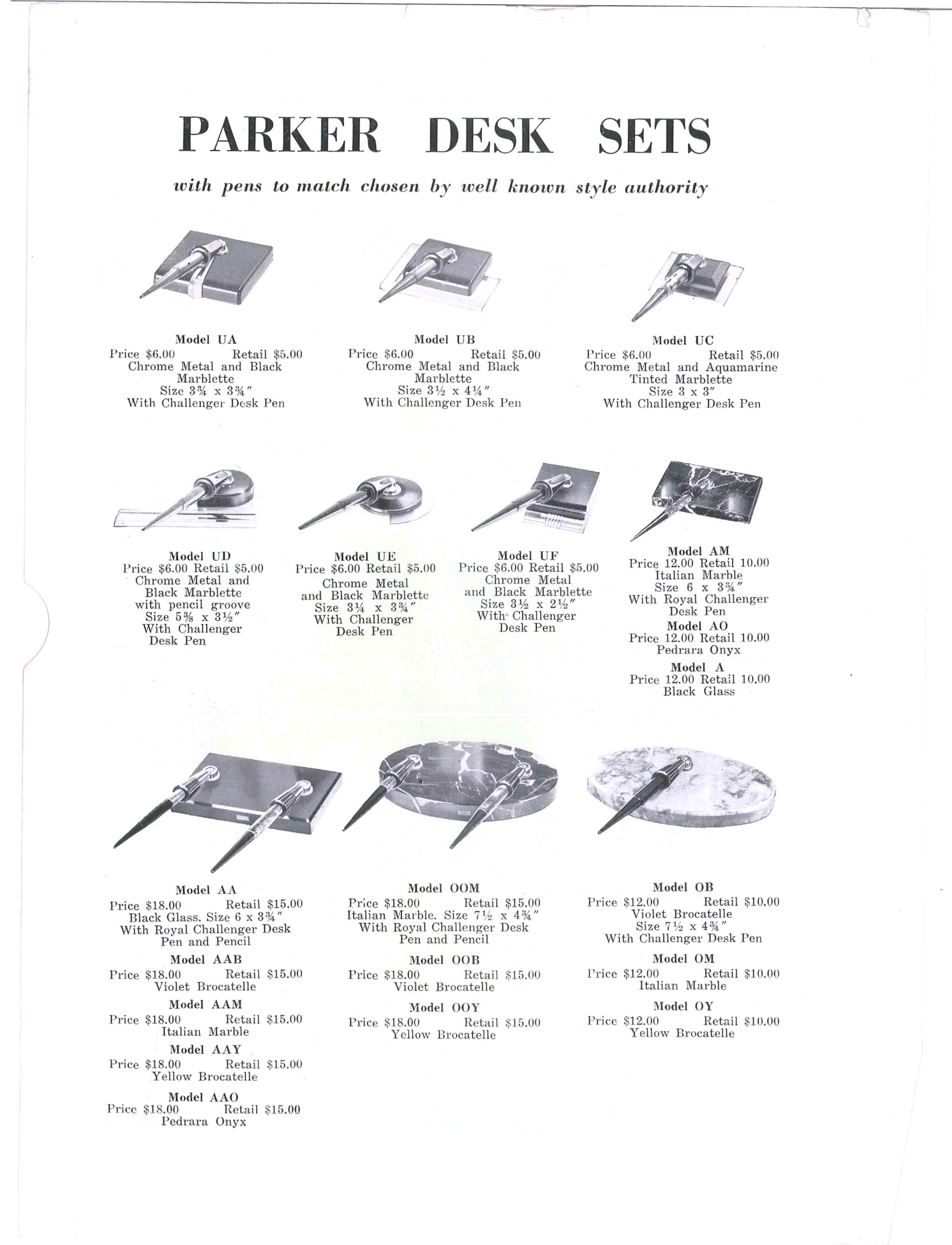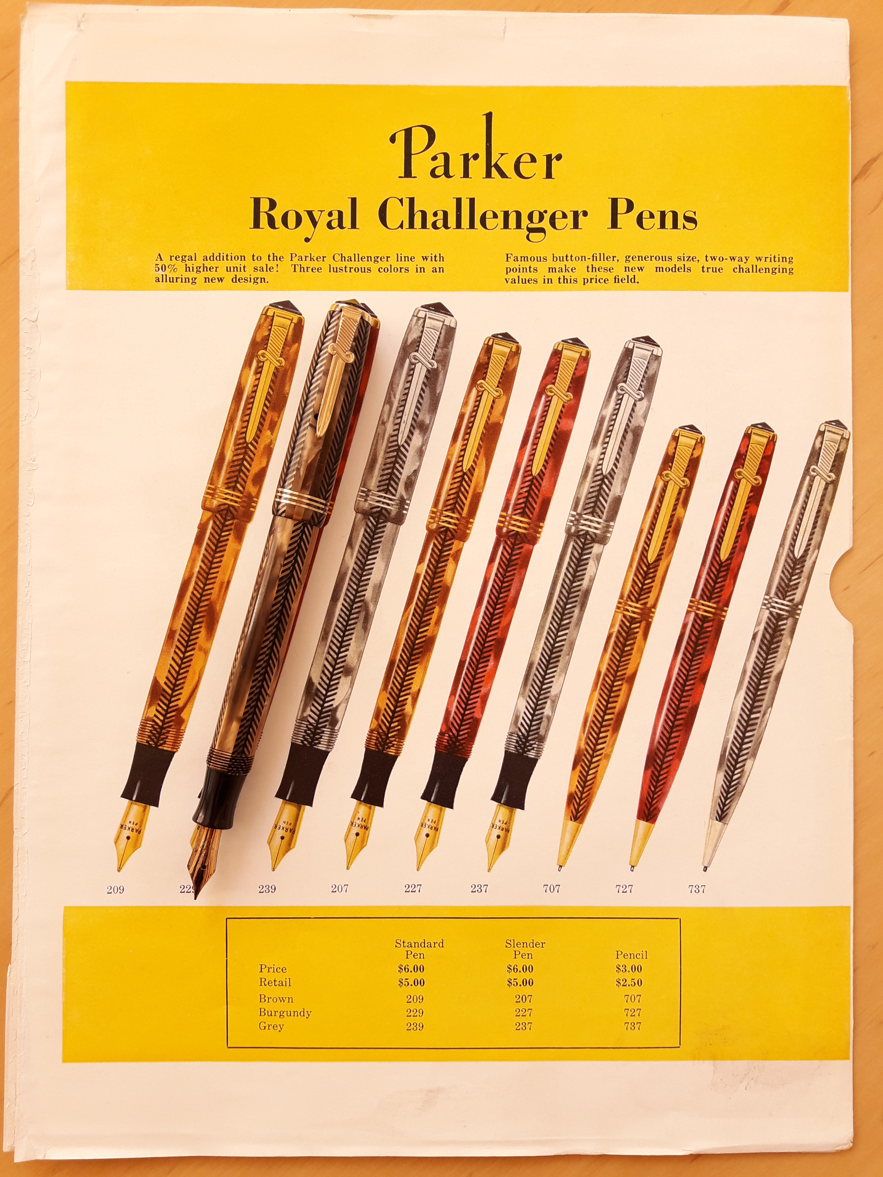 Dagli Stati Uniti mi sono fatto spedire un inserto originale Parker relativo a questa penna affascinante, ben conosciuta dai collezionisti ma di cui sono disponibili in rete pochissime informazioni a livello pubblicitario (ho trovato una sola citazione del modello Royal Challenger sui quotidiani americani dell’epoca, ma senza immagini, nessuna su rivista e una sola nel catalogo di un grande magazzino di Chicago), e praticamente nessuna nei cataloghi ufficiali consultabili (la situazione parrebbe migliorare di poco per le successive Royal Challenger con clip scalettata): l’assenza più significativa (oltre a quella inspiegabile dallo splendido Catalogo del “SemiCentennial” del 1938) è quella dal Catalogo No. 5373 (del 1937 secondo i “Pen Collectors of America” che l’hanno reso disponibile in rete)…