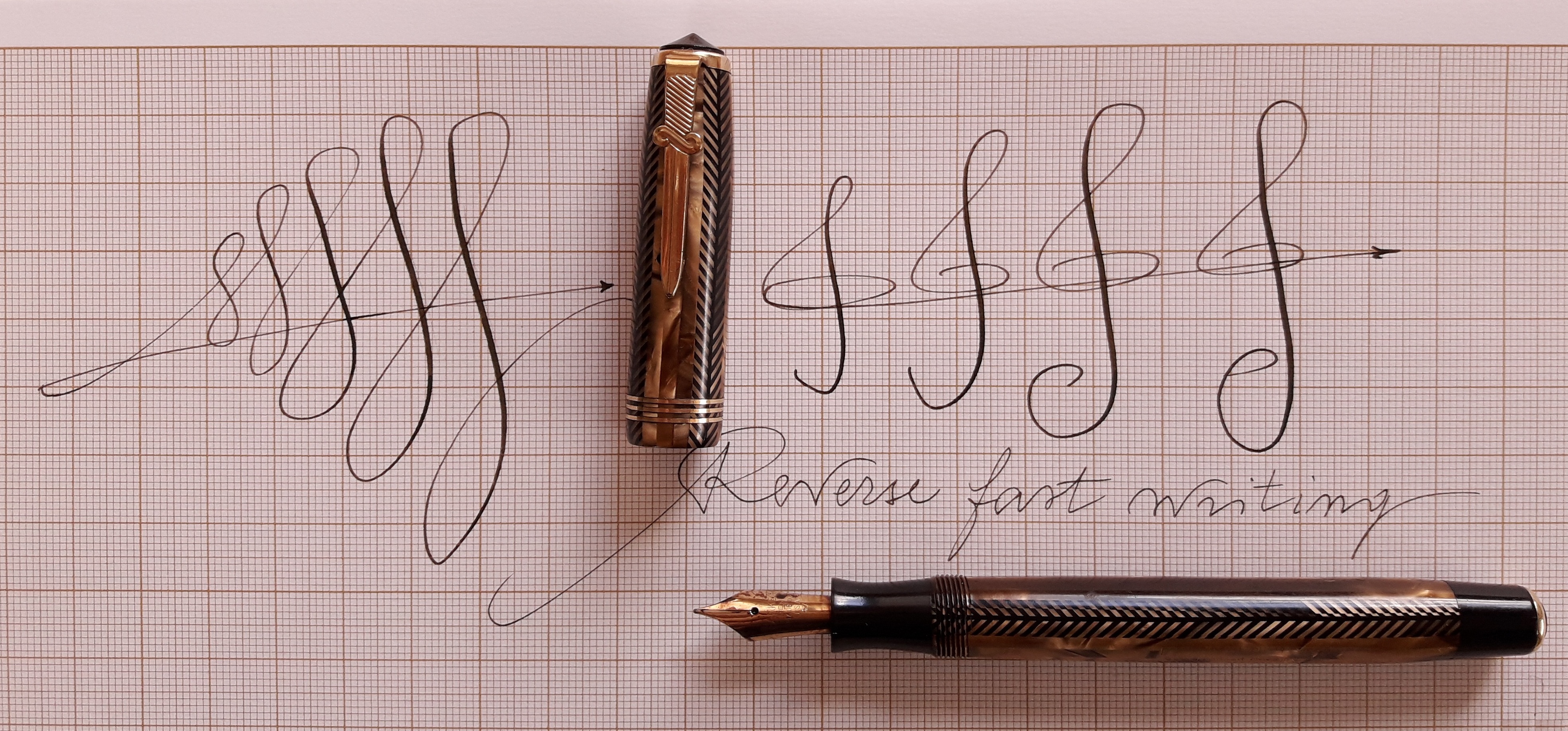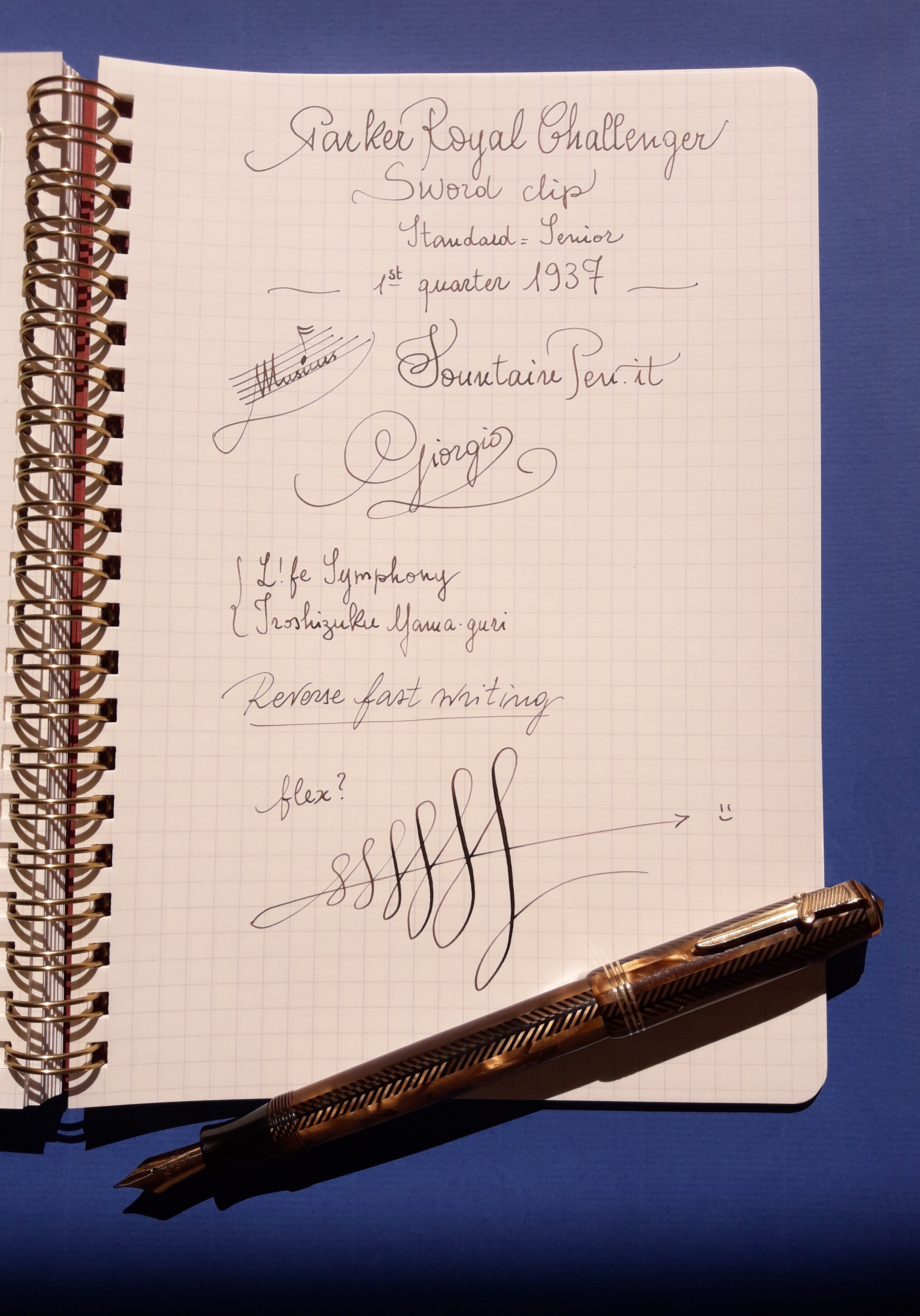 Come noterete, è disponibile un tocco di flessibilità, ma la pressione necessaria per divertirsi è ben lontana dalle mirabolanti prestazioni in souplesse tradizionalmente appannaggio di altri Marchi (e, per Parker, di altre epoche): ma non è questa una penna che si acquisti per esercitarsi in calligrafia.