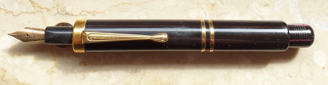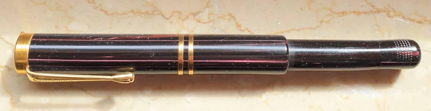 Stilografica Pullman (brev. Leopold Kutter, Vienna AT 1928, DE 1929, FR 1932) in celluloide, caricamento a bottone di fondo, da usarsi anche con una mano sola. Unica marca di questo tipo, all'epoca.