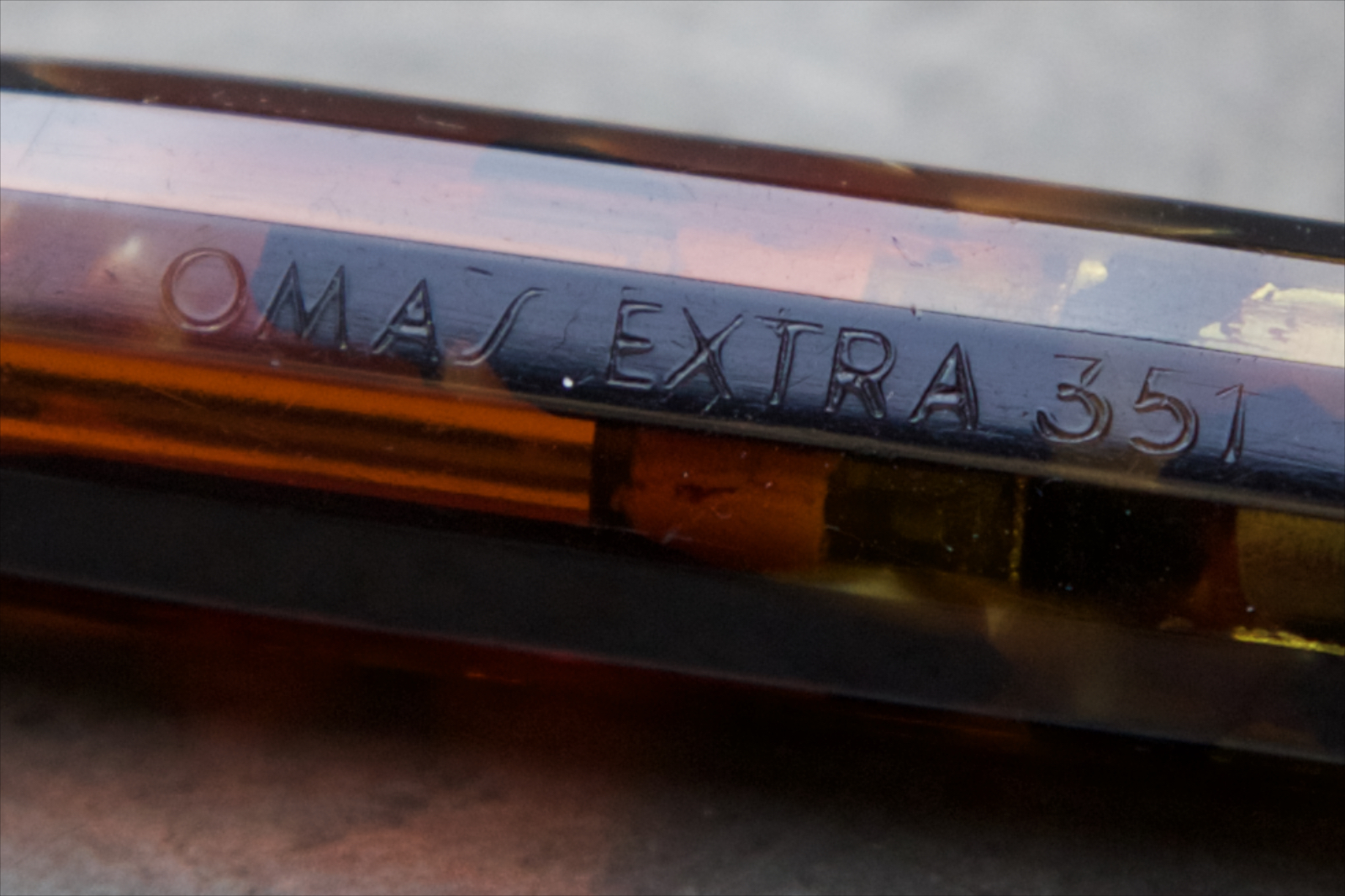 Presa finalmente in mano ho svitato il cappuccio, la penna aveva un bel pennino in oro marchiato Columbus Extra 23 e un alimentatore in ebanite che continuava a gridare Omas! Ho proseguito la mia indagine visiva e sul fusto, tra lo sporco generale in cui versava la penna, ho scorto l' iscrizione "Omas Extra 351". La ricerca di informazioni