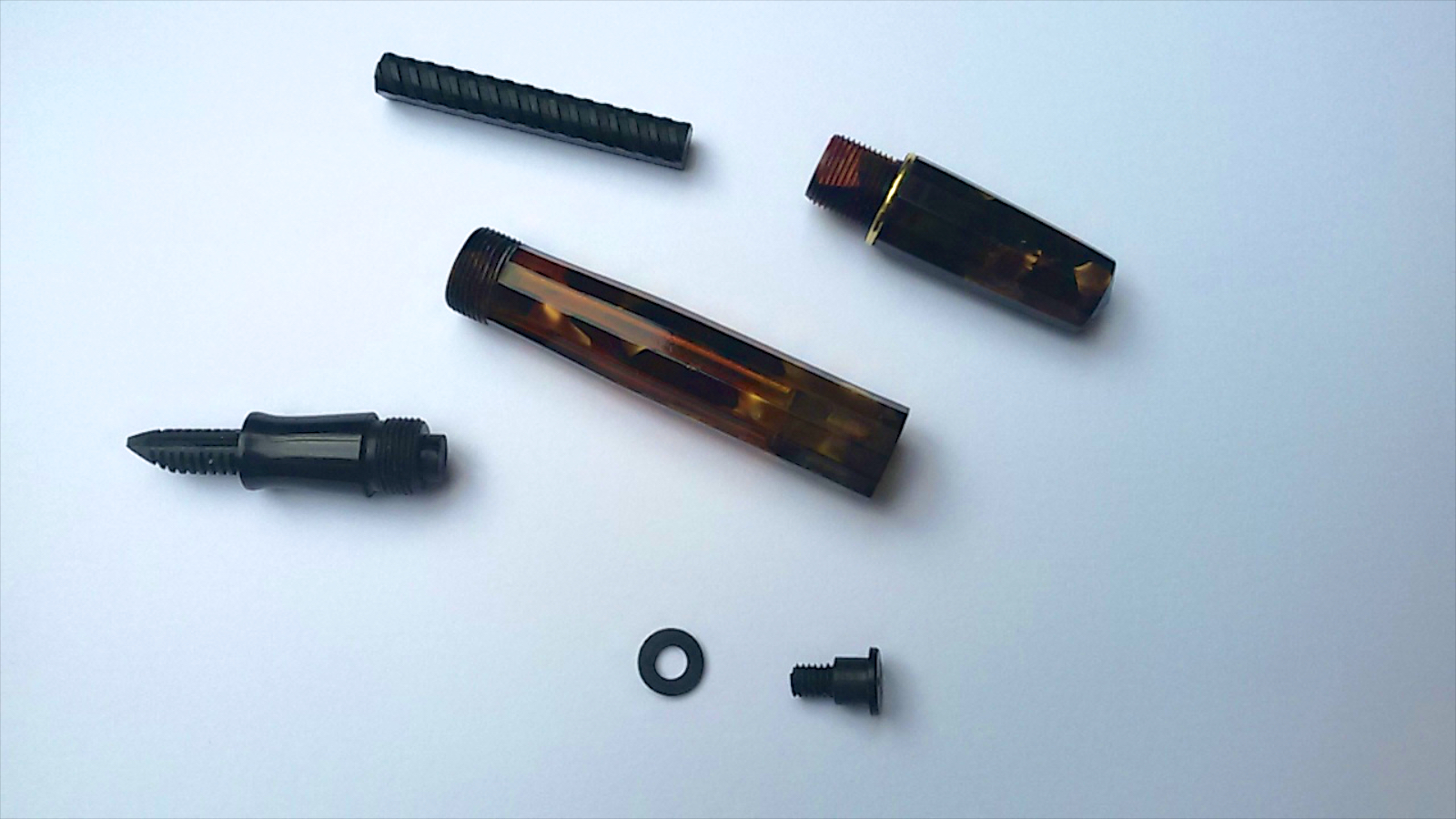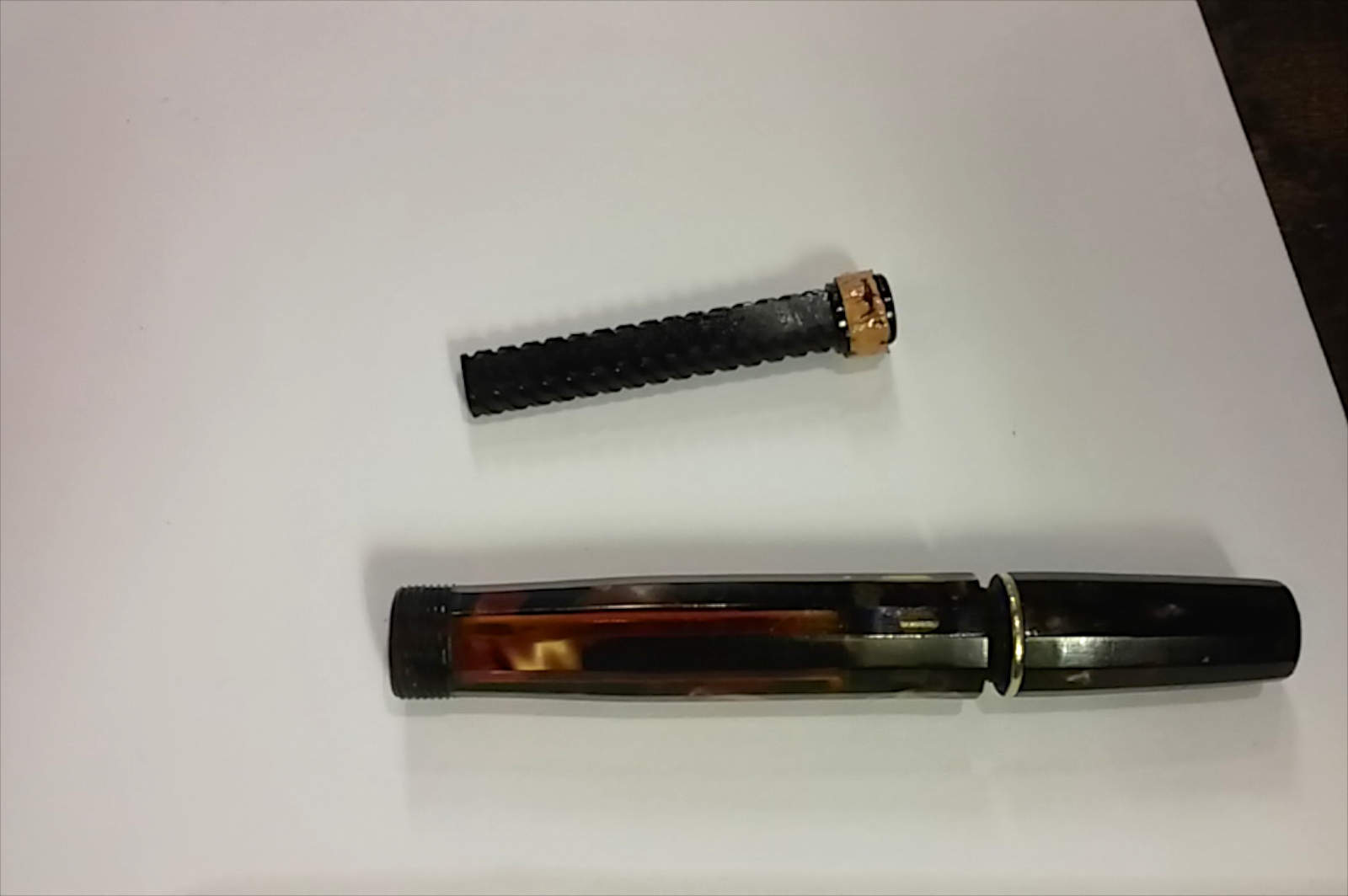 La penna versava in condizioni di sporcizia totale, fortunatamente aspirava ancora e l' ho riempita di acqua e messo a bagno anche il pennino. Dopo qualche ora la sezione si è svitata facilmente, ho estratto il pennino e lo stantuffo. Dal retro ho svitato il fondello e lavato bene tutto. Il sughero non era riutilizzabile, ho provveduto quindi a rifarlo e sostituirlo, lasciato una notte in olio di vaselina l' ho poi coperto di un velo di grasso al silicone. Il pennino