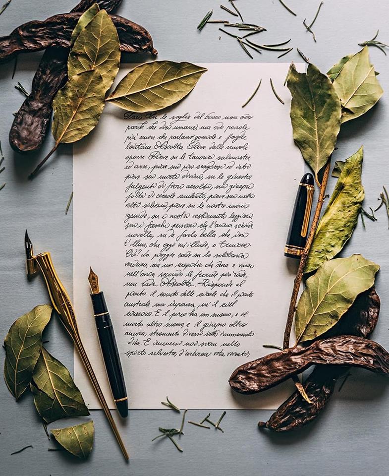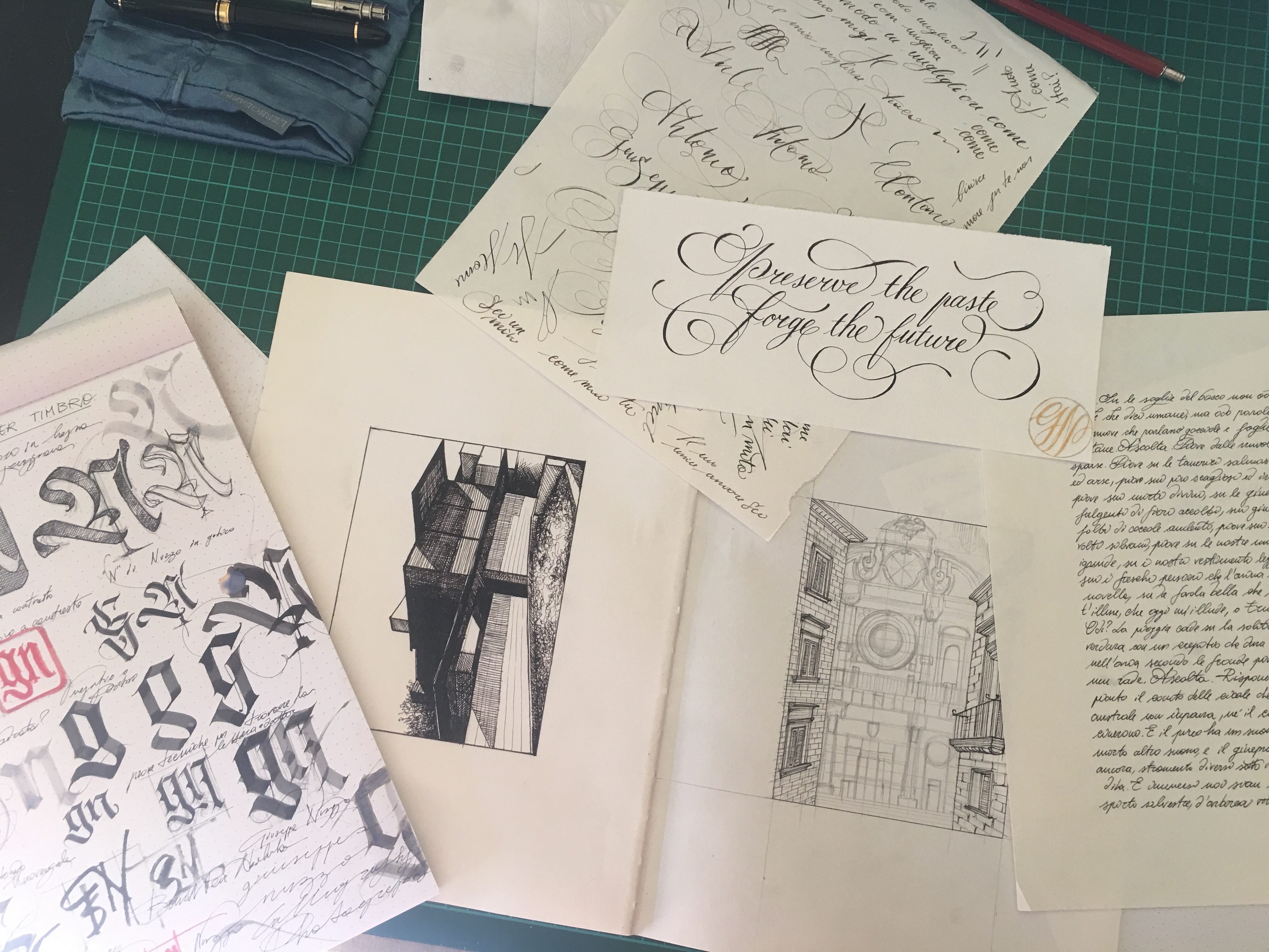 Io per chi ancora non lo sapesse faccio calligrafia da tanti anni ,anche se a livello amatoriale, ho 26 anni e fin da quando ero piccolo non ho ricordo che non sia con un pastello, una penna o un colore in mano e a partire dalle scuole superiori soprattutto si è intensificata in me questa passione ,un po' perché cominciando a fare i graffiti quando frequentavo il liceo artistico,un po perché mio padre vedendomi crescere e fidandosi di me dato che non ero più' bambino e vedendo che mi sono appassionato all'arte in generale anche grazie a lui che mi spingeva in quella direzione ,comincio a farmi vedere e a usare anche se sporadicamente le suepenne ,stilografiche ecc da collezione e non..(che oggi in pratica sono diventate a tutti gli effetti di mio possesso e e uso quasi quotidianamente) mi appassionavo alla scrittura sotto le sue svariate forme parallelamente al disegno e ad altri generi artistici, iscrivendomi all'università' ho ancora di più apprezzato questa cosa perché il repentino tempo passato davanti al pc a progettare .disegnare 2d e 3d dato che frequento architettura e di pari passo lavoricchio come fotografo, le tre cose sono andate a nozze,quindi uso le stilografiche per le mie bozze, per schizzi veloci, per prendere appunti, per firmare disegnare e quanta'altro.