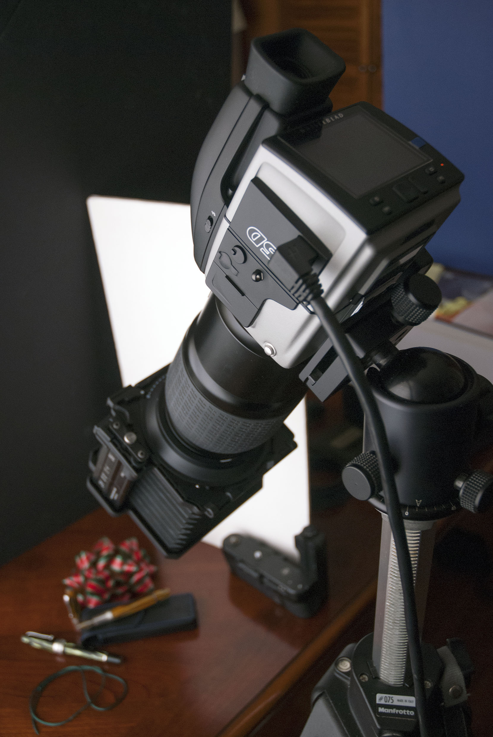 Ho sistemato gli oggetti a mio gusto, vicini al bordo del tavolo, in modo da potermi avvicinare con il cavalletto ed ottenere una vista quasi verticale. Mi piace che qualcosa (in questo caso il fiocco e il nastrino) sia "tagliato" dai bordi del fotogramma, come se fosse lí un po' per caso... La finestra é sulla sinistra della scena, sulla destra c'é un piccolo cartone bianco (circa 30 x 20 cm), sostenuto in verticale. Ho messo a fuoco sul pennino, con un diaframma chiuso (f/29). Ho messo la carta velina il più possibile vicino alla penna di sinistra, senza che entrasse in scena, per ridurre la brillantezza delle finiture in argento e del pennino in oro. Ho effettuato l'esposizione, variando tre volte il tempo. La migliore delle tre é stata esposta a f/29 per 8" (a me piacciono le fotografie in toni scuri, un po' caravaggesche: con altri 3 o 4 secondi di esposizione si può avere un'immagine più chiara, per chi la preferisca)