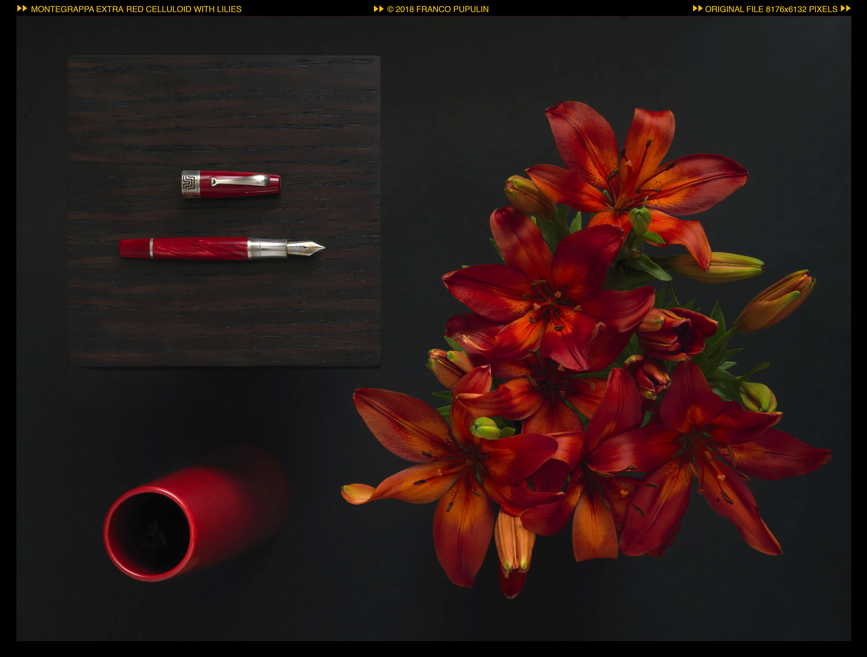 Ieri, in un garden center non lontano da casa, ho scovato una bellissima pianta di un giglio arancione ibrido, piuttosto compatto, con molti fiori aperti. L’ho portato a casa, pensando di farne una foto insieme a qualche penna. Poi, la miglior candidata é risultata la mia Montegrappa Extra rossa, una penna con un disegno e una celluloide che non trovo miglior espressione per definire se non splendidamente bella. Di fatto, é una penna così spettacolare che, dopo averne provato il morbido e plastico pennino medio, non ho l'ancora inchiostrata in attesa di un’occasione speciale.