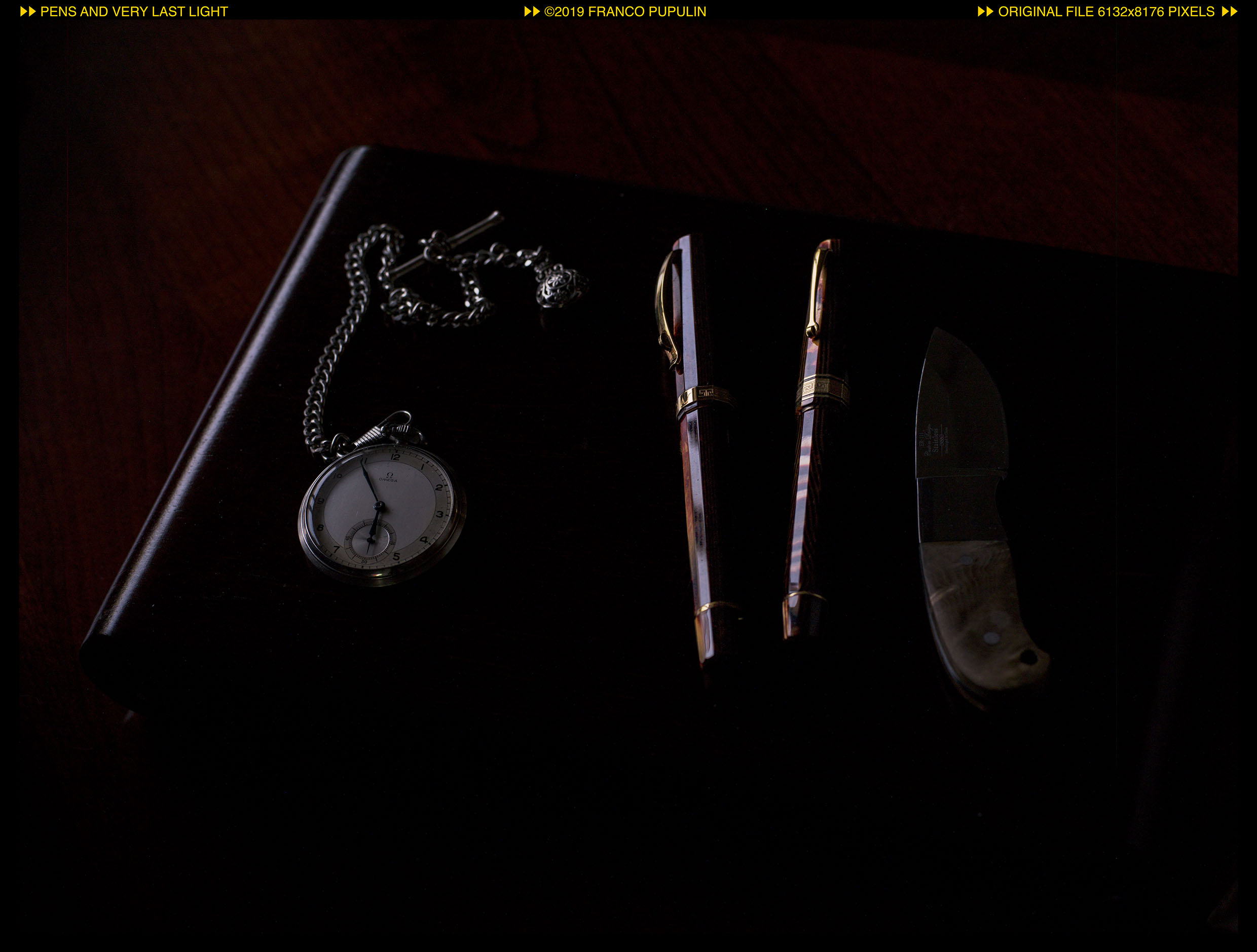 Entrando nello studio, prima di accendere al luce elettrica, ho fatto in tempo a notare che l'ultima luce del giorno, completamente radente, faceva brillare i corpi bruno-dorati delle mie Omas Paragon contro lo sfondo ormai quasi nero del tavolinetto di palissandro. Qui, vicino alla zona equatoriale, la luce del giorno scompare molto velocemente, intorno alle sei del pomeriggio. Ho messo la mia fotocamera sul cavalletto e ho ripreso questa fotografia con l'ultimissima luce del giorno.