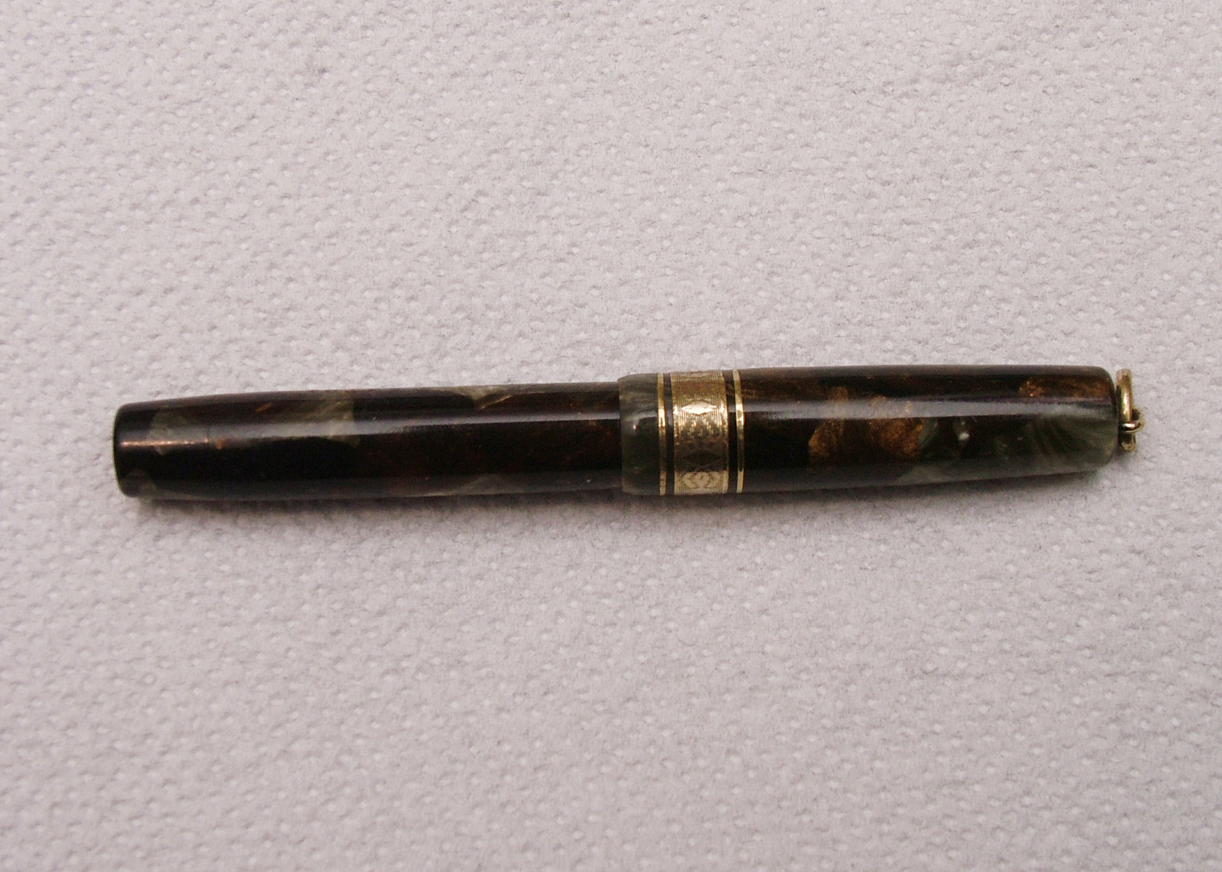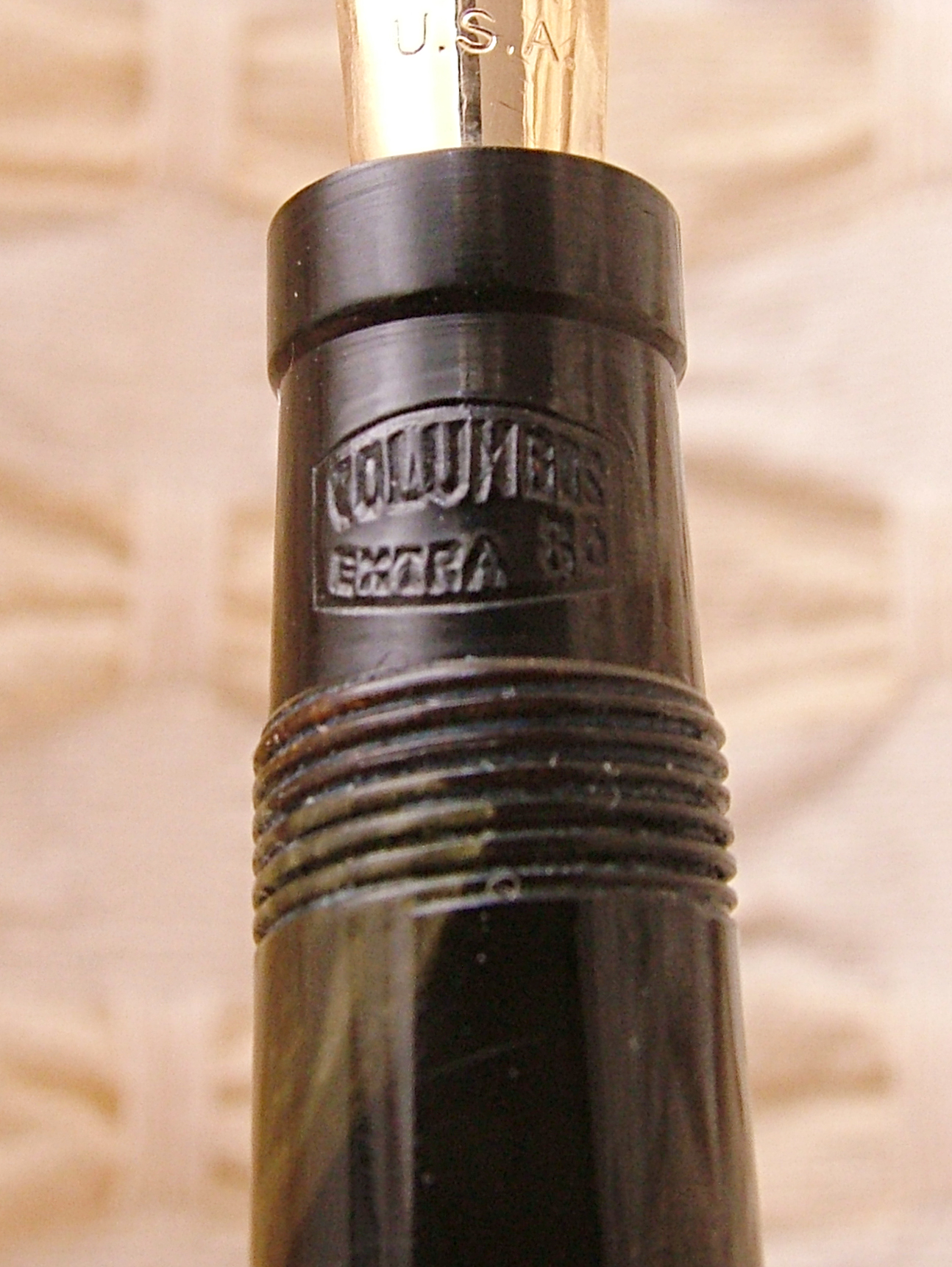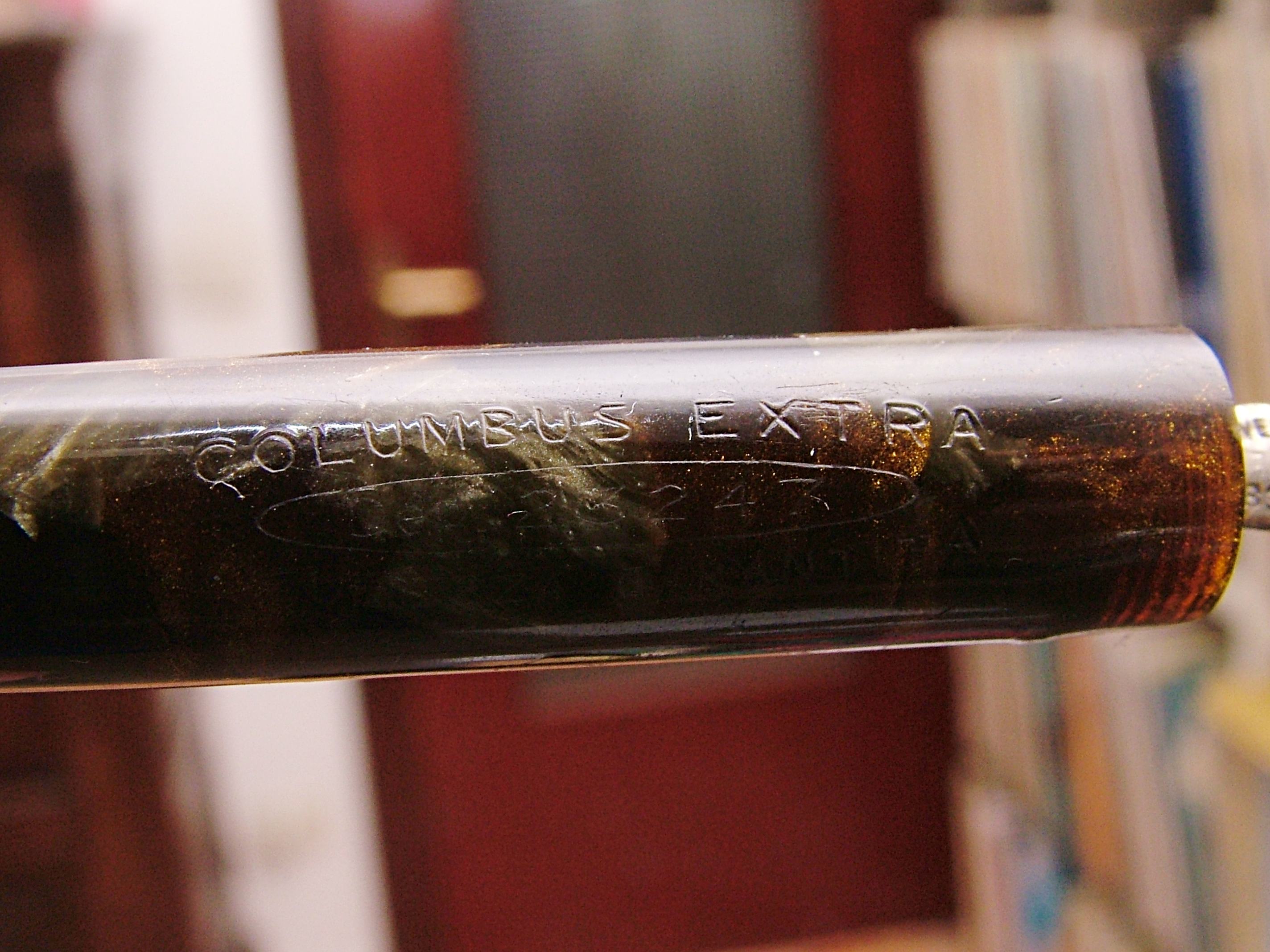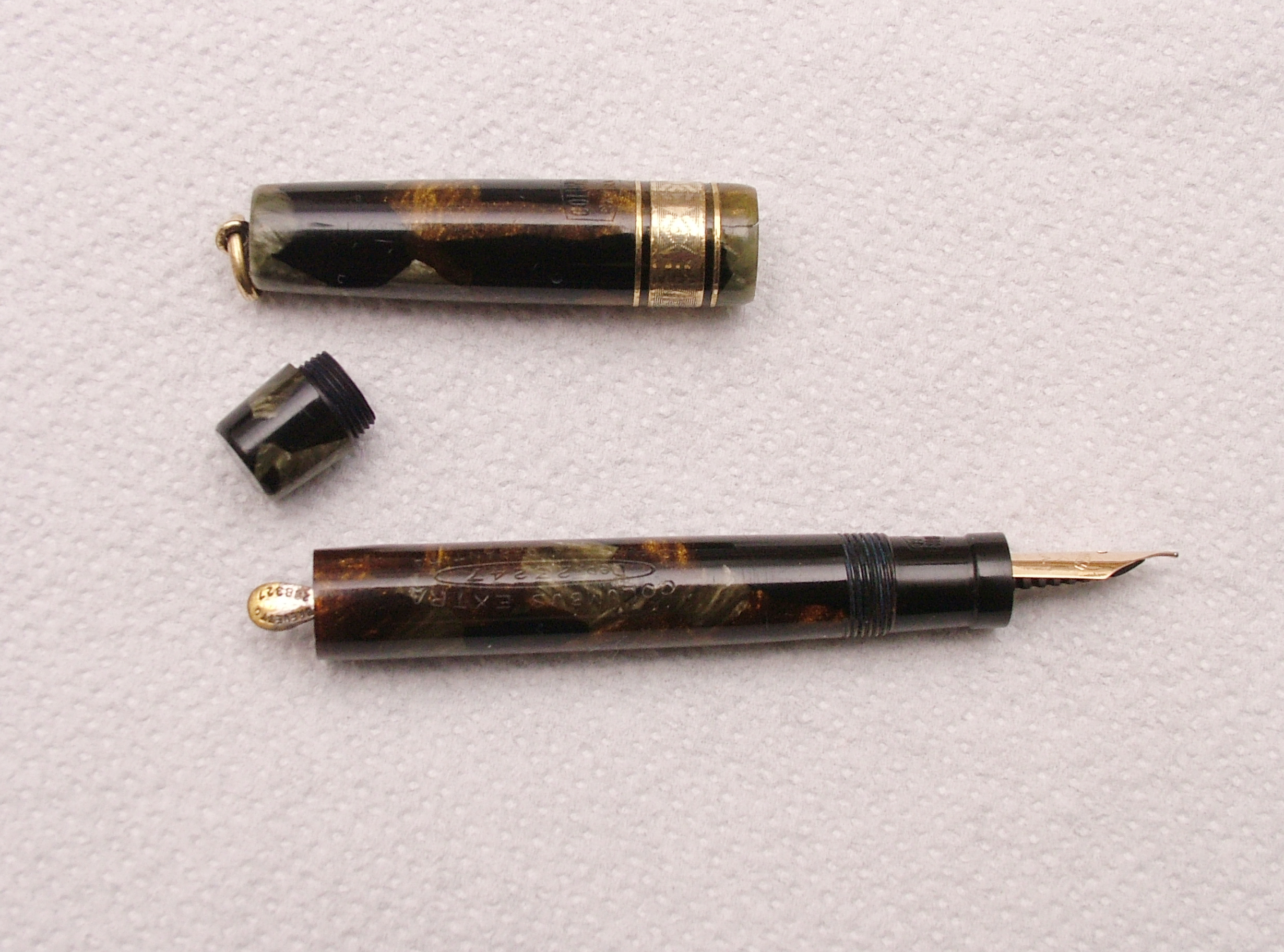 Ma veramente, ci sono dei particolari costruttivi in questa penna che la Montblanc se li sogna: la finezza con cui sono rifiniti gli apici ed è montato l'anellino, la veretta degna di una laminata del decennio precedente, la profondità delle incisioni, il sistema di caricamento in una penna così piccola, oltre alla scelta del blocco della celluloide color sottobosco in autunno. La Columbus secondo me, come la Ancora per parlare di manifatture Lombarde, lavorava benissimo, molto meglio di tante "blasonate per modo di dire".
