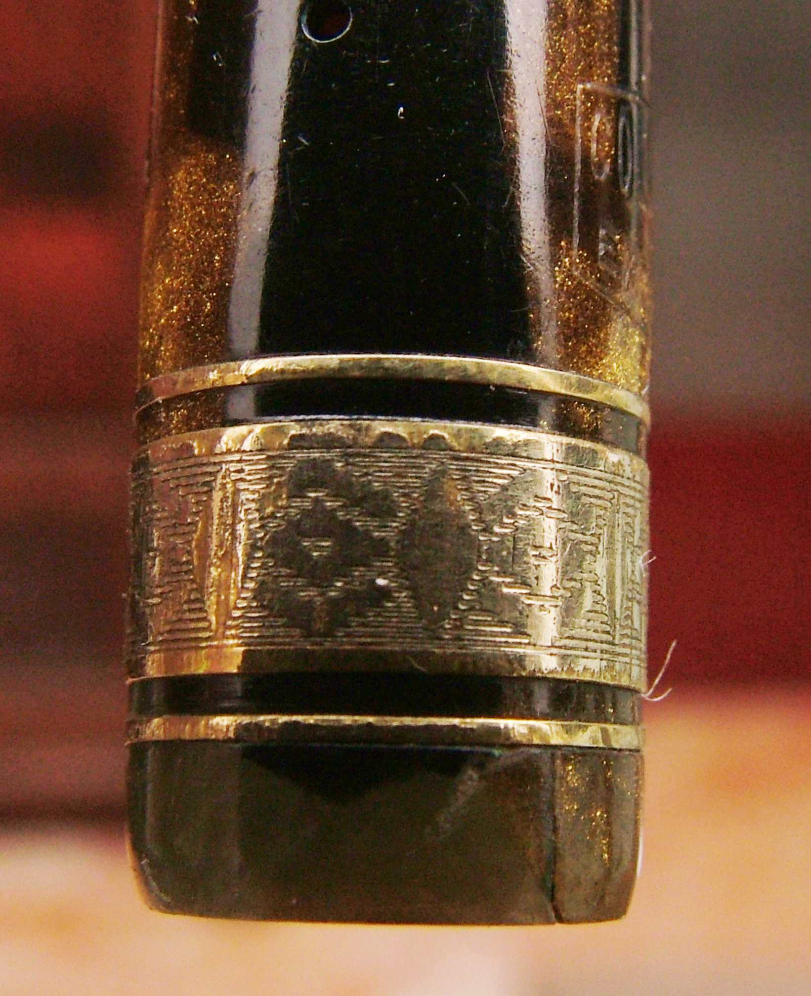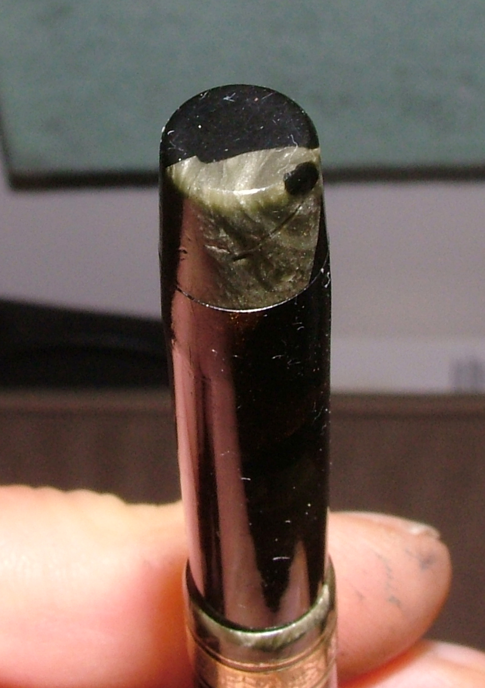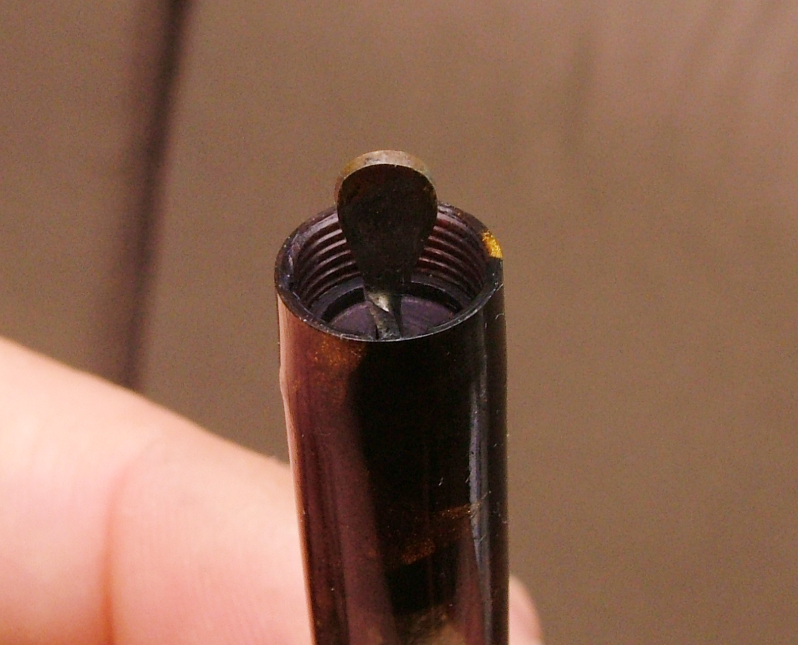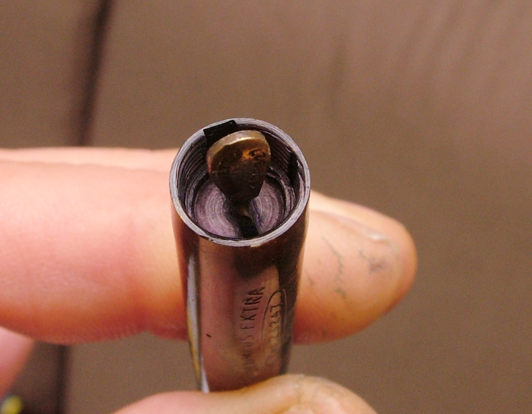 Ma veramente, ci sono dei particolari costruttivi in questa penna che la Montblanc se li sogna: la finezza con cui sono rifiniti gli apici ed è montato l'anellino, la veretta degna di una laminata del decennio precedente, la profondità delle incisioni, il sistema di caricamento in una penna così piccola, oltre alla scelta del blocco della celluloide color sottobosco in autunno. La Columbus secondo me, come la Ancora per parlare di manifatture Lombarde, lavorava benissimo, molto meglio di tante "blasonate per modo di dire".
