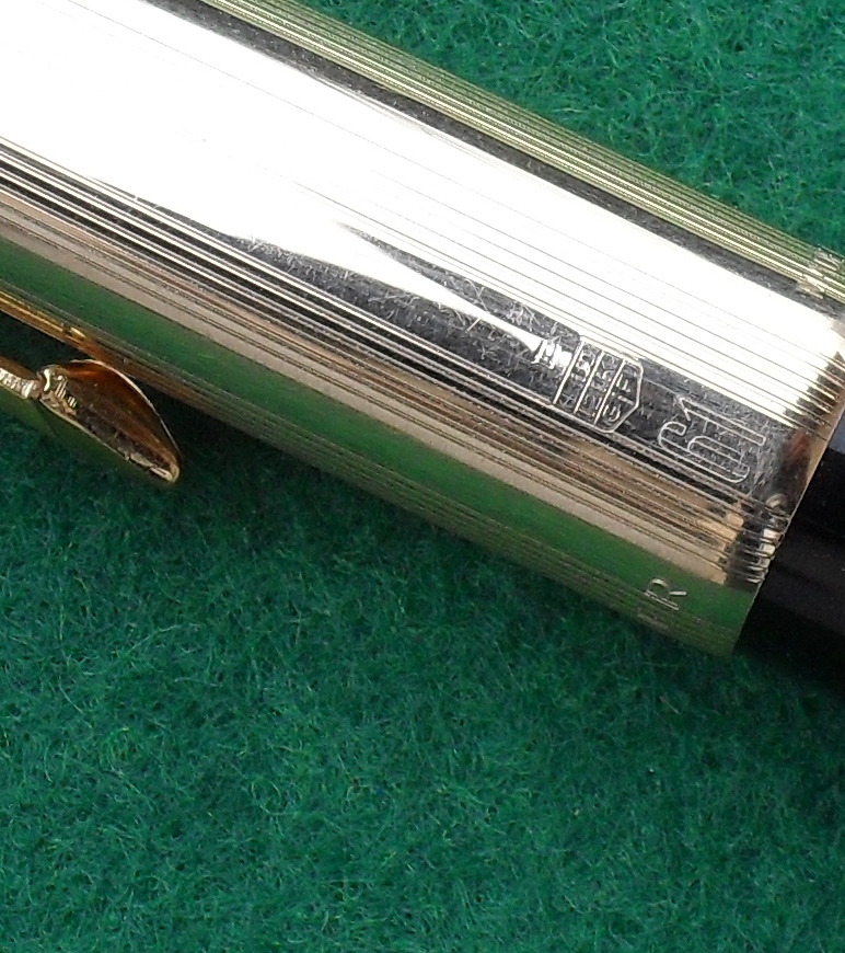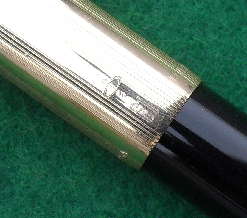 Apprezzo in modo particolare l’estetica di questa penna, senza dubbio elegante e con quel tocco in più rappresentato dalla freccia dorata intarsiata all’estremità della sezione. Il cappuccio è placcato d’oro, come afferma il crest stampigliato su un lato, sopra il numero del modello: Elegante anche il dettaglio dei due “gioielli” in resina madreperlata incastonati sulle sommità del cappuccio e del corpo, che creano un effetto piacevole di simmetria.