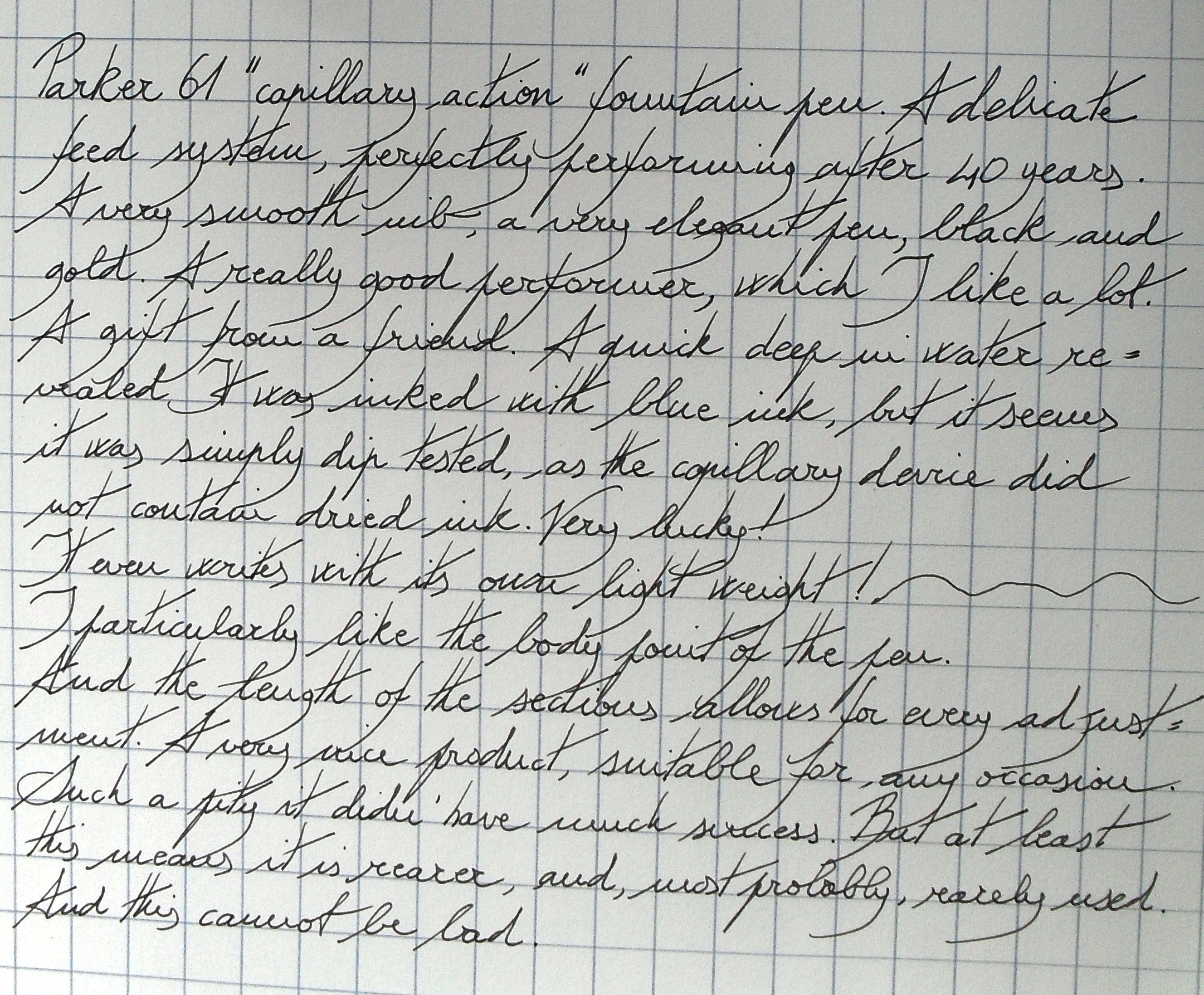 La leggerezza della penna, specialmente se viene utilizzata senza calzare il cappuccio, è notevole, ma non dà alcun fastidio e naturalmente abbassa l’affaticamento della mano nelle lunghe sessioni di scrittura. In complesso, si tratta di un’ottima stilografica, che anche oggi attira gli sguardi (ne ho avuta una conferma pochi giorni fa, in riunione) e che può farsi compagna fedele in molte situazioni.