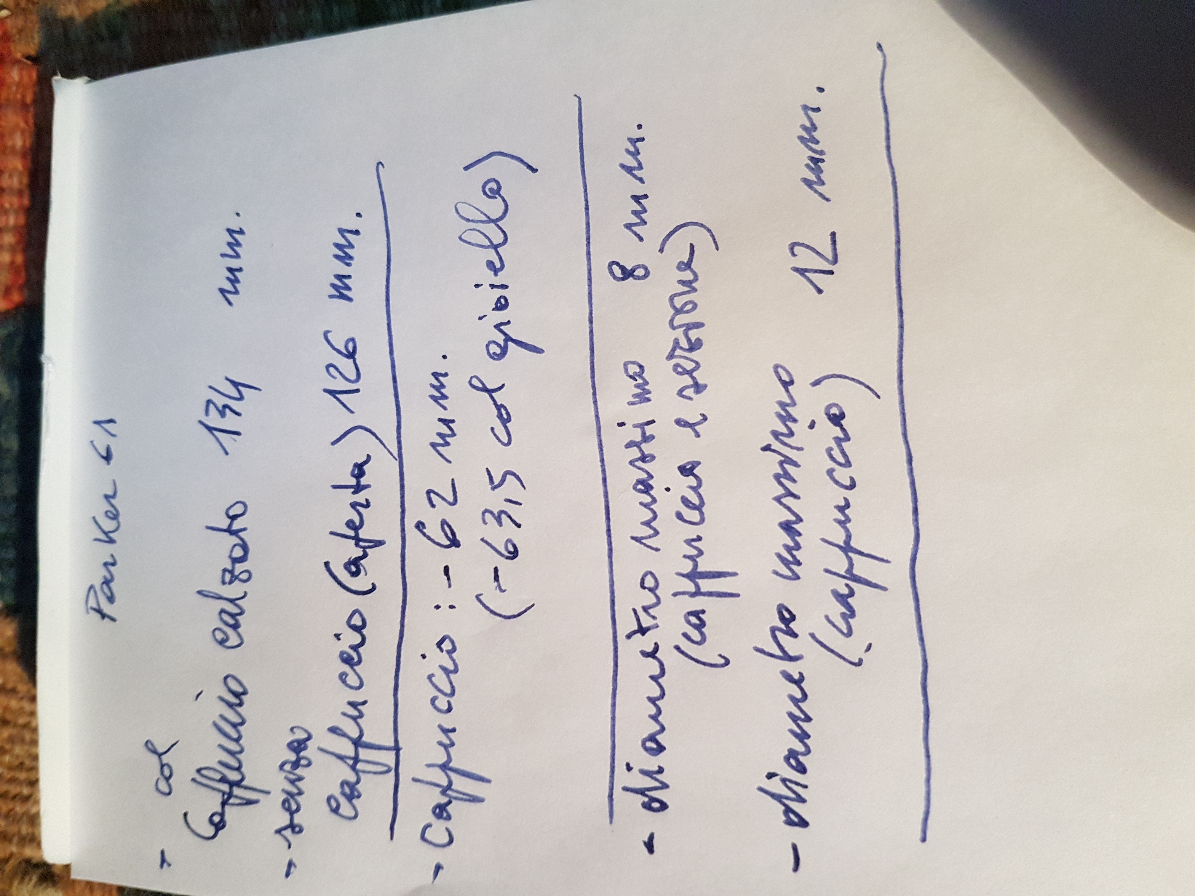 La Parker 61 (circa la quale troverete informazioni molto interessanti sul nostro ottimo wiki: https://www.fountainpen.it/Parker_61) si propose come l’unica stilografica del suo tempo capace di caricarsi da sola; e non solo: capace anche di rendere inutile l’uso di straccetti o carte varie per la pulizia dopo il caricamento. Mantenne le promesse? In parte, ed almeno per quella che è la mia modesta esperienza con l’esemplare che vedete, direi di sì. Questa 61 mk 1 “Custom” numero 29302, prodotta prima del 1962 (quando il cappuccio fu accorciato a 60 mm), mi è stata regalata alcuni mesi fa e proviene da alcuni fondi di magazzino. Pur scettico, specialmente dopo essermi documentato un po’, ho voluto provarla. Verificato che, con tutta probabilità, era stata inchiostrata solo per un "dip test" e che dunque fosse minimo il rischio d’intasamento del sistema a capillarità, ho proceduto come da manuale: svitato il corpo dalla sezione, ho immerso il serbatoio nel flacone d’inchiostro ed ho atteso una ventina di secondi.