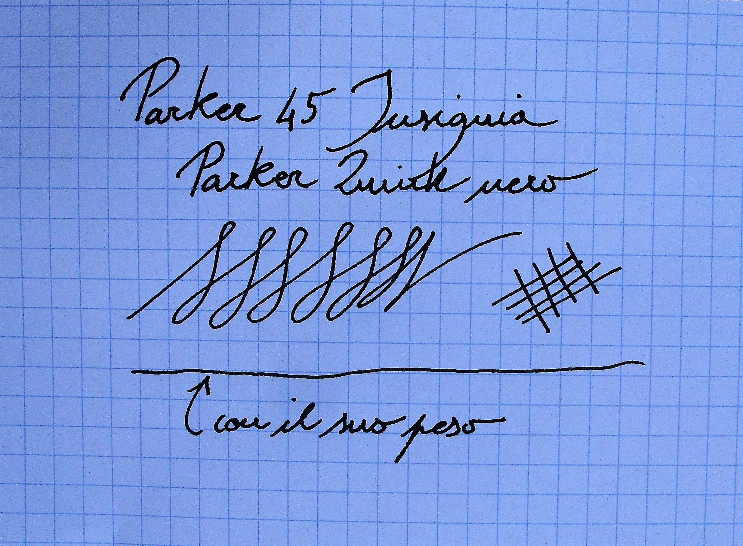 Peso del cappuccio: 8 gr (Flighter: 7 gr) Si tratta, naturalmente, di stilografiche molto moderne, almeno per me, che amo particolarmente quelle degli anni Trenta e le “eyedroppers”. Ma debbo riconoscere che la 45 è un modello piacevole esteticamente e molto funzionale, dotato anche di buone caratteristiche di scrittura. Questa non presenta alcun difetto, è caratterizzata da flusso sempre ben bilanciato, mai magro, e l’autonomia è ottima, grazie alle cartucce proprietarie Parker lunghe, con una piccola riserva d’emergenza. La scorrevolezza del pennino d’oro è migliore, almeno, negli esemplari che possiedo, di quella del pennino d’acciaio, che tuttavia rimane piacevole nell’uso, oltre che molto preciso.