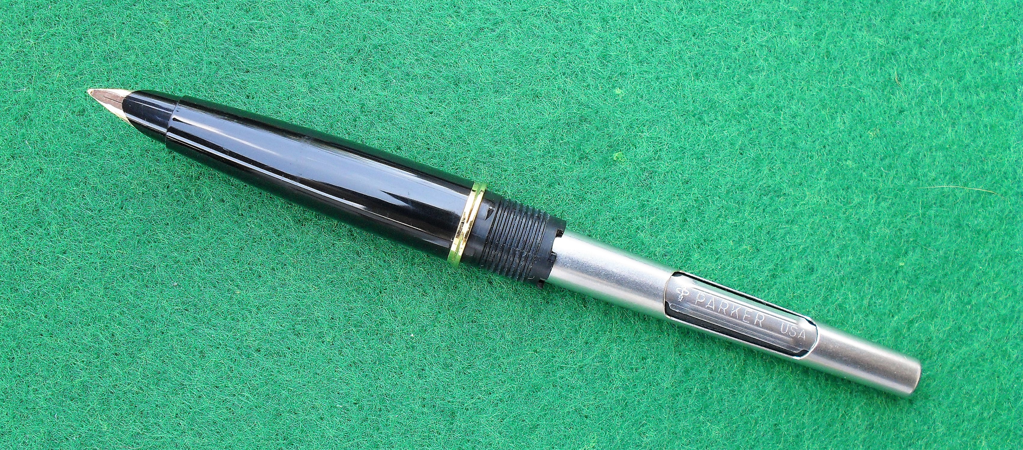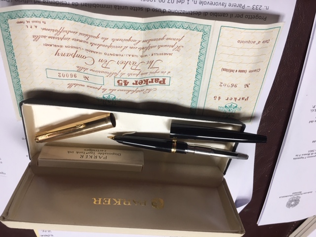 Mi sono imbattuto nella Parker 45 grazie alla gentilezza d’un amico, che tempo fa me ne regalò tre, usate e di tipo diverso. Mi piacquero molto la semplicità di manutenzione e la qualità di scrittura, così approfondii un po’ l’argomento. Ne scaturì un interesse specifico, che mi portò ad acquisirne altre, nel tentativo d’allargare la mia modesta collezione.