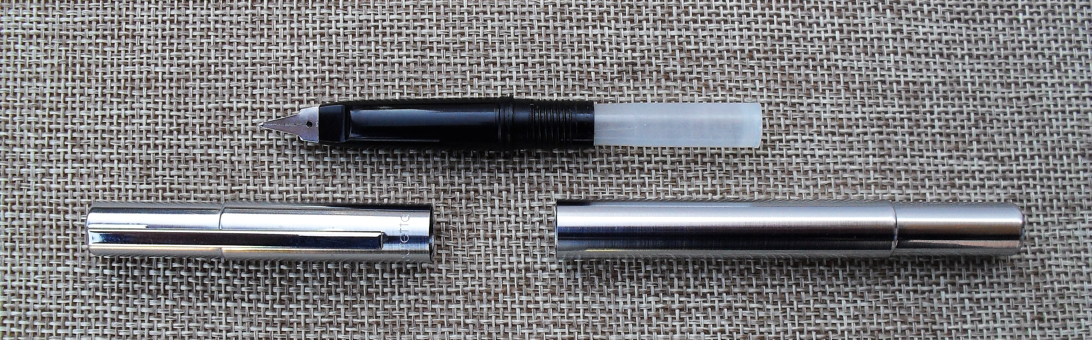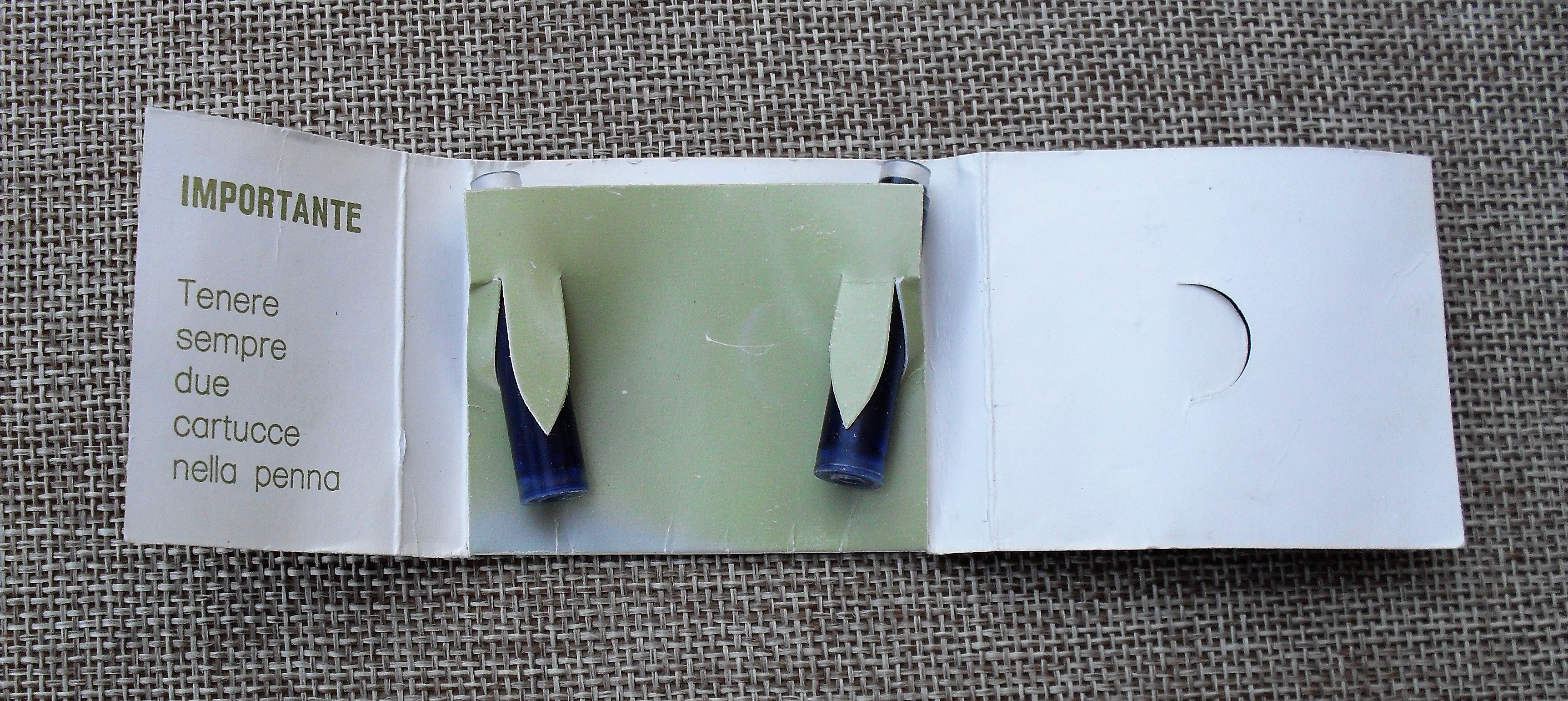 La scrittura si rivela piacevole: il pennino è rigido, ma scorrevole e con un certo grado di risposta, il flusso perfettamente adeguato. Le cartucce proprietarie sono del tutto particolari, a causa della grandezza della bocca d’innesto, ma il set mi è pervenuto, grazie alla cortesia del venditore, con una cartuccia vuota intonsa, che ovviamente è adattissima al riempimento con una siringa.