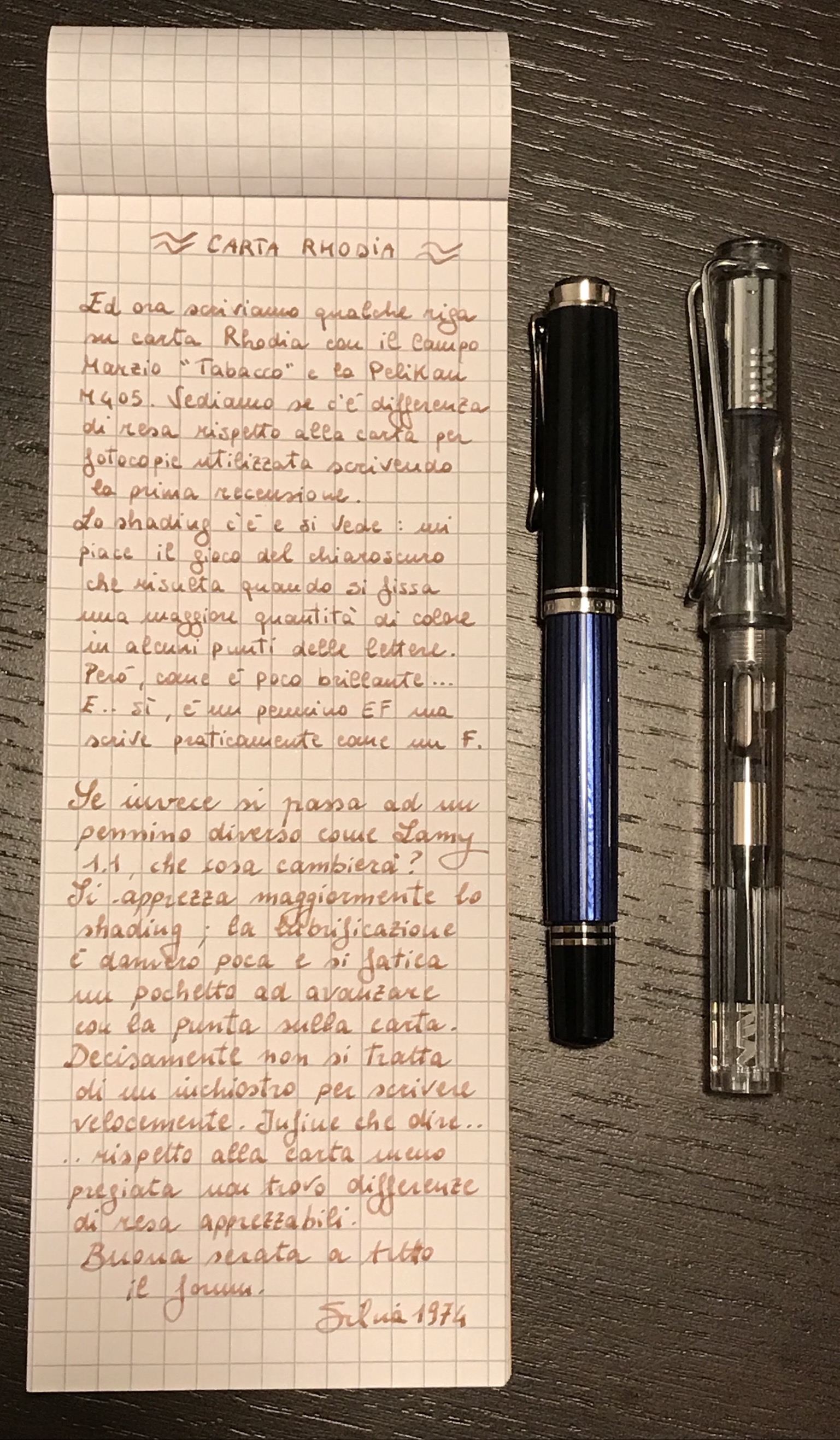 E buono che ho imparato che per ogni recensione è meglio produrre sempre due fogli di carta diversa. Ne ho appena terminata una per un inchiostro Herbin, che posterò quando avrò scansionato per bene i due fogli. Su carta Rhodia, l’esito è quasi opposto a quello emerso su carta ordinaria. Almeno così è utile davvero