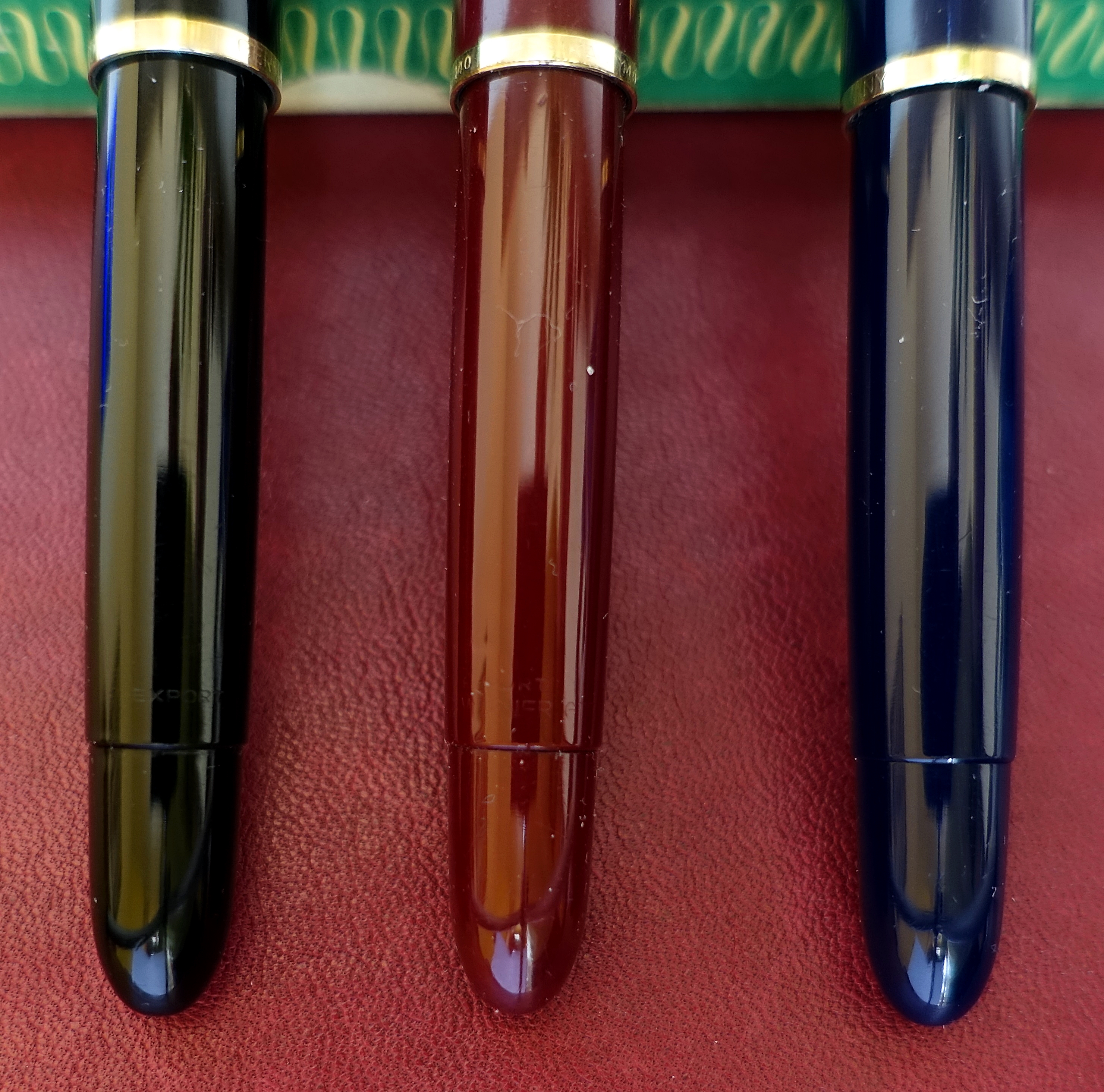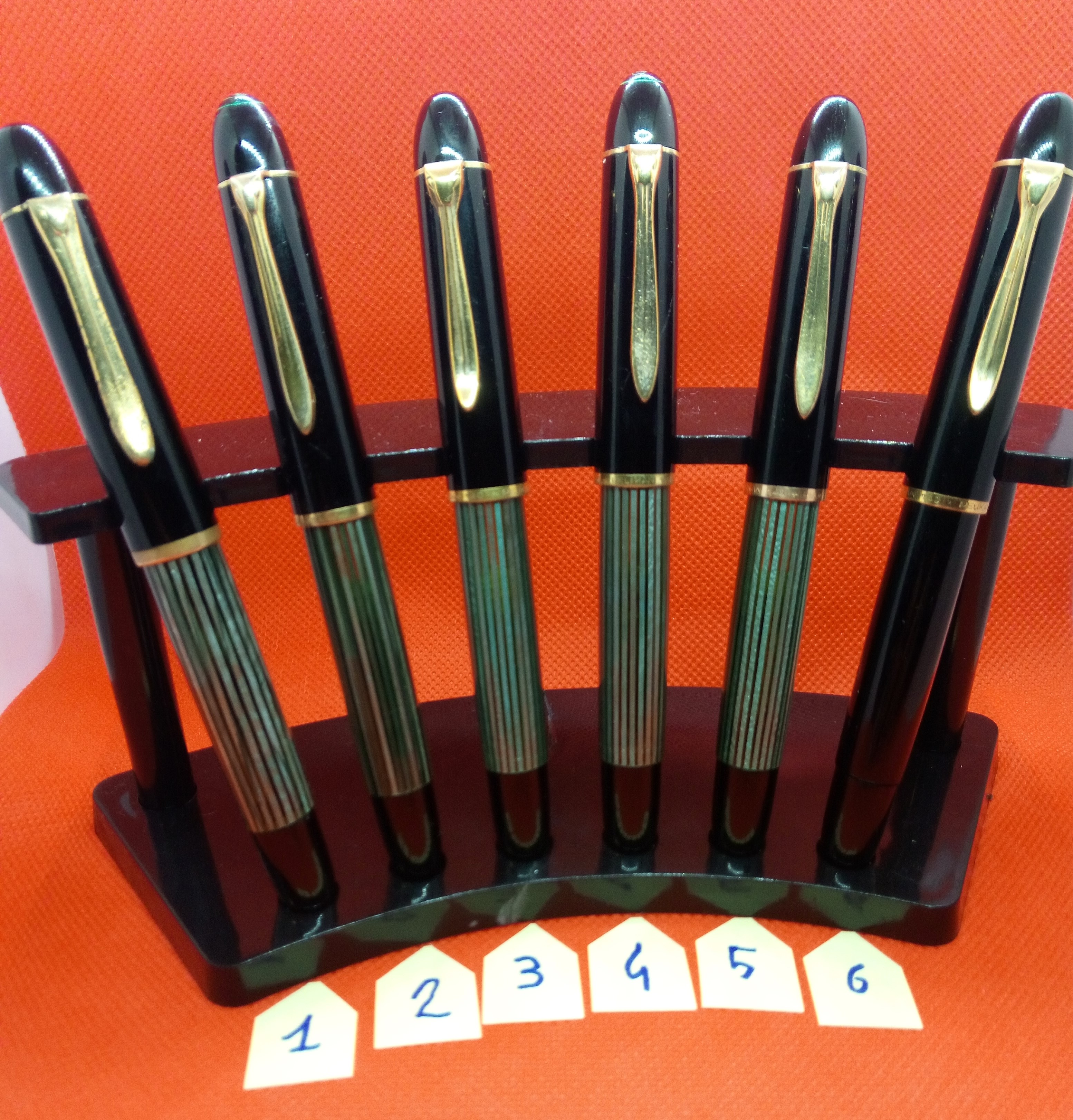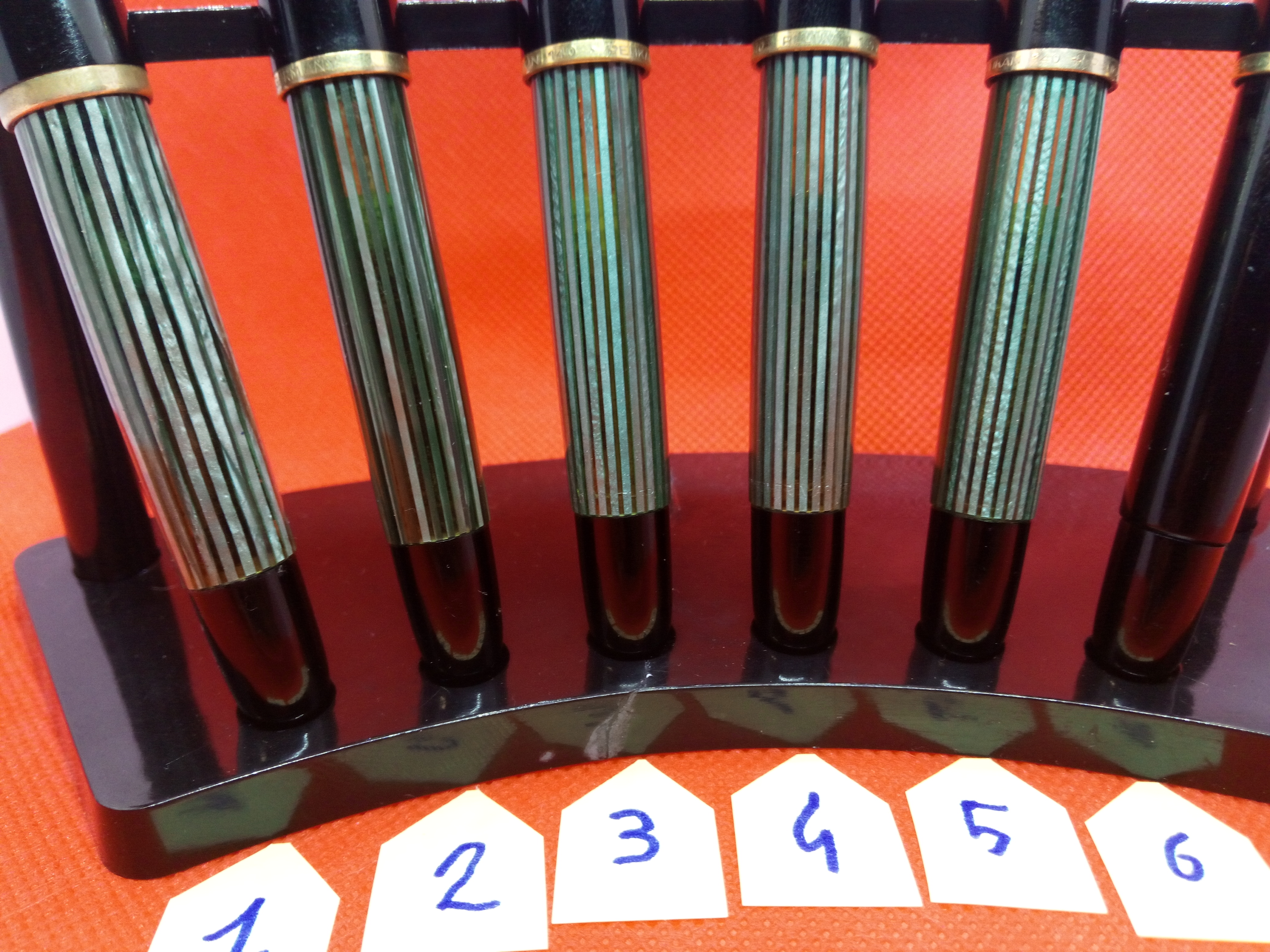 A prima vista, dalle striature di queste penne, mi verrebbe subito da dire che la 1 e la 2 sono piu` antiche delle altre. Questo perche` hanno delle fasce verdi piu` larghe e l`effetto madreperlato e` piu` vistoso.