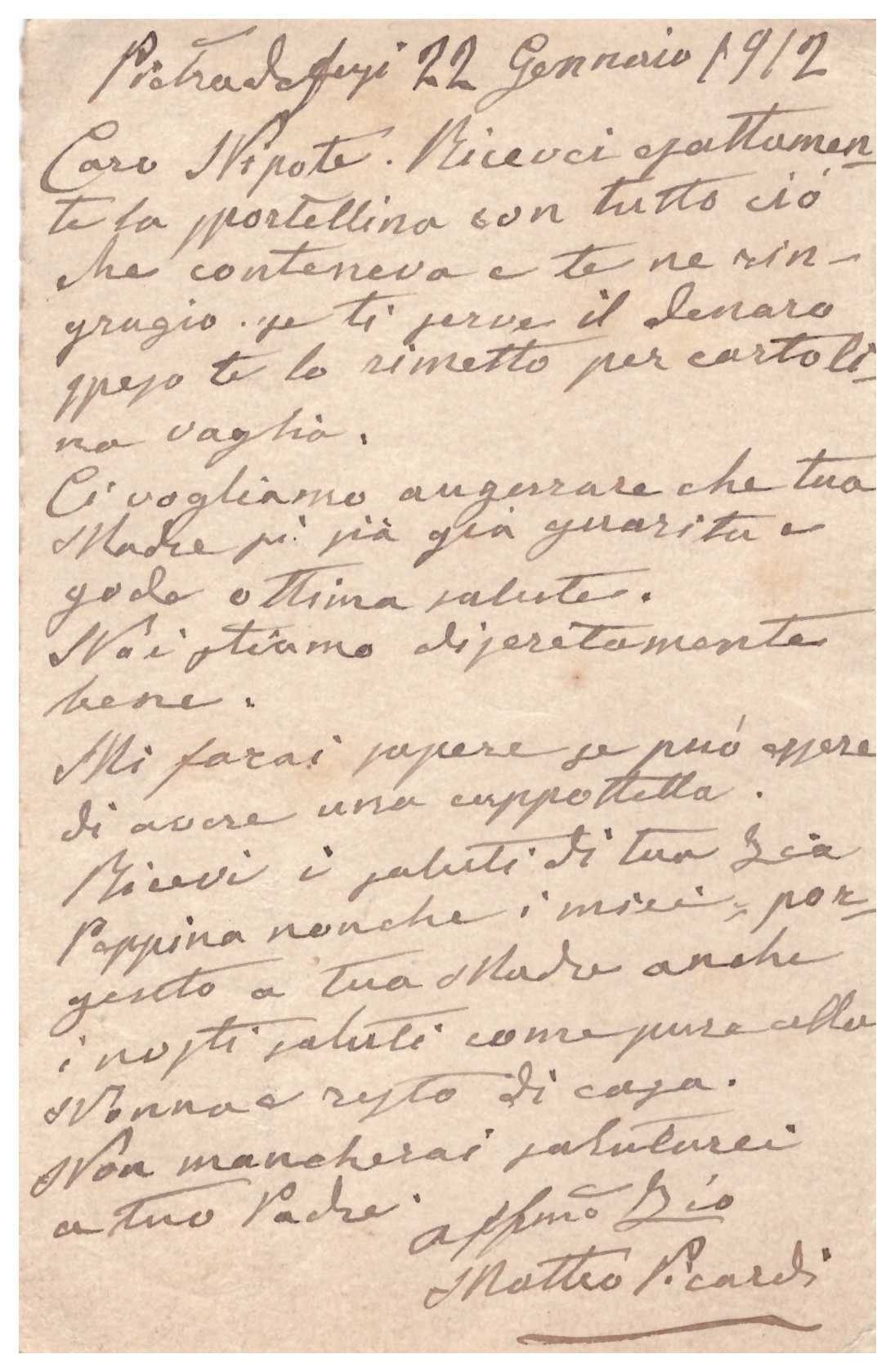 Altra domanda: visto il periodo e la zona, secondo voi questa lettera è stata scritta di proprio pugno da zio Matteo o è stato uno scribacchino a farlo per lui?