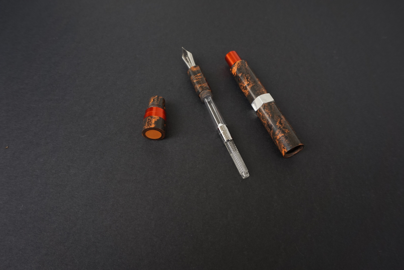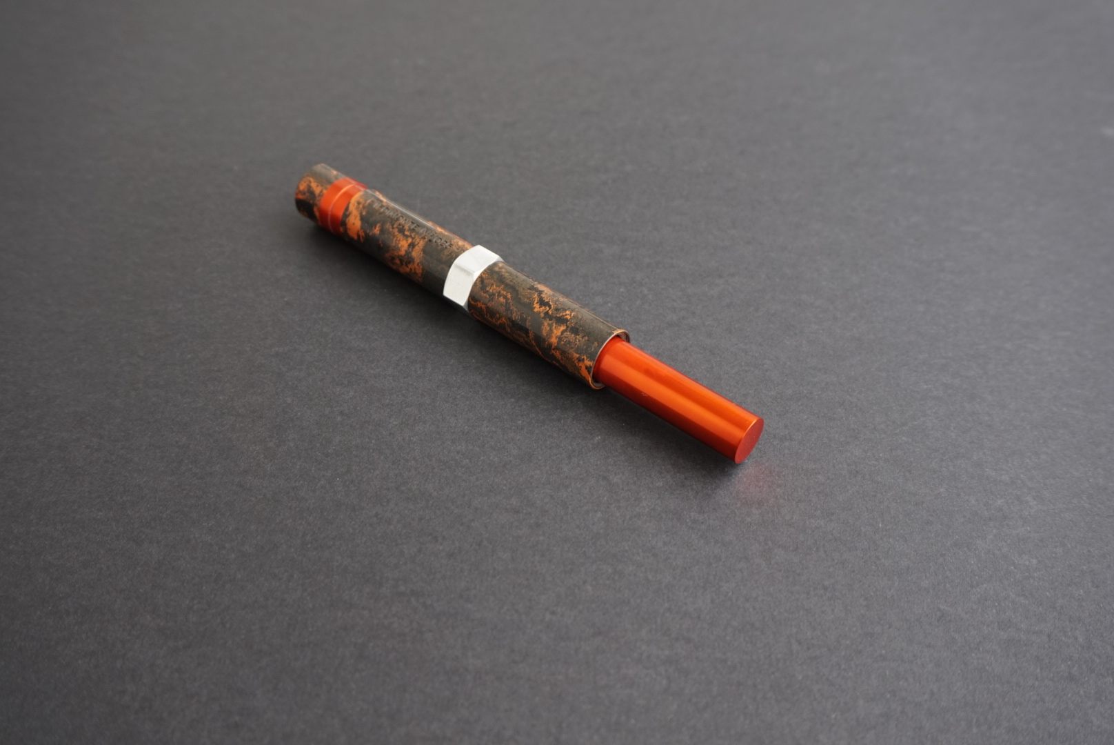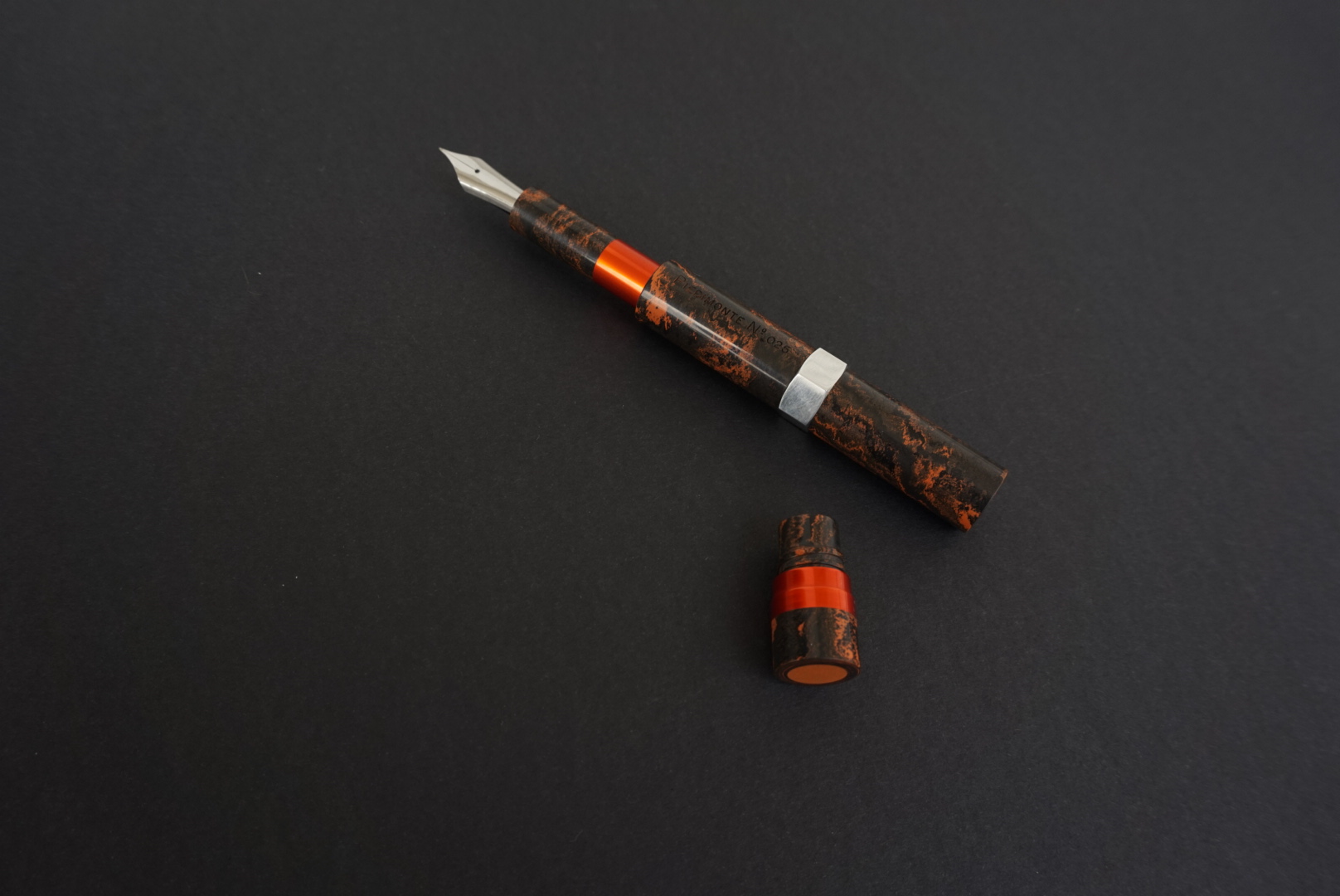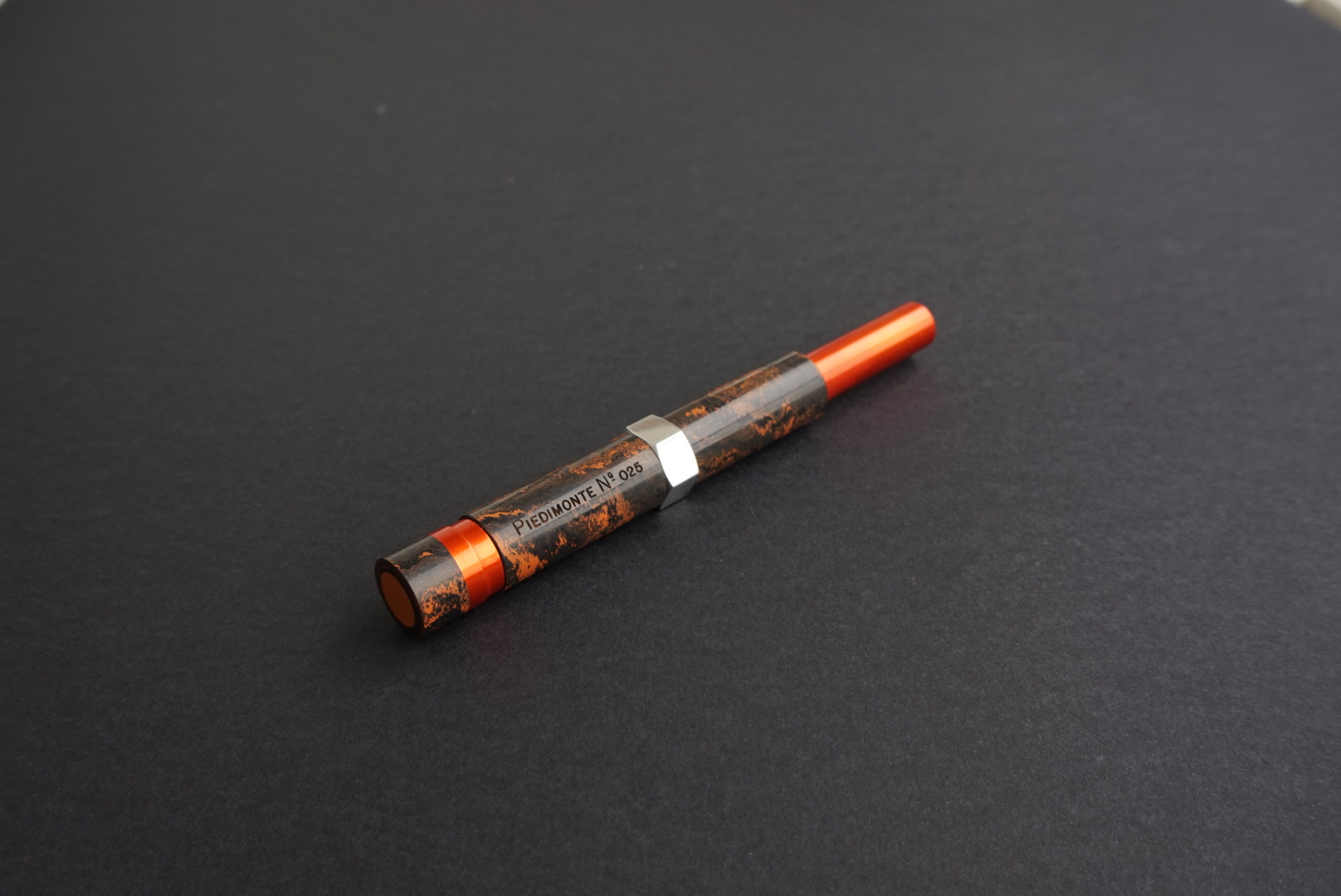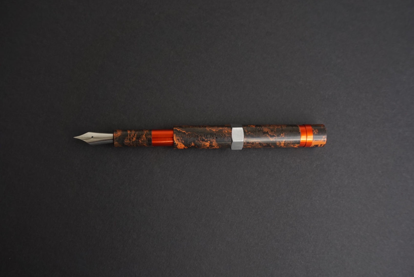 In effetti hai ragione, il progetto iniziale prevedeva anche l'esagono con lo stesso colore degli altri pezzi (rosso/arancio). Ultimamente mi sto appassionando anche alla pratica di anodizzare l'alluminio, non è una cosa difficilissima, ma come tutte le cose ci vuole un po' di pratica. Purtroppo quando ho immerso i pezzi nel bagno d'acido per effettuare l'elettrolisi per creare uno strato d'ossido, mi sono accorto che il pezzo esagonale era diventato di un colore molto più scuro rispetto agli altri. Credo perché la lega d'alluminio dell'esagono non sia uguale agli altri pezzi, quindi ho optato per un colore naturale e con una bella lucidata alla mola di panno è uscito questo colore silver cromato. Diciamo che riprende il colore del pennino.
