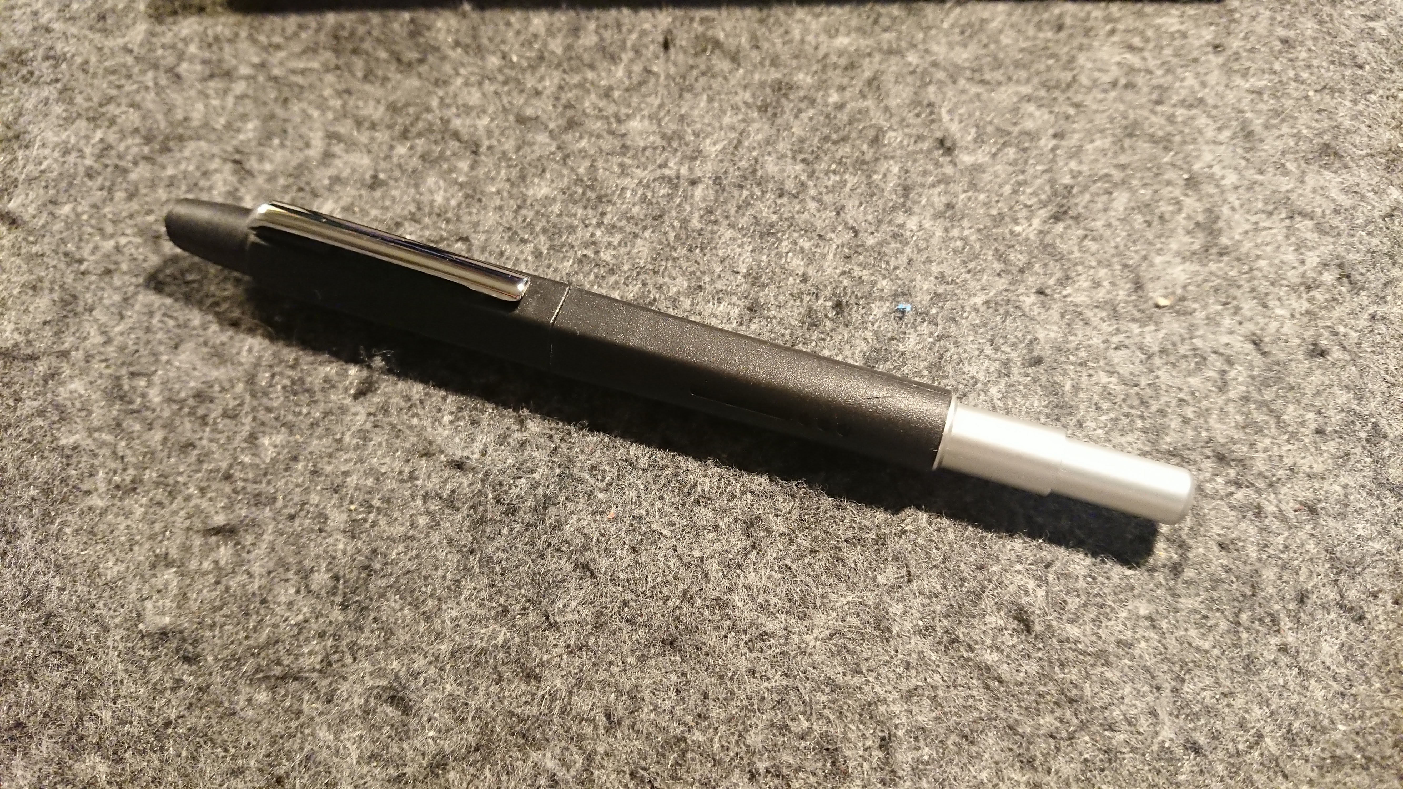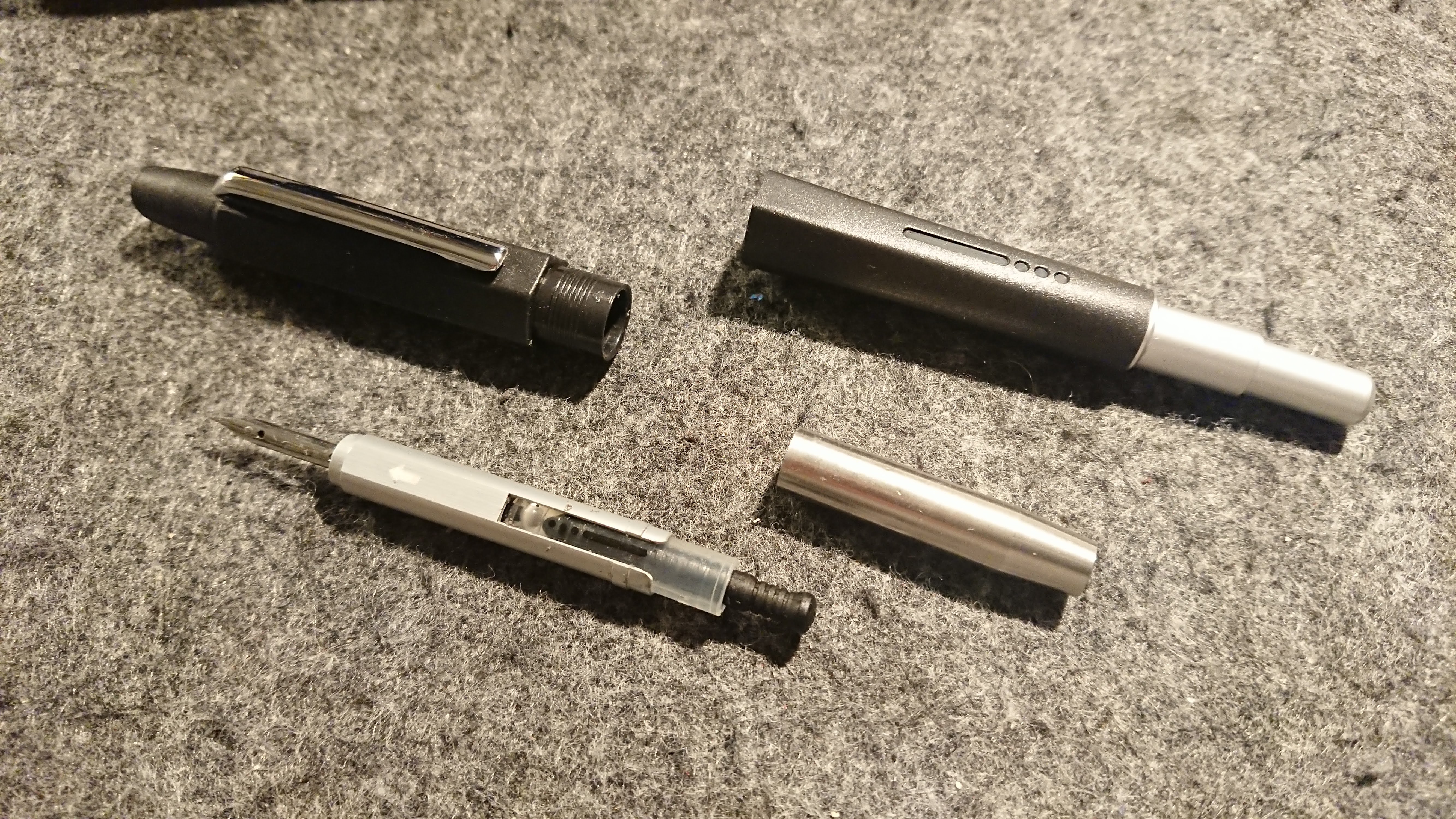Il meccanismo di estrazione e rientro pennino deve rodarsi, ha un movimento morbido con qualche blocco, il tutto migliora mettendo un filo di grasso siliconico sia sul cilindro porta pennino che sul pistoncino interno del pulsante. Il coperchietto rimane in vista... molto "steampunk".