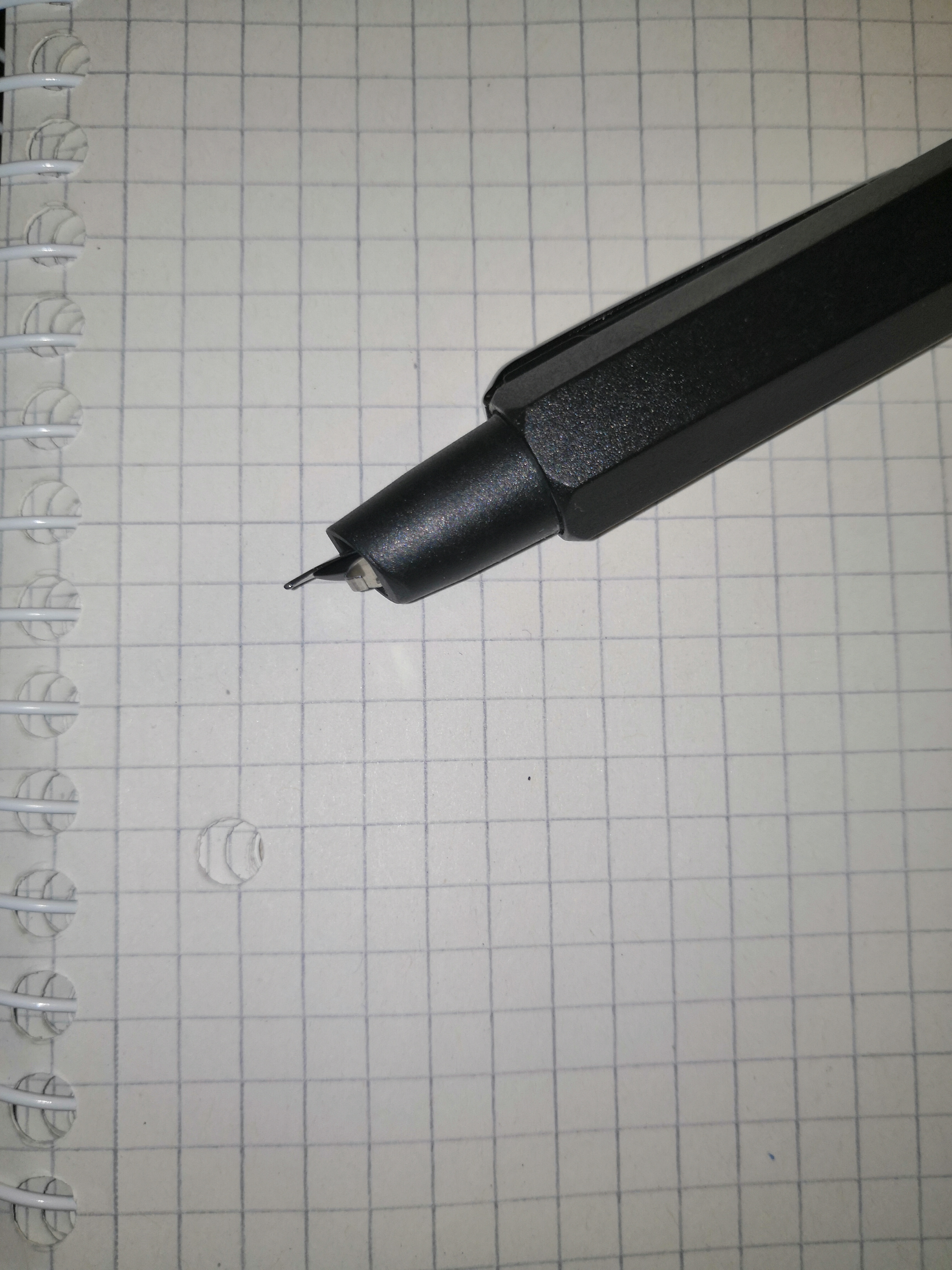 6. Il meccanismo di apertura/chiusura a pulsante ha bisogno di un po' di rodaggio: all'inizio scorre in maniera ruvida e il tasto tende a bloccarsi. Dopo un po' di uso quotidiano è diventato più scorrevole (...non come la Capless!) e non si è mai bloccato. Premendo il tasto per estrarre il pennino, questo fuoriesce spingendo una linguetta metallica che chiude il foro quando il pennino è retratto, impedendo l'essiccazione dell'inchiostro. Un meccanismo semplice che però resta un po' visibile quando si usa la penna, conferendole un aspetto leggermente approssimativo.