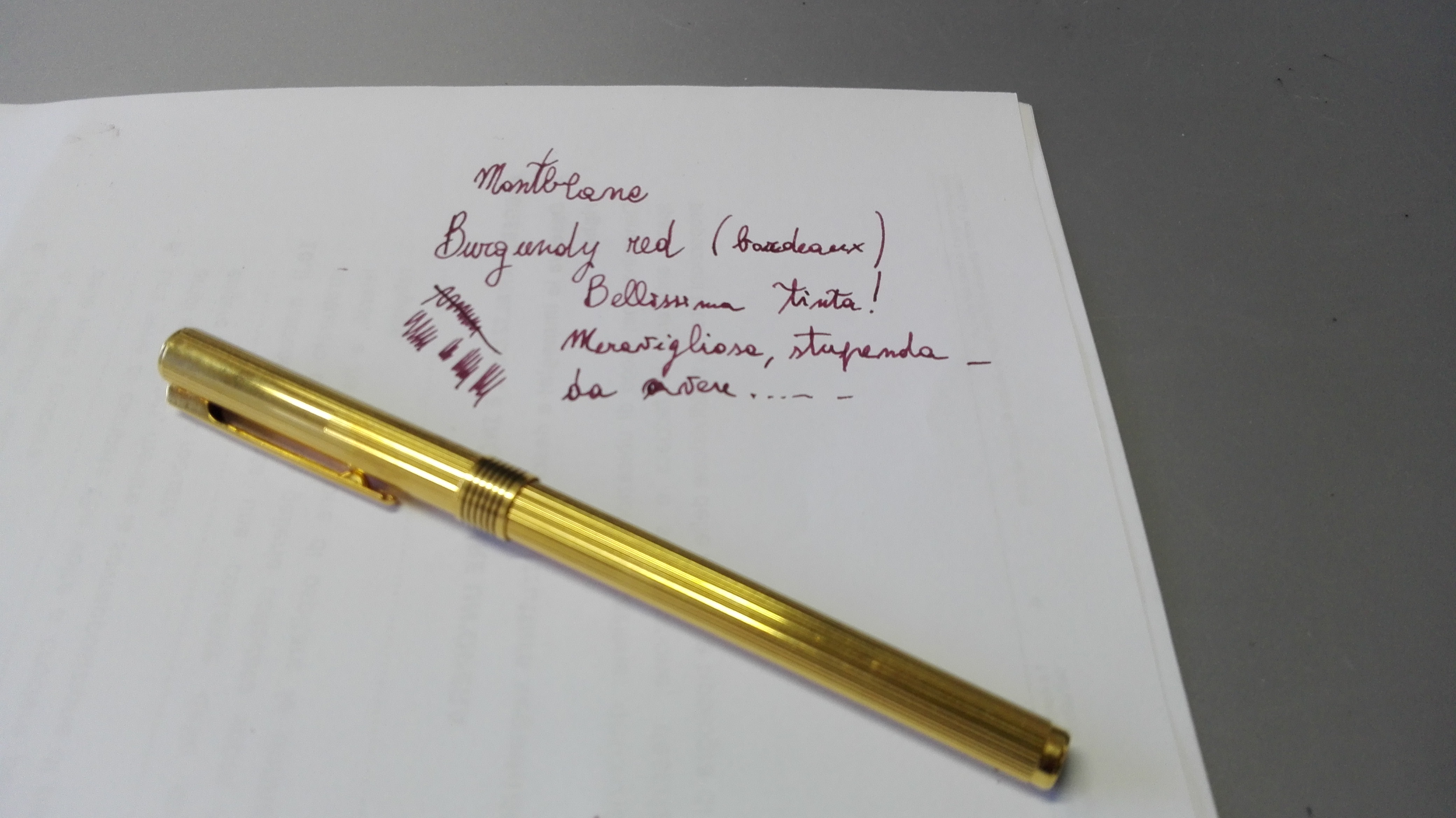 Non sono riuscito a fare una scansione migliore, osservo che nella scansione il colore tende al viola. In realtà su carta è molto più rosso! Non è un violetto, assomiglia al colore "Merlot" della Diamine, ma questo Montblanc è più rosso e meno violetto. Secondo la Montblanc vuole imitare il colore dei vini della Burgugna (Burgundia in tedesco, da qui il nome) con una punta di rosso fiammeggiante (quasi-assente nella scansione, abbastanza presente nella realtà).... a voi il giudizio
