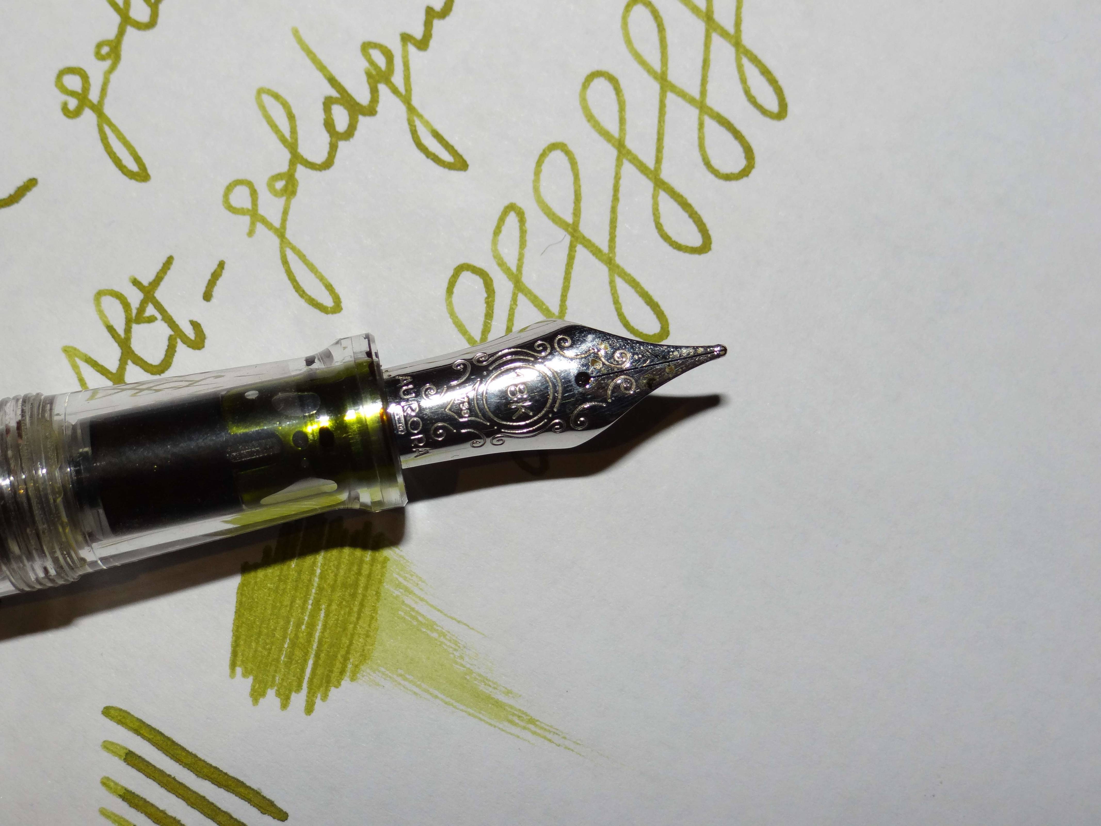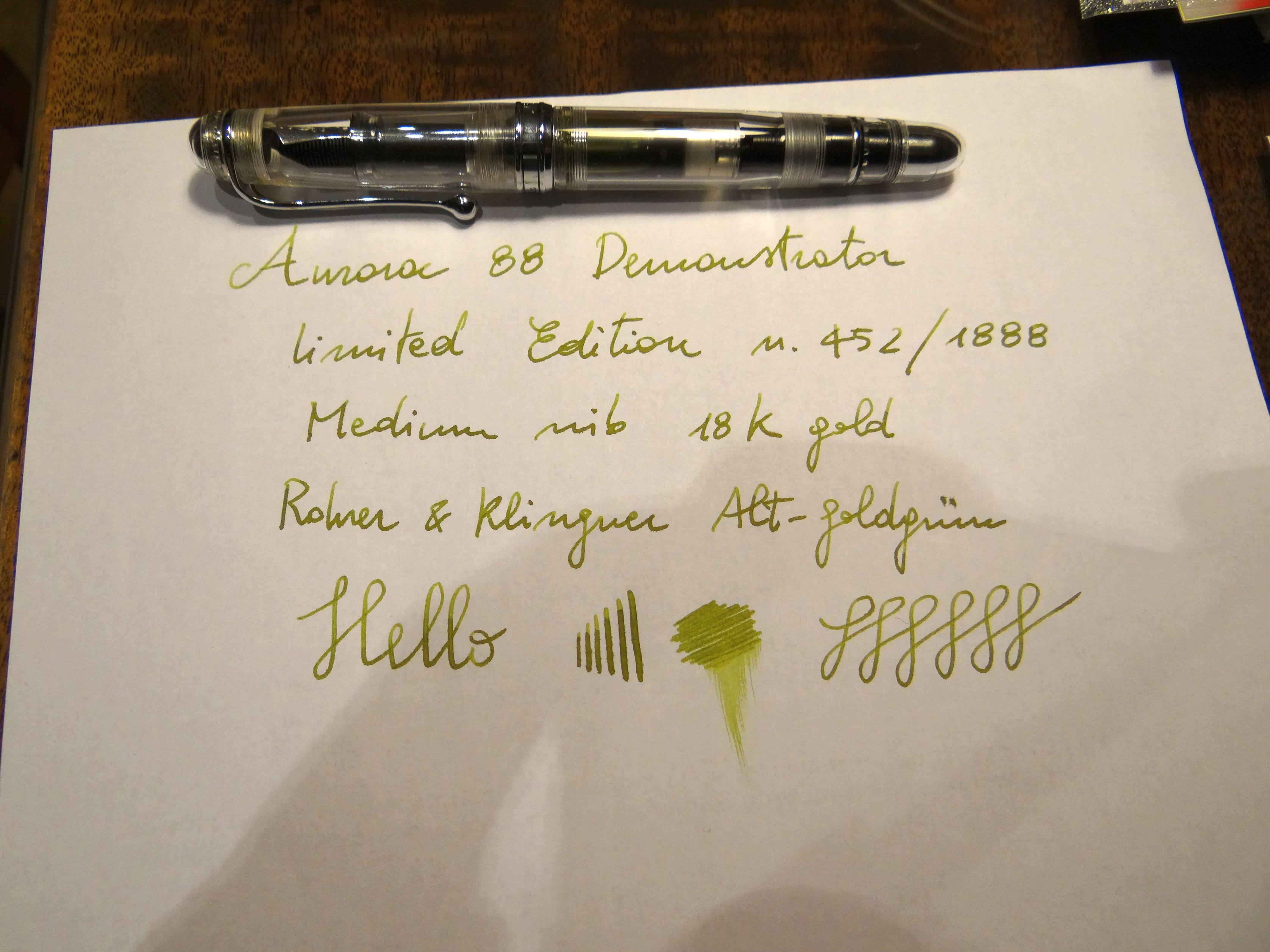 Aurora 88 Demonstrator. Pennino oro 18k medio. Inchiostro Rohrer & Klingner Alt-Goldgrün (verde d'oro antico).