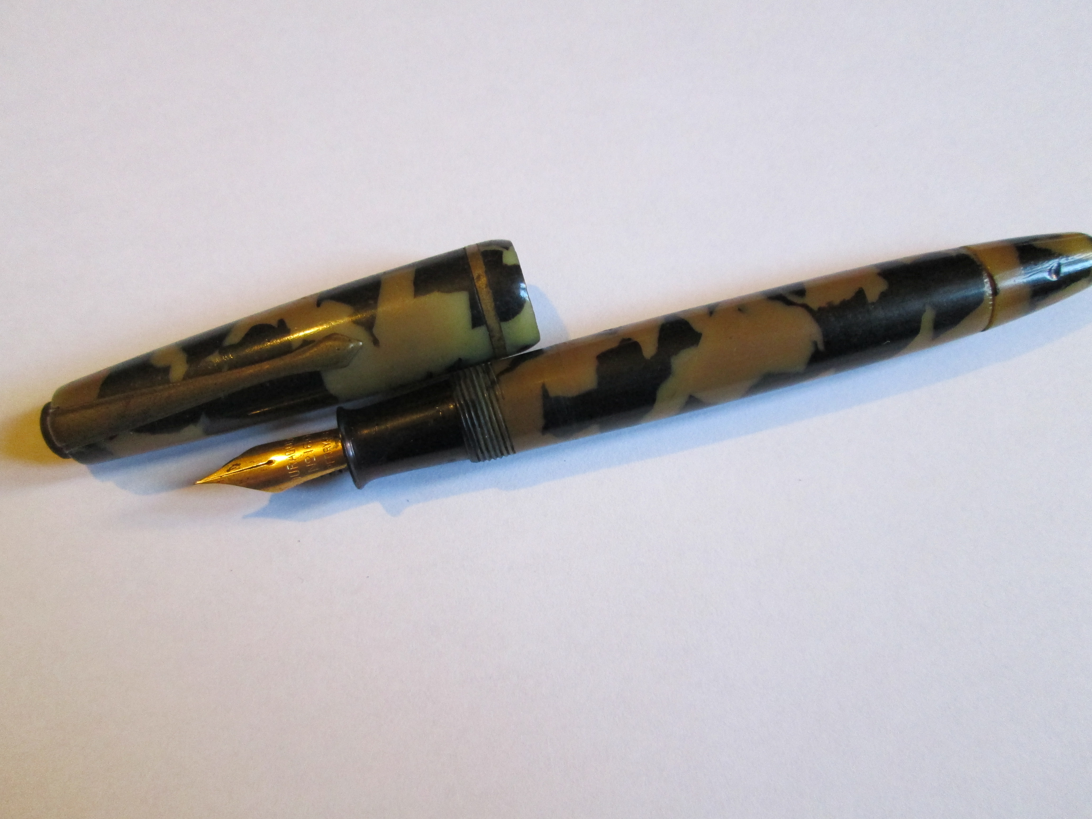 può darsi che mi sbagli, ma due non mi paiono waterman (quella bellina ma rotta a lisca di pesce verde e nera e quella successiva giallo-nera). le altre sono due waterman recenti (della prima non conosco il modello, la quarta è un'agorà) e una waterman inglese degli anni 40-50. Una 503?