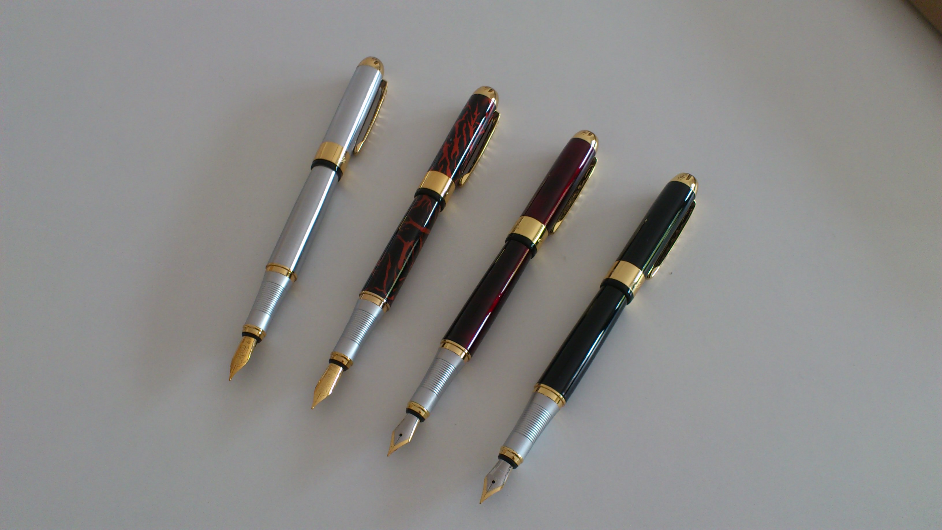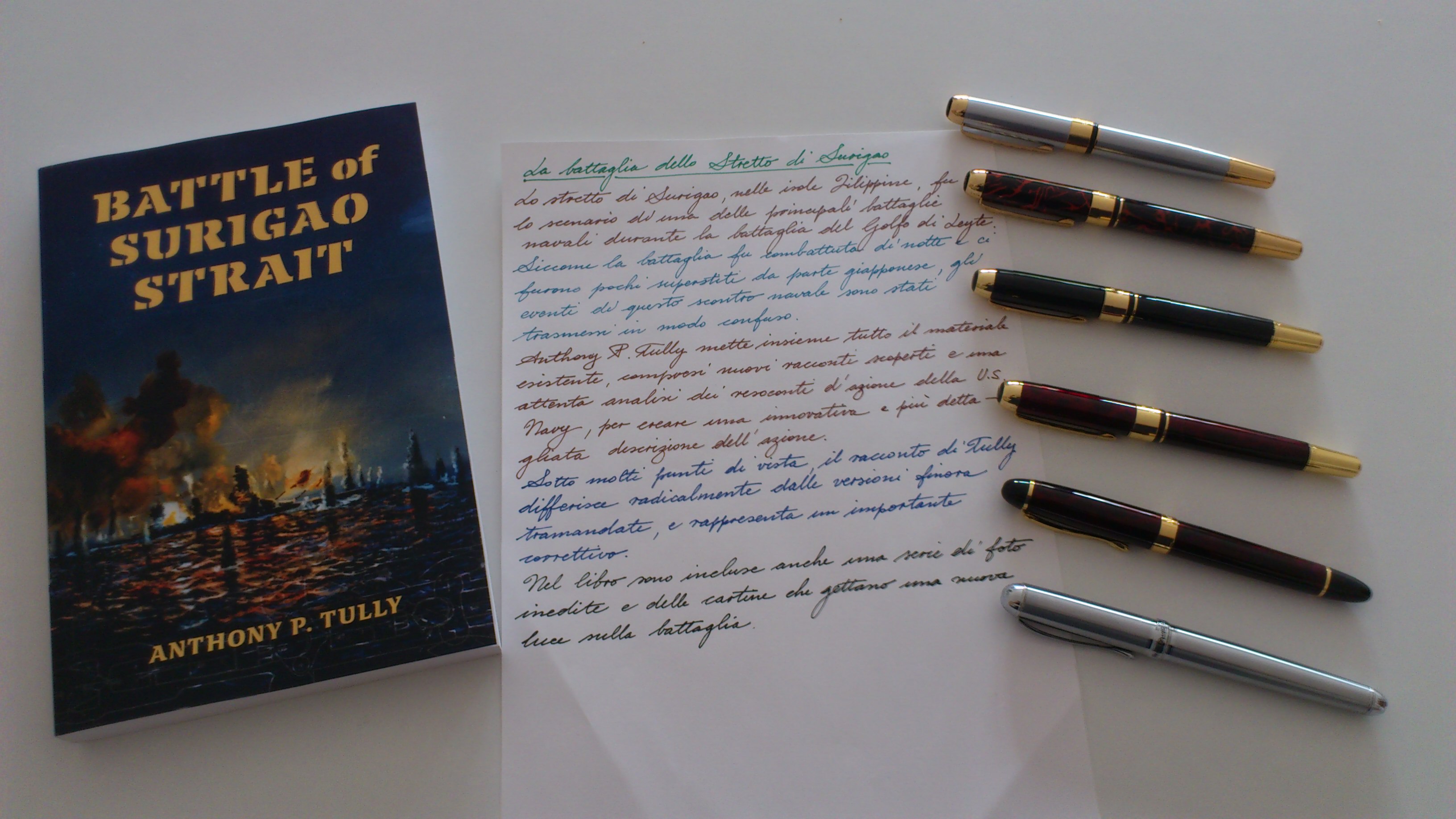 Ecco le penne: Ed ecco una prova di scrittura di tutte le mie Jinhao (le 4 "250", la 450 e la x750), con la traduzione della quarta di copertina del libro di Tully "La battaglia dello Stretto di Surigao" (parte della battaglia di Leyte) nel 1944. La traduzione è mia.