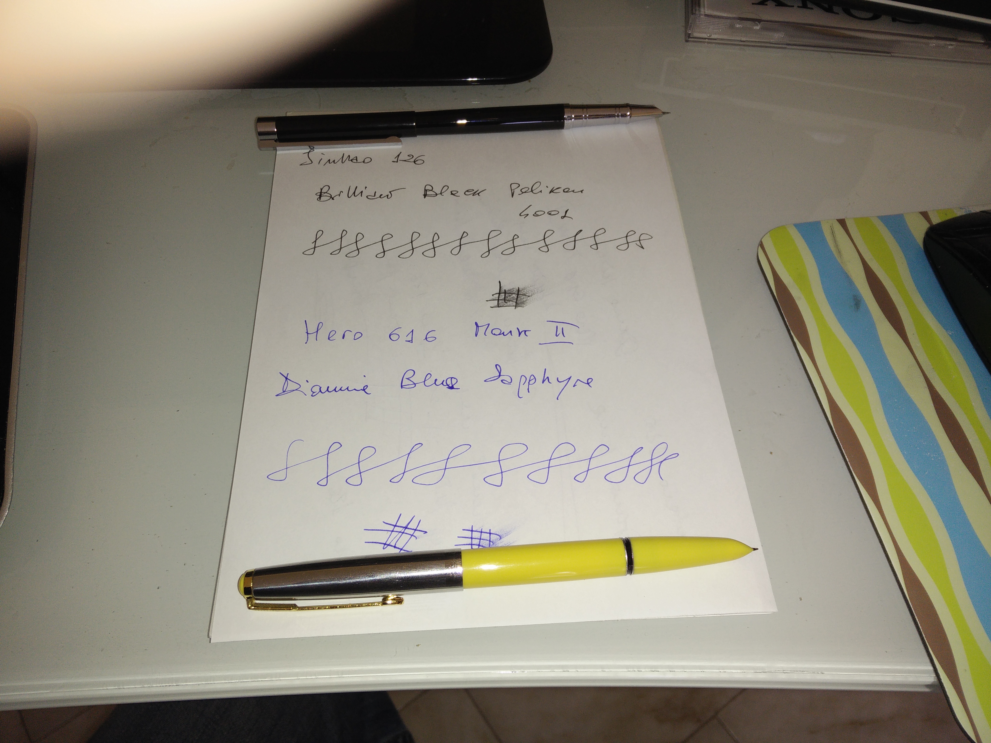 Gli inchiostri usati sono, nell'ordine: Iroshizuku Shin Yoki, Marlene Brown, Parker Blue-Black, Waterman Absolute Brown, Pelikan 4001 Blue Royal, Pelikan 4001 Nero Brillante.
