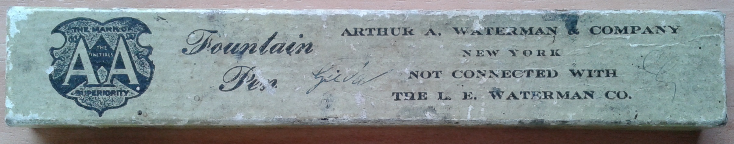 La stilografica in presentazione potrebbe essere stata prodotta fra il 1910, data dell'ultimo brevetto citato, ed il 1912 quando fu reso obbligatorio il disclaimer "Not connected with the L.E. Waterman Co.". Allora il disclaimer venne stampato anche sulle scatole, ma la penna non ce l'ha. Potrebbe essere stata prodotta proprio durante la discussione della causa, per mandare avanti la produzione senza buttare via il manufatto in caso di condanna a non più utilizzare il nome "A.A. Waterman".