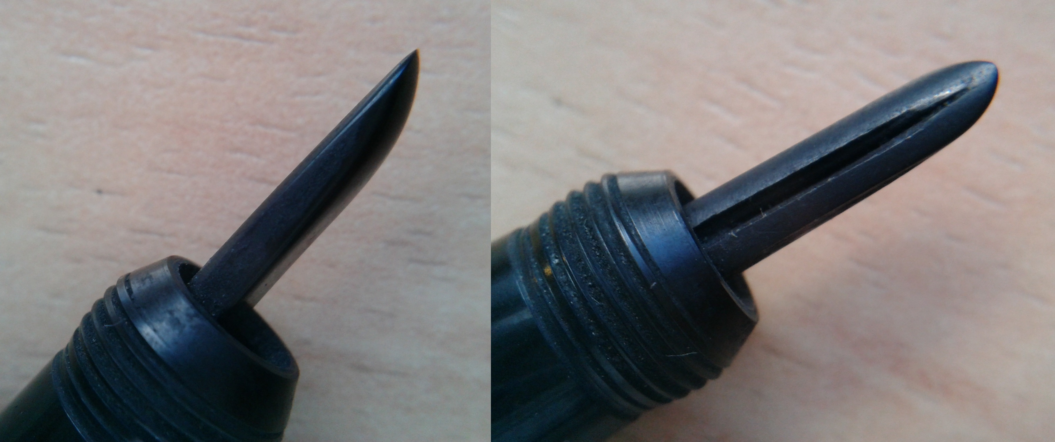 La mia ha ancora il suo pennino: un Modern New York N.3 estremamente burroso, ed ha pure una antidiluviana clip arrugginita che ha intaccato in parte l'ebanite del cappuccio