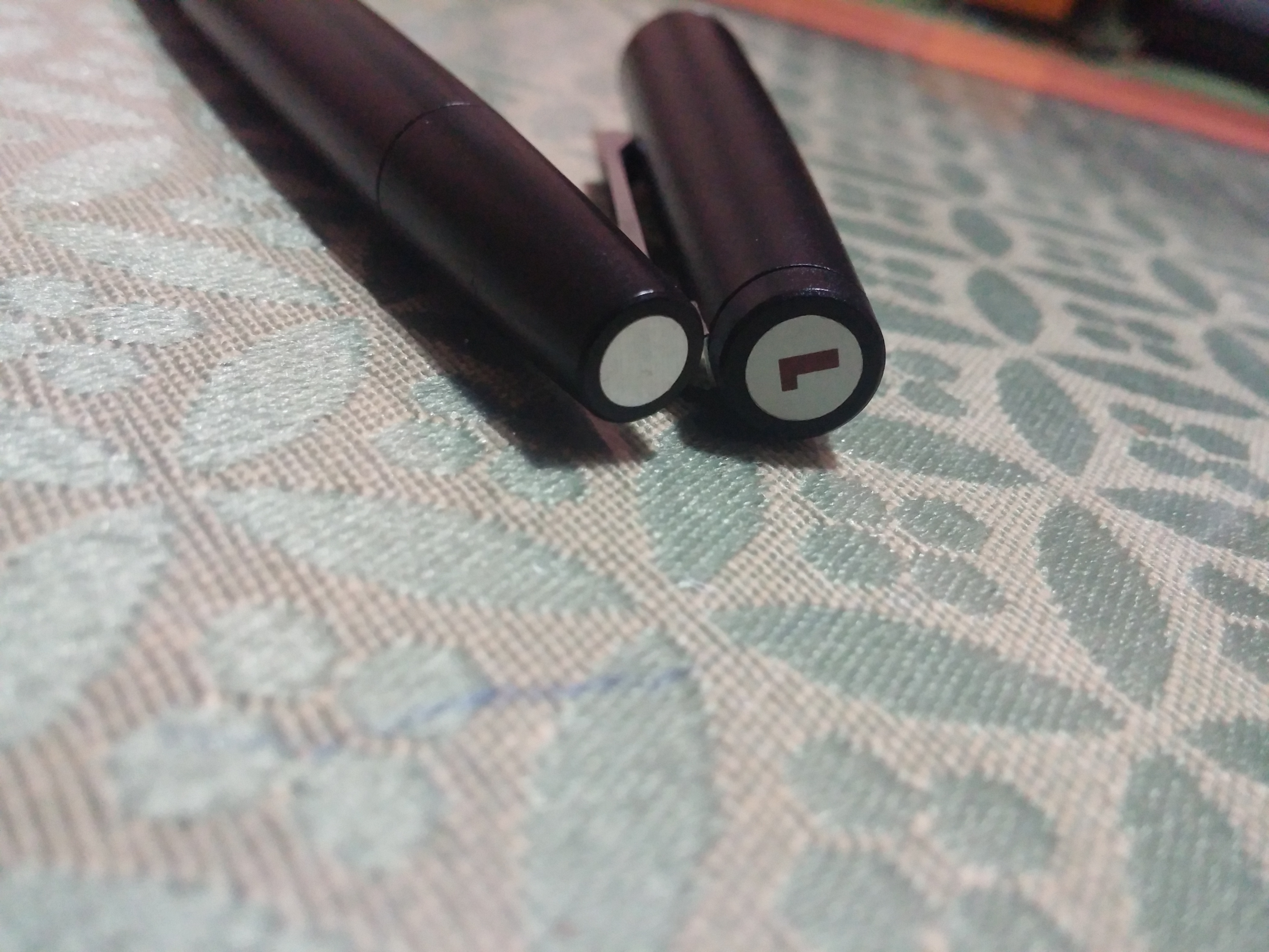 Flat top e bottom il corpo e il cappuccio dimagriscono verso le estremità e terminano bruscamente in due sezioni rotonde con al centro un cerchio in alluminio vuoto dalla parte del fondello e con una 'L' sul cappuccio.