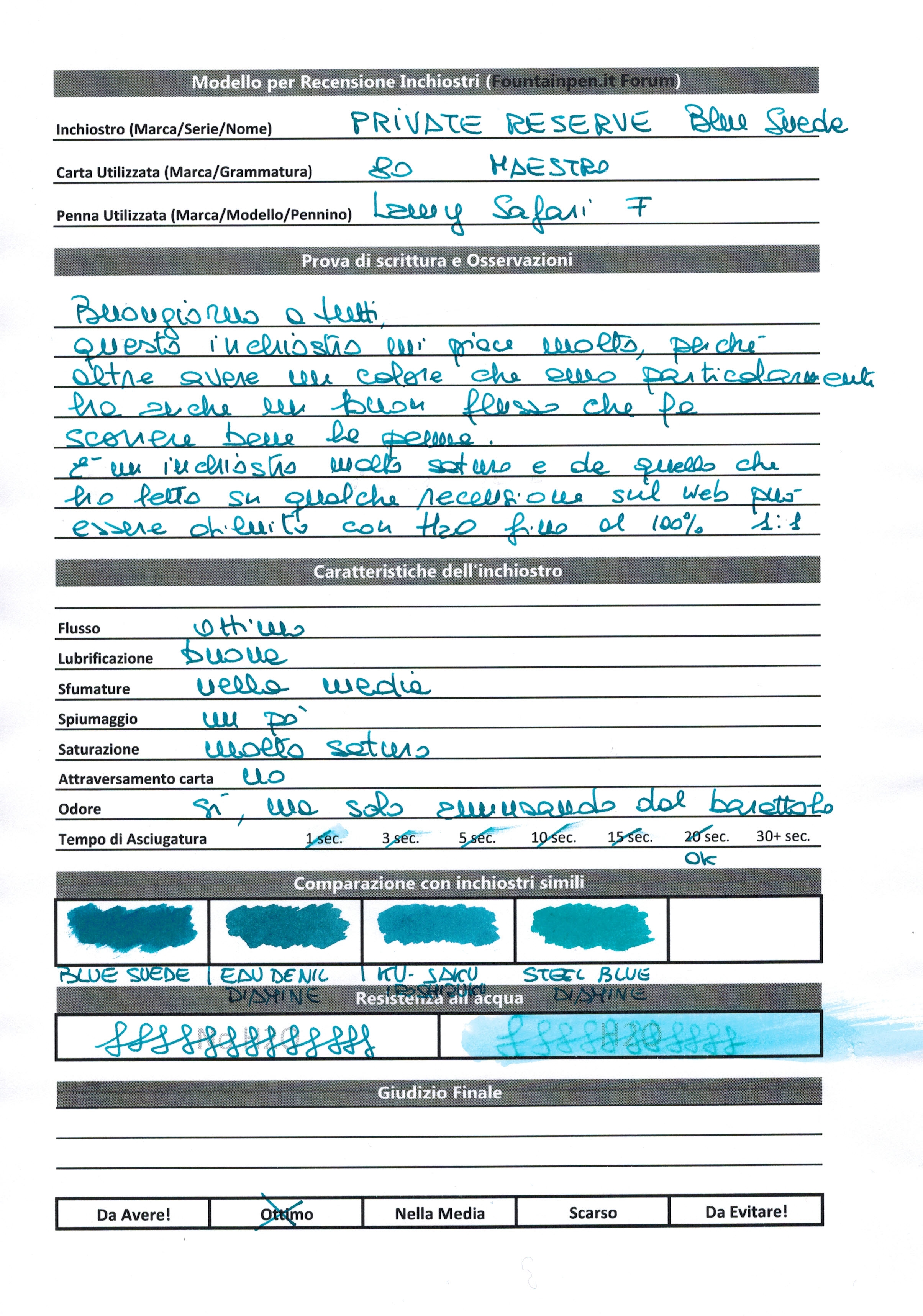 Buongiorno a tutti, vorrei segnalare questo inchiostro Private Reserve Blue Suede, un inchiostro con un bel flusso e una buona saturazione, non è proprio blu, ma dà più sul verde, un Teal chiaro direi.