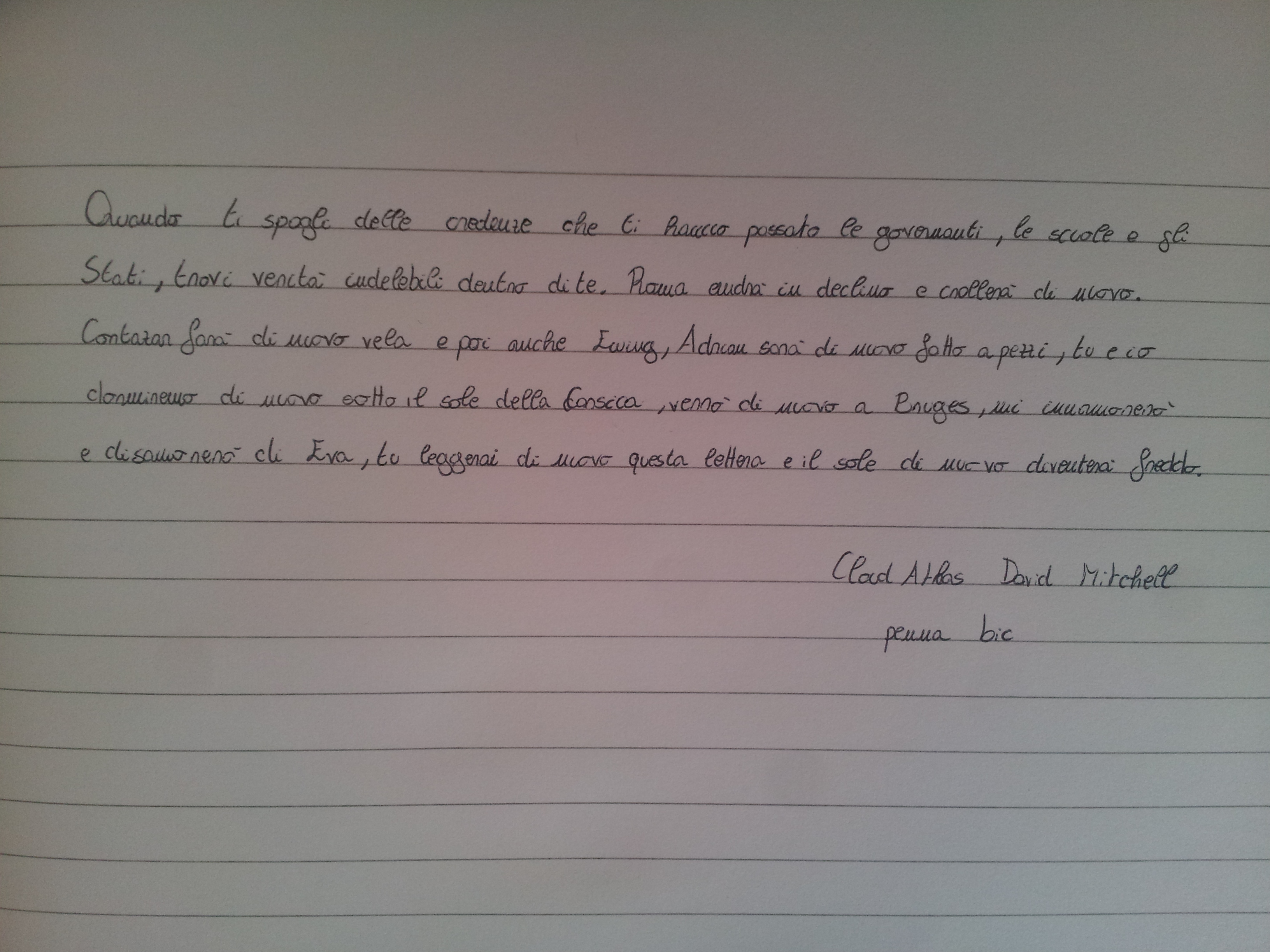 Grazie in anticipo vi allego una foto di come tengo la penna e un estratto (a penna bic) dal libro "Cloud Atlas" di David Mitchell per poter vedere la mia calligrafia.