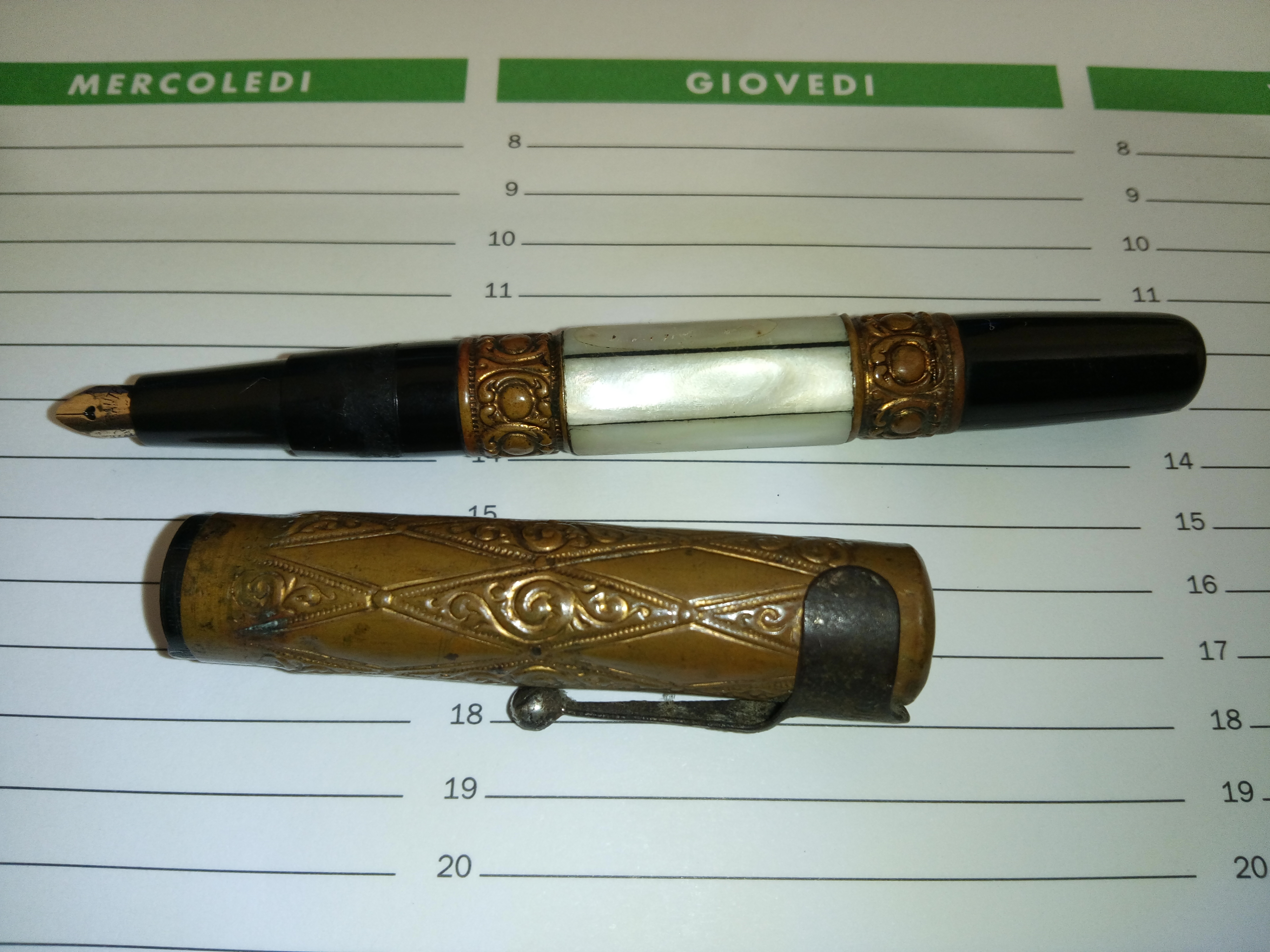 P.s.: sul cappuccio è stata inserita una "accommodation ;) clip". Di parti argentate non ce ne sono mai state: stando a quel che riesco a vedere dalle foto, sulla tua penna il cappuccio e i fascioni erano laminati oro. All'epoca i rivestimenti erano in oro massiccio, in lamina d'oro o in argento massiccio.