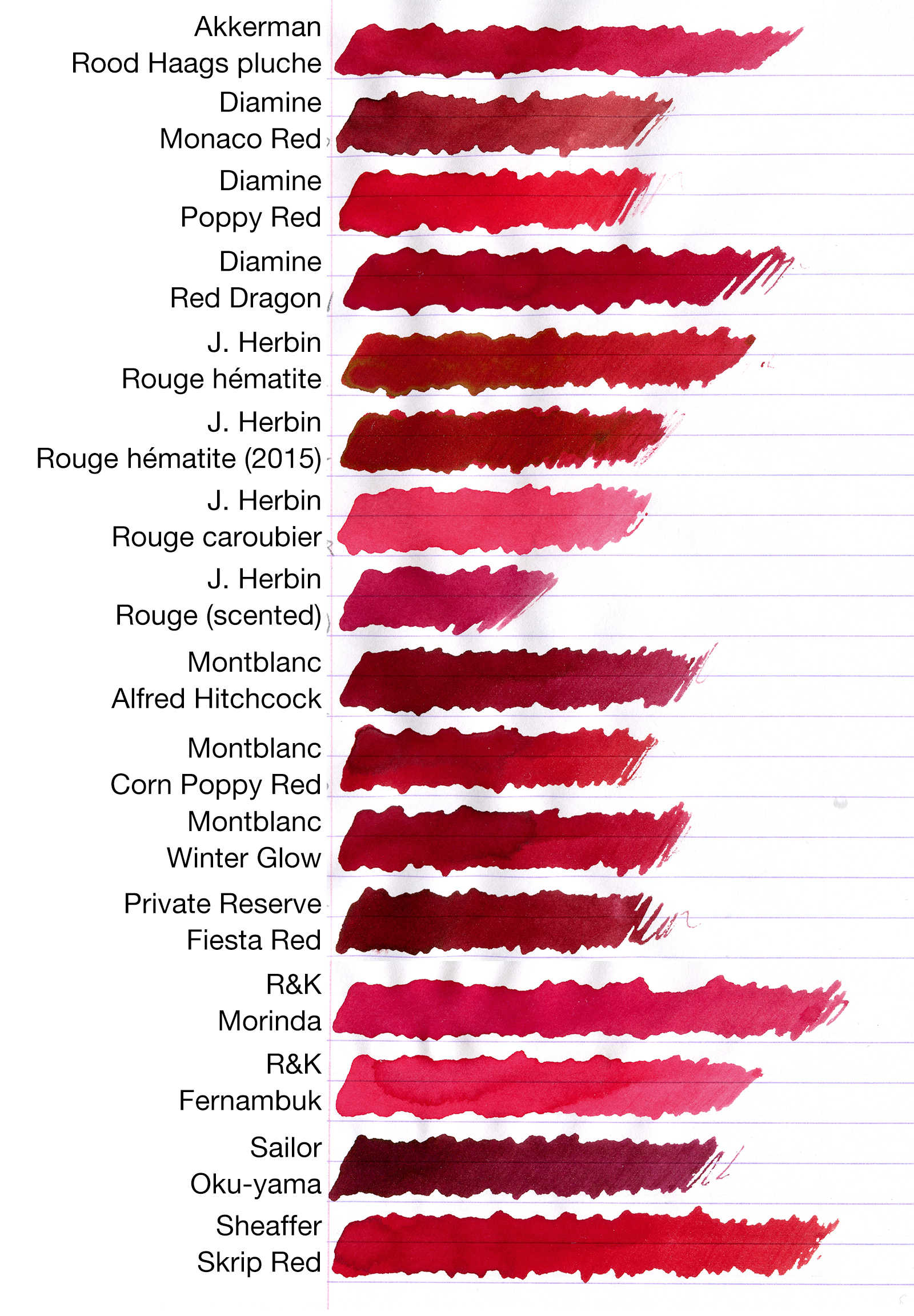 Di questo confronto, mi piacciono molto lo Skrip Red e il Diamine Poppy Red!