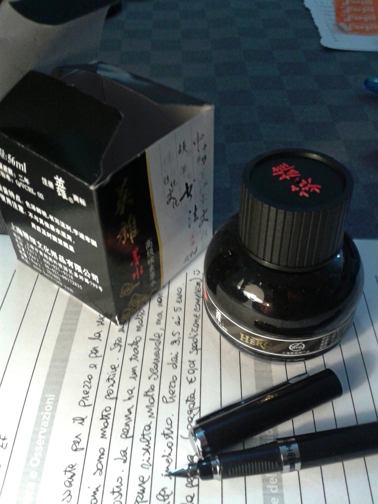 Anche se le mie penne sono tutte abbastanza economiche devo confessare che avevo un po di timore ad usarlo, quindi ho aspettato che arrivasse la penna ordinata apposta con funzione kamikaze: una Hero 9075 pagata la bellezza di € 0,01 spedizione compresa. In realtà l’inchiostro viene sconsigliato con penne dal tratto molto sottile e invece questa 9075 è veramente super fine. Ciò nonostante la scrittura è molto scorrevole. Non posso ancora affermare se il merito è dell’inchiostro o della penna.